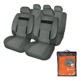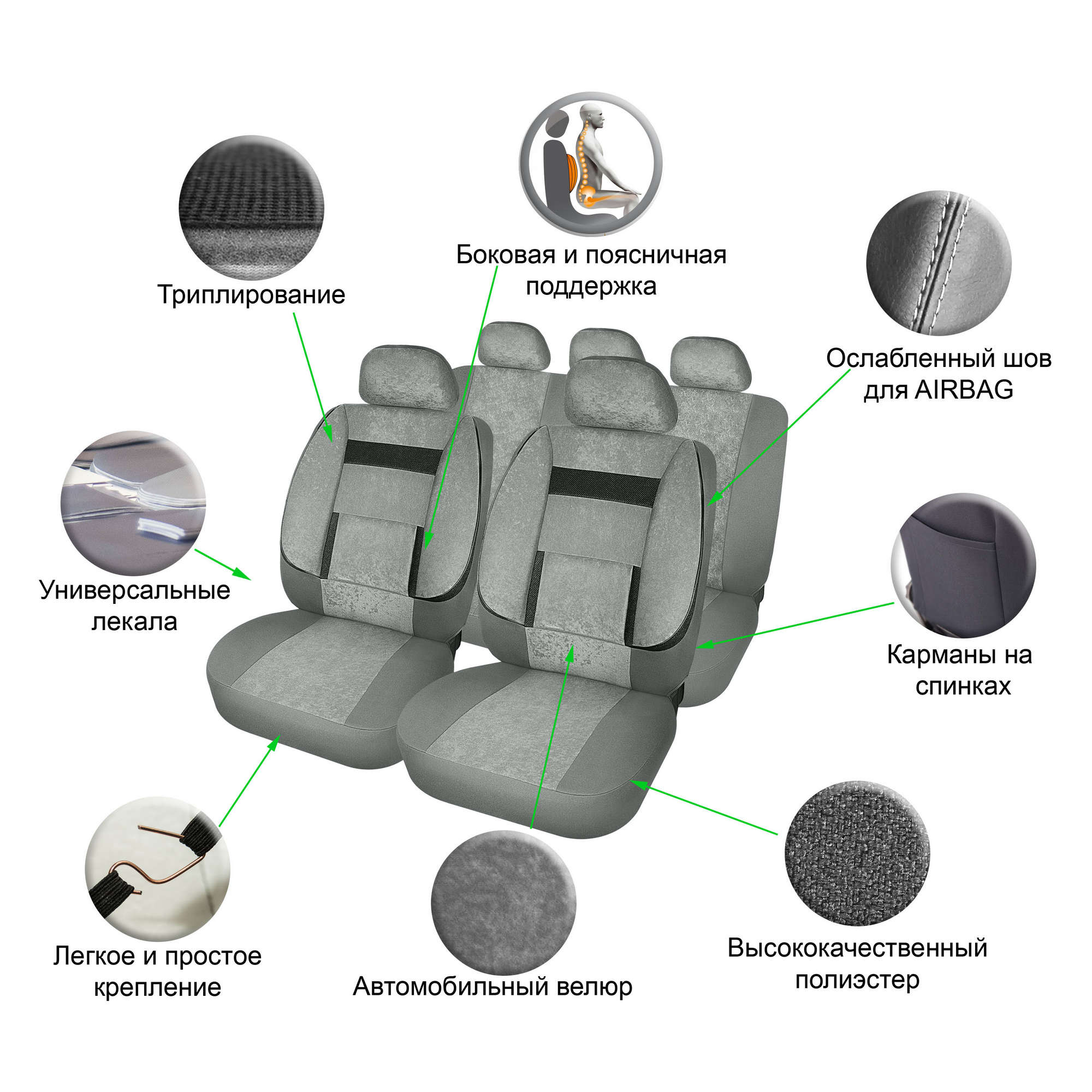 Комплект Чехлов повышенной комфортности предназначены для автомобильных сидений первого и второго ряда. Они помогут защитить обшивку сидений от механических повреждений и выцветания. Чехлы имеют универсальный размер и подходятна сиденья большинства легковых автомобилей. Передние чехлы дополнительно оснащены боковой поддержкой спины и упором для поясницы. Чехлы изготовлены из приятного на ощупь автомобильного велюра темно-серого цвета.