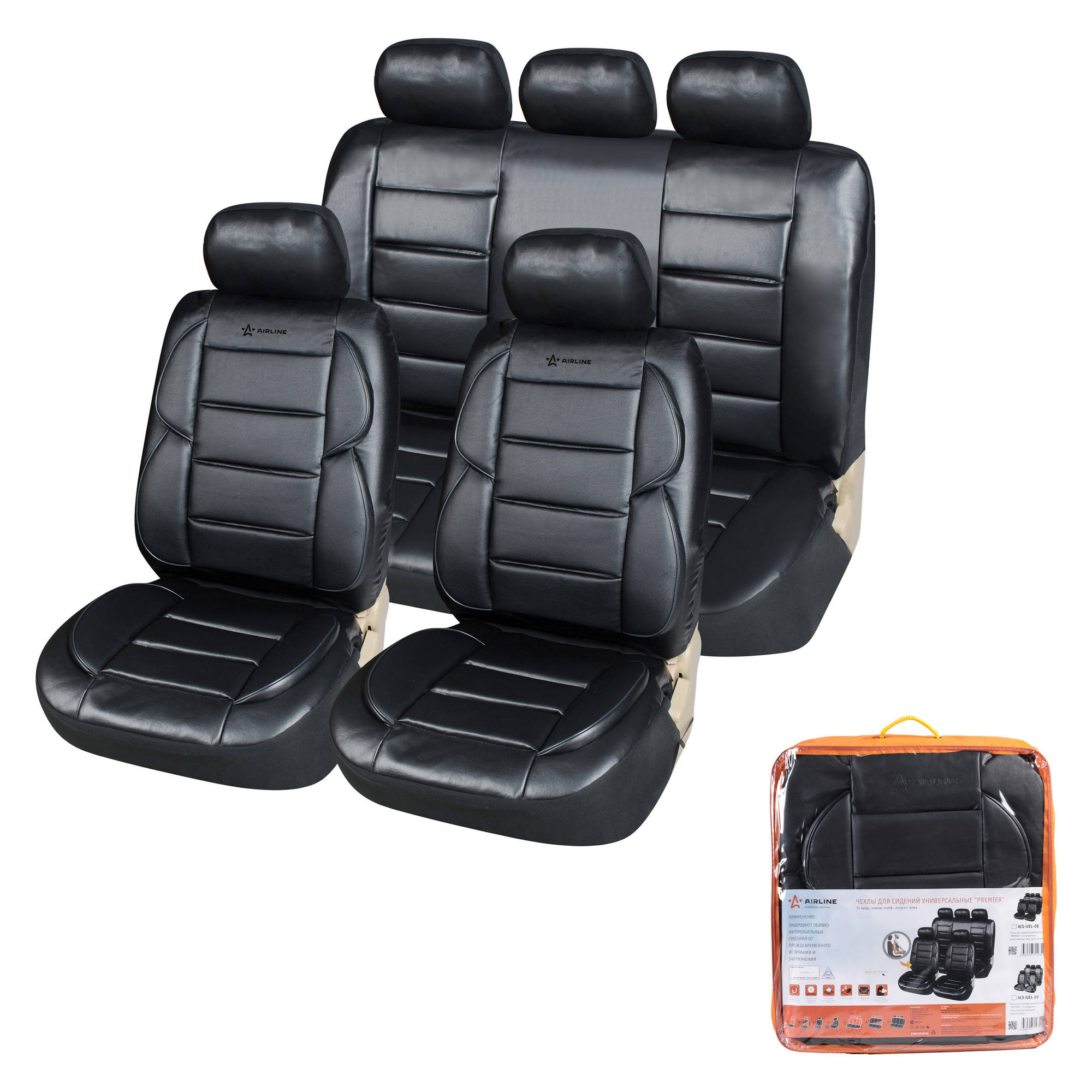 Предназначены для защиты штатной обивки сидений от механических повреждений, загрязнения и выцветания, а так же преображают внешний вид салона. Чехлы имеют универсальный размер и подходят на сиденья большинства легковых автомобилей. Модель сшита из износостойкой, высококачественной искусственной ПВХ кожи в сочетании с тянущимся гладким полиэстером, который обеспечивает хорошее прилегание к сиденьям. Чехлы имеют специальный ослабленный шов в месте расположения подушки безопасности для ее беспрепятственного открытия. Для облегчения монтажа подголовников в местах их крепления предусмотрены открывающиеся липучки. Передние чехлы для удобства дополнительно оснащены боковой поддержкой спины.