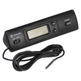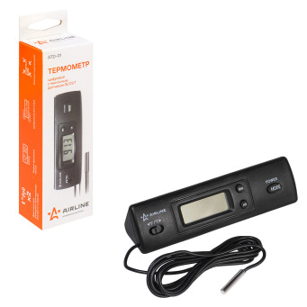 Представляет собой измерительный прибор температуры воздуха с внешим и внутреним датчиками. Выполнен в ппластиковом корпусе и оснащен ЖК дисплеем. Питание происходит от 1.5V батарейки. Термометр измеряет температуру воздуха внутри и с наружи автомобиля, гаража, дома или квартиры. Термометр AIRLINE послужит нужным дополнением к автомобилям не имеющих функцию измерения температуры воздуха.