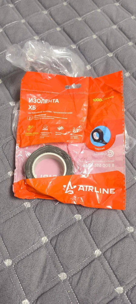 Изолента ХБ на тканевой основе, которая является расходным материалом и предназначена для обмотки проводов и кабелей с целью их электроизоляции. Изолента AIRLINE представляет собой прорезиненную хлопчатобумажную текстильную ленту, имеющую клейкую поверхность. Её диэлектрические и изоляционные свойства ограничены значением до 1000 вольт. Касательно практического использования: у данного вида изоляционной ленты, существует такое достоинство, как использование ее в очень жарких и горячих местах. При сильном нагреве она не плавиться, а коксуется, тем самым защищая от прямого замыкания оголённые участки проводов с другими токопроводящими частями.