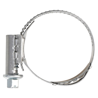 Соединительный элемент, применяемый для крепления и герметизации соединения шлангов, патрубков и других жёстких и гибких трубопроводов. По диаметру он может быть разным. Диаметр обязательно соотносится с размером диаметра трубы. Хомуты такого вида очень сложно разорвать или растянуть они устойчивы к любым механическим воздействиям, поэтому их часто используют при высоких нагрузках. Такой хомут можно использовать несколько раз при этом соединение не теряет своей герметичности. Хомуты состоят из ленты с зубчатой дорожкой, корпуса и специального винта для затяжки хомута. На ленте нет сквозных прорезей, что гарантирует целостность поверхности патрубка. Главной особенностью считается оснащение хомута пружиной в виде волны, которая автоматически натягивается для обеспечения оптимального радиального усилия зажима(самоподтягивание). Данный тип хомута является идеальным выбором для применений при экстремальных перепадах температуры (например, при наддувочном воздухе в турбине), при экстремально низких температурах или для удержания шлангов с тенденцией к «ползучести» так называемой релаксации (ослабления) шланга.