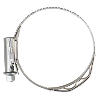 Соединительный элемент, применяемый для крепления и герметизации соединения шлангов, патрубков и других жёстких и гибких трубопроводов. По диаметру он может быть разным. Диаметр обязательно соотносится с размером диаметра трубы. Хомуты такого вида очень сложно разорвать или растянуть они устойчивы к любым механическим воздействиям, поэтому их часто используют при высоких нагрузках. Такой хомут можно использовать несколько раз при этом соединение не теряет своей герметичности. Хомуты состоят из ленты с зубчатой дорожкой, корпуса и специального винта для затяжки хомута. На ленте нет сквозных прорезей, что гарантирует целостность поверхности патрубка. Главной особенностью считается оснащение хомута пружиной в виде волны, которая автоматически натягивается для обеспечения оптимального радиального усилия зажима(самоподтягивание). Данный тип хомута является идеальным выбором для применений при экстремальных перепадах температуры (например, при наддувочном воздухе в турбине), при экстремально низких температурах или для удержания шлангов с тенденцией к «ползучести» так называемой релаксации (ослабления) шланга.