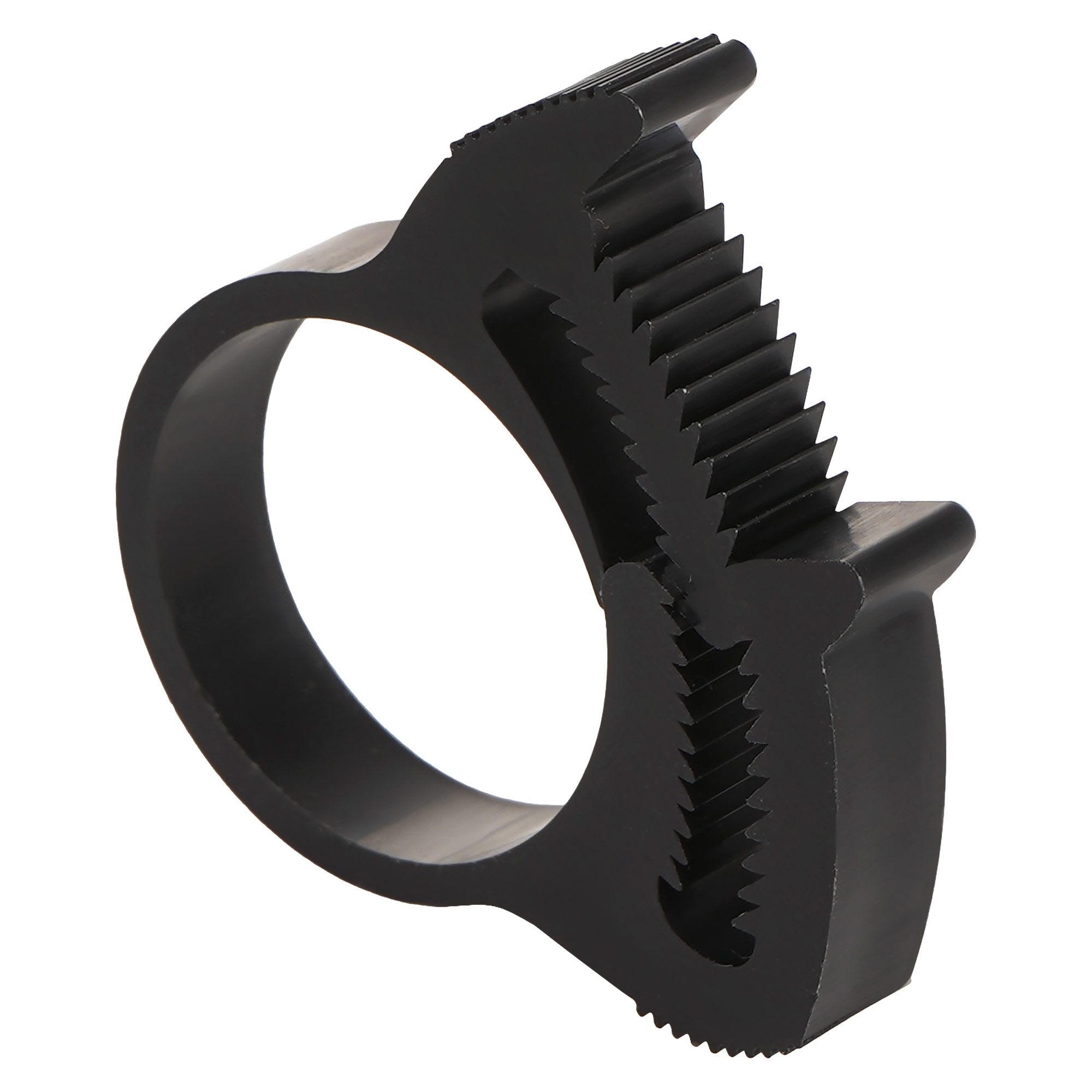Хомут силовой пластиковый для соединения элементов круглой формы выполнен в разных размерах из нейлона (полиамида) 66. Благодаря данной конструкции, предоставляется возможность быстрой и простой установки хомута на элементы круглой формы: шланги, трубы, патрубки, штуцера. Конструктив запорного устройства «Клип-Трек» обеспечивает прочность и надежность, обусловленную его уникальным двойным рядом зубьев в блокирующем замке. Двойной ряд зубьев позволяет создать наибольшую зажимную силу, по сравнению с подобными изделиями с однорядным устройством замка. Дополнительные выступы-упоры, расположенные на верхних поверхностях частей запорного механизма, помогают разъединять хомут без использования специального дополнительного инструмента, делают хомут универсальным и многоразовым для использования. *При максимальном смыкании замка хомута, для его разъединения, возможно, понадобиться инструмент в виде отвертки, чтоб сместить центральный зубчатый шток по отношению к зубчатому пазу в сторону. Материал Полиамид 66: - Это максимальная долгосрочная температура воздействия 132С, пиковая температура 170 С. Данный материал доказал свою механическую прочность, жесткость и термическую стабильность. Этот материал становится более твердым при низких температурах, обладает высокими фрикционными свойствами, является незаменимым почти во всех областях для производства широкого ассортимента компонентов и деталей машин, а так же в качестве высококачественных электроизоляционных материалов и многих специальных применений. Используется, где электрические применения, требуют 600 В или менее, и частоты 400 Гц или ниже.