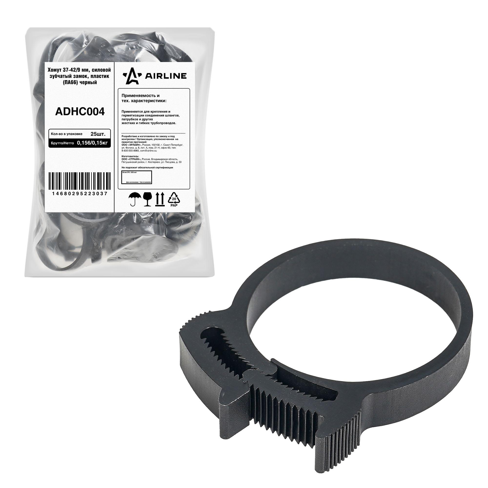Хомут силовой пластиковый для соединения элементов круглой формы выполнен в разных размерах из нейлона (полиамида) 66. Благодаря данной конструкции, предоставляется возможность быстрой и простой установки хомута на элементы круглой формы: шланги, трубы, патрубки, штуцера. Конструктив запорного устройства «Клип-Трек» обеспечивает прочность и надежность, обусловленную его уникальным двойным рядом зубьев в блокирующем замке. Двойной ряд зубьев позволяет создать наибольшую зажимную силу, по сравнению с подобными изделиями с однорядным устройством замка. Дополнительные выступы-упоры, расположенные на верхних поверхностях частей запорного механизма, помогают разъединять хомут без использования специального дополнительного инструмента, делают хомут универсальным и многоразовым для использования. *При максимальном смыкании замка хомута, для его разъединения, возможно, понадобиться инструмент в виде отвертки, чтоб сместить центральный зубчатый шток по отношению к зубчатому пазу в сторону. Материал Полиамид 66: - Это максимальная долгосрочная температура воздействия 132С, пиковая температура 170 С. Данный материал доказал свою механическую прочность, жесткость и термическую стабильность. Этот материал становится более твердым при низких температурах, обладает высокими фрикционными свойствами, является незаменимым почти во всех областях для производства широкого ассортимента компонентов и деталей машин, а так же в качестве высококачественных электроизоляционных материалов и многих специальных применений. Используется где электрические применения, требуют 600 В или менее, и частоты 400 Гц или ниже.
