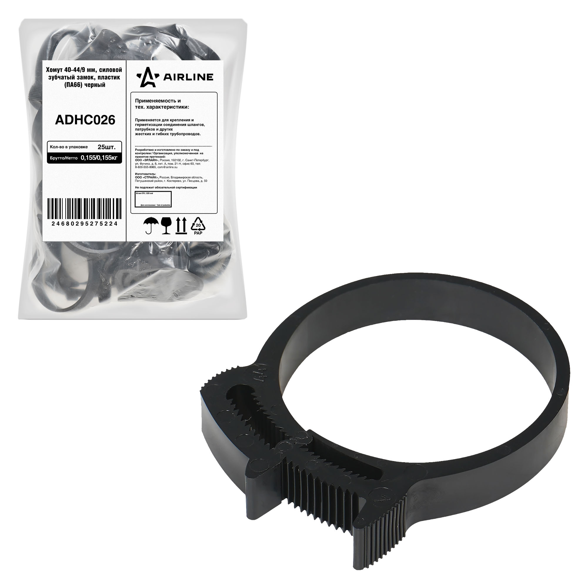 Хомут силовой пластиковый для соединения элементов круглой формы выполнен в разных размерах из нейлона (полиамида) 66. Благодаря данной конструкции, предоставляется возможность быстрой и простой установки хомута на элементы круглой формы: шланги, трубы, патрубки, штуцера. Конструктив запорного устройства «Клип-Трек» обеспечивает прочность и надежность, обусловленную его уникальным двойным рядом зубьев в блокирующем замке. Двойной ряд зубьев позволяет создать наибольшую зажимную силу, по сравнению с подобными изделиями с однорядным устройством замка. Дополнительные выступы-упоры, расположенные на верхних поверхностях частей запорного механизма, помогают разъединять хомут без использования специального дополнительного инструмента, делают хомут универсальным и многоразовым для использования. *При максимальном смыкании замка хомута, для его разъединения, возможно, понадобиться инструмент в виде отвертки, чтоб сместить центральный зубчатый шток по отношению к зубчатому пазу в сторону. Материал Полиамид 66: - Это максимальная долгосрочная температура воздействия 132С, пиковая температура 170 С. Данный материал доказал свою механическую прочность, жесткость и термическую стабильность. Этот материал становится более твердым при низких температурах, обладает высокими фрикционными свойствами, является незаменимым почти во всех областях для производства широкого ассортимента компонентов и деталей машин, а так же в качестве высококачественных электроизоляционных материалов и многих специальных применений. Используется- где электрические применения, требуют 600 В или менее, и частоты 400 Гц или ниже.