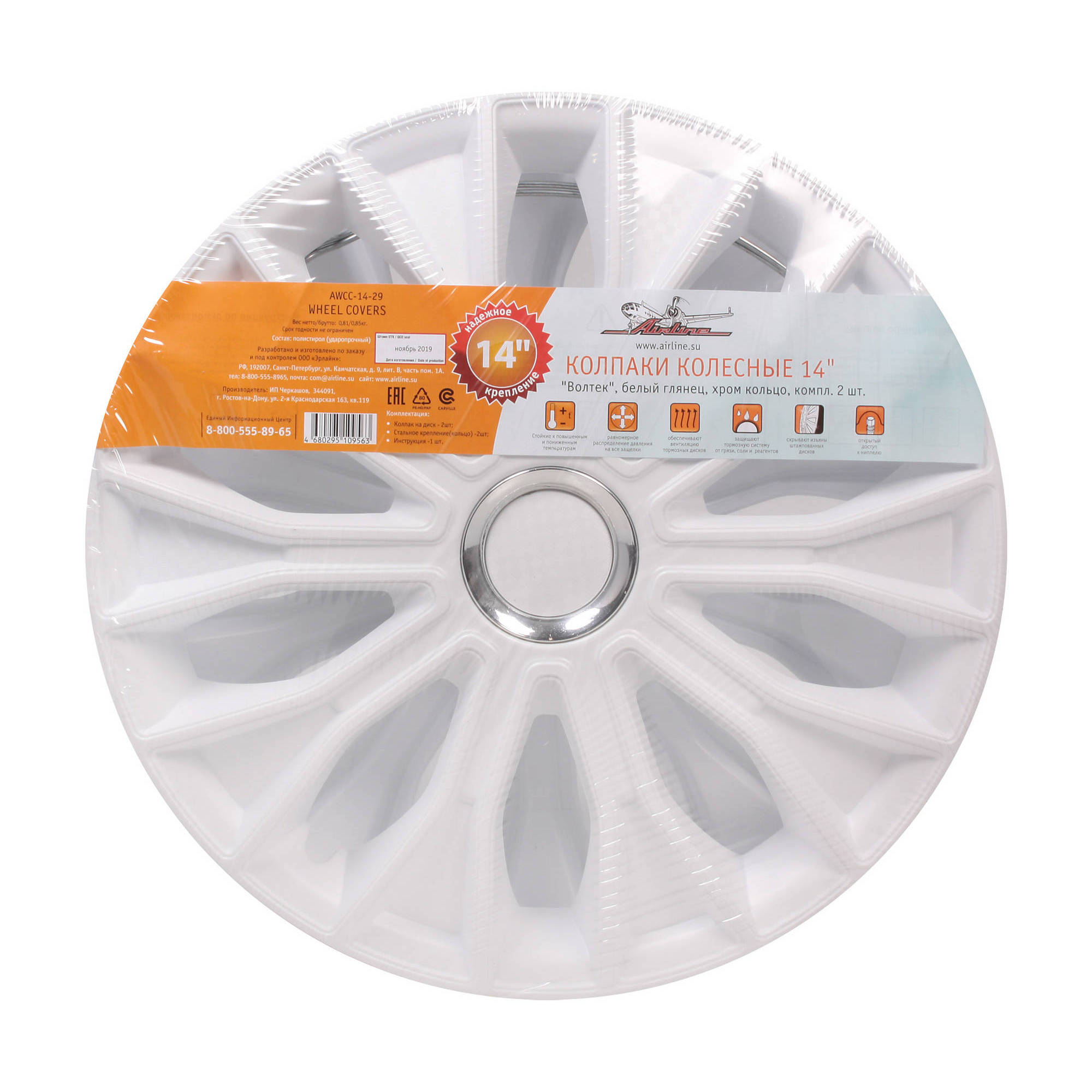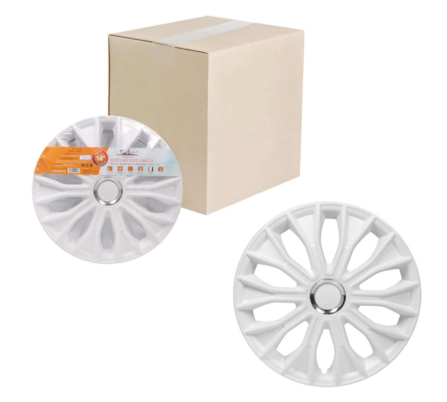 Колпаки колесные 14" "Волтек", белый глянец, хром кольцо, компл. 2 шт.