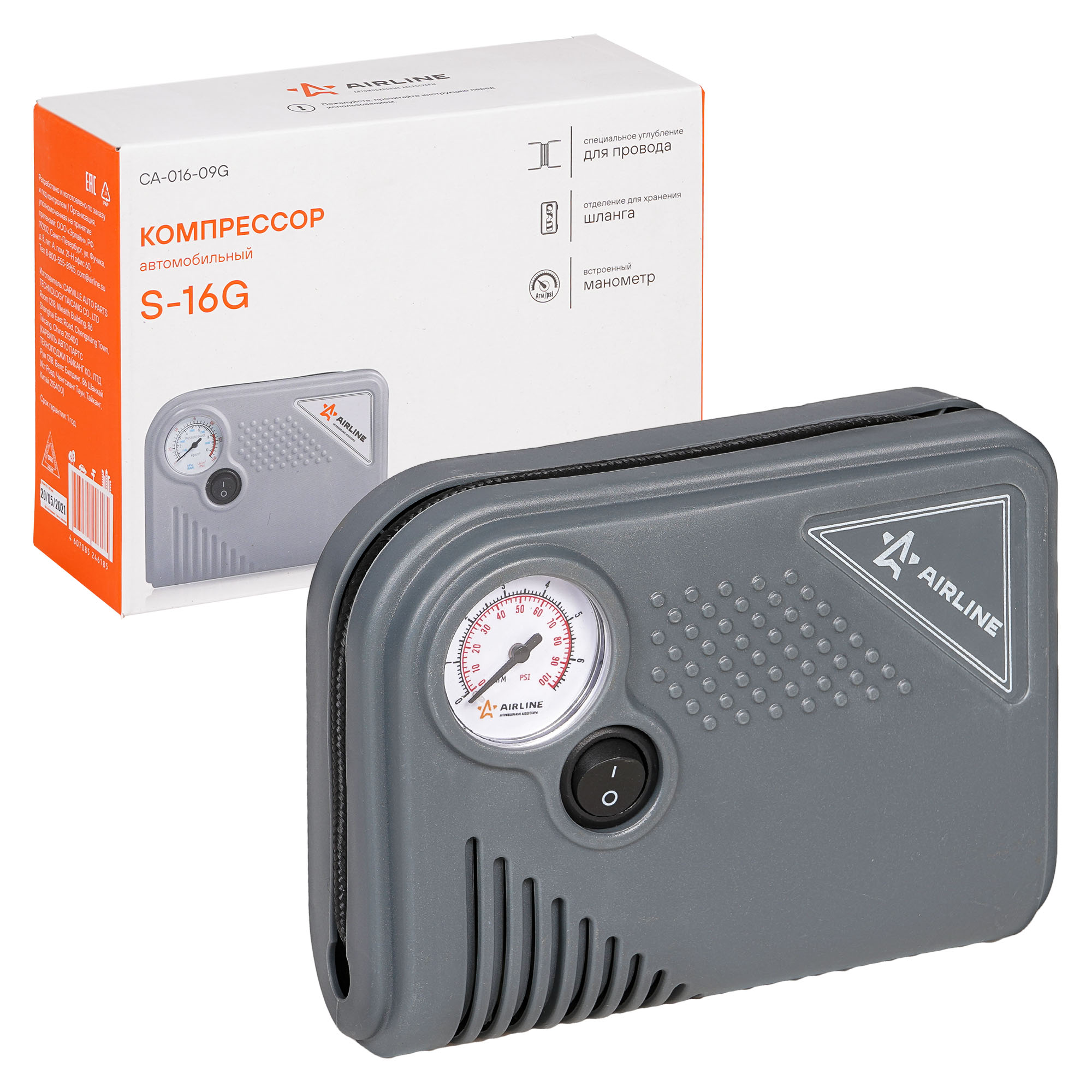 Автомобильный компрессор предназначен для получения сжатого воздуха в дорожных условиях. Компрессор модели S-16 G обладает компактными размерами и производительностью до 20 л/мин с максимальным давлением 8 Атм (кг/см2). В данном компрессоре используется конструкция с плавающим шатуном, что увеличивает ресурс работы в 2-3 раза, по сравнению с более мощными "металлическими компрессорами". Время накачивания полностью спущенного колеса R14 до 2 Атм не превысит 6 минут. Провод и шланг компрессора удобно прячутся в корпус изделия.
