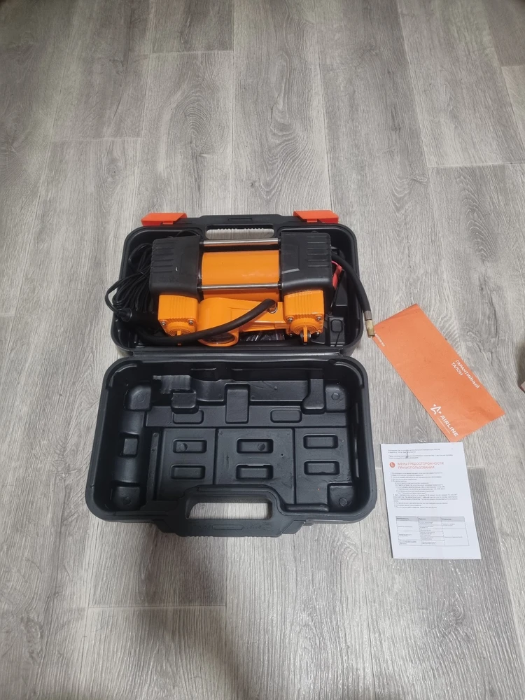 Компрессор пришёл хорошо упакован. Чемоданчик не хлипкий. Сам компрессор тяжеленький, выглядит добротно. Есть переходник от аккумулятора качать колеса. Рекомендую к покупке.