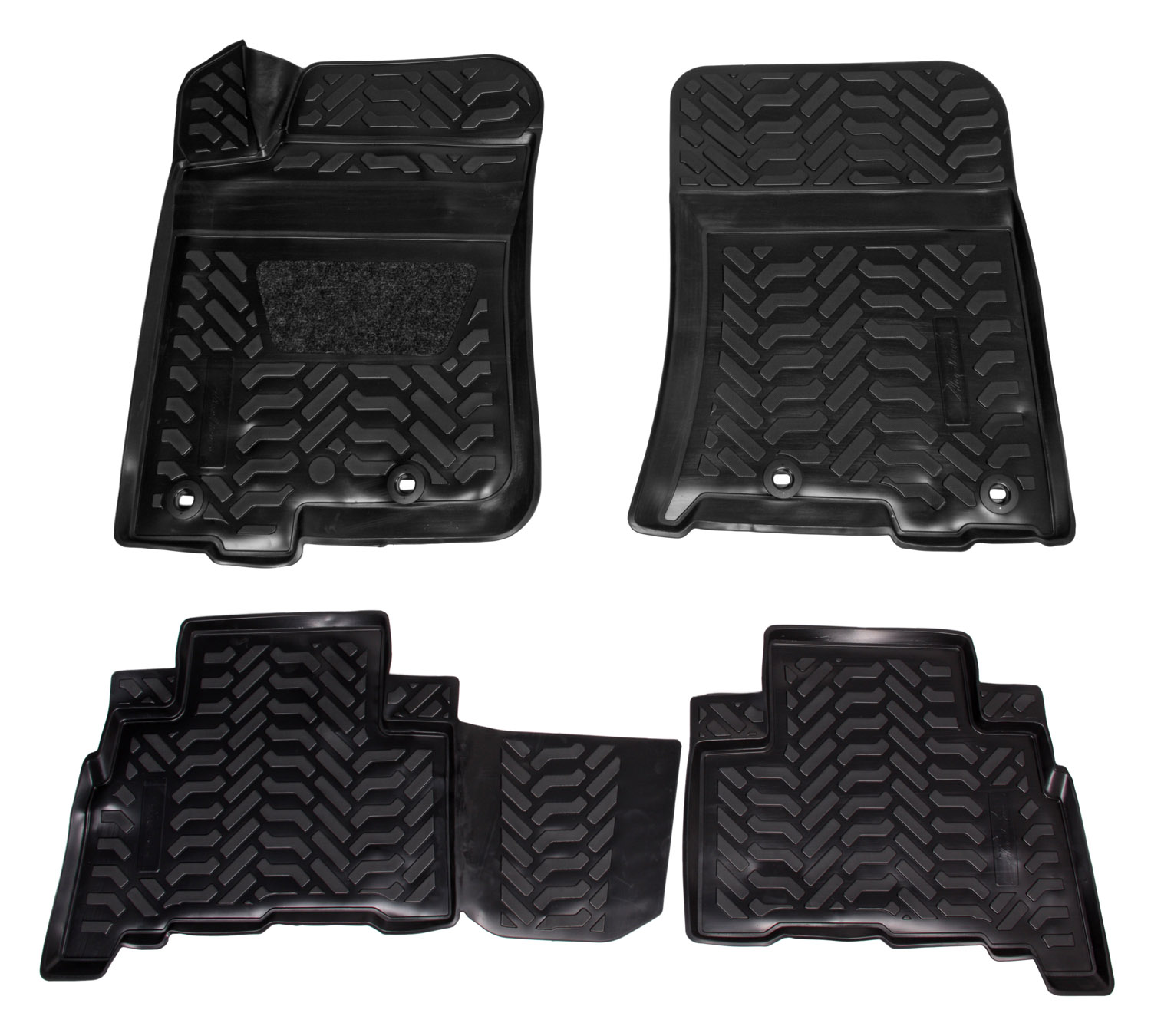 Ковры изготовлены из современного полимера ТЭП, который не теряет эластичность и сохраняет форму при пониженных и повышенных температурах. Ковры идеально повторяют форму пола выбранного автомобиля за счет снятия его индивидуальных размеров 3D сканером. Ковры имеют современный рисунок имитирующий протектор шин. У большинства моделей водительский коврик имеет ворсовый подпятник для предотвращения соскальзывания ноги, а так же оснащены крепежом для крепления их в штатных местах. Ковры преображают вид салона автомобиля и защищают напольный ковролин от истирания, намокания и загрязнений на долгое время. Преимущества ковров: эластичный материал стойкие к повышенным и пониженным температурам (- 40/+ 65 ?С) идеально повторяют форму пола авто(3D сканирование) не имеют неприятного запахавысокие бортикимодный дизайн