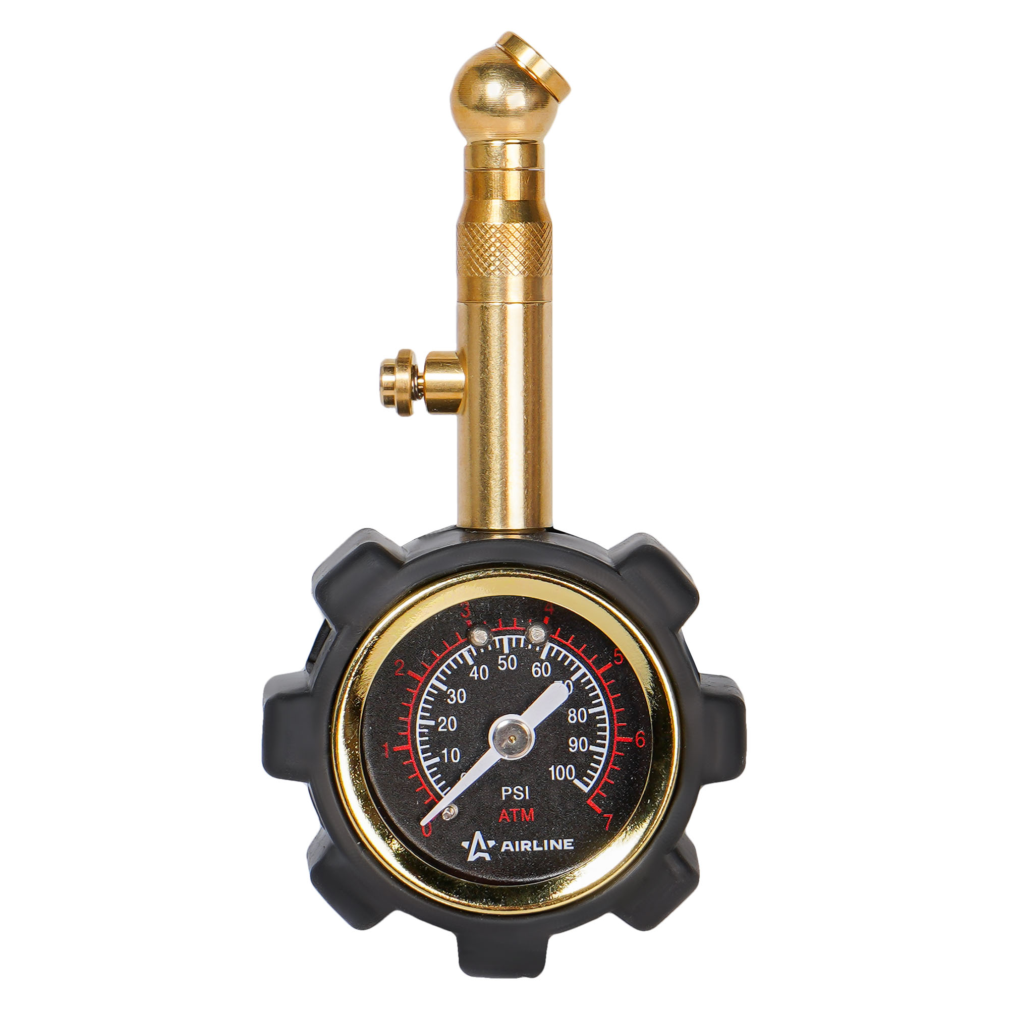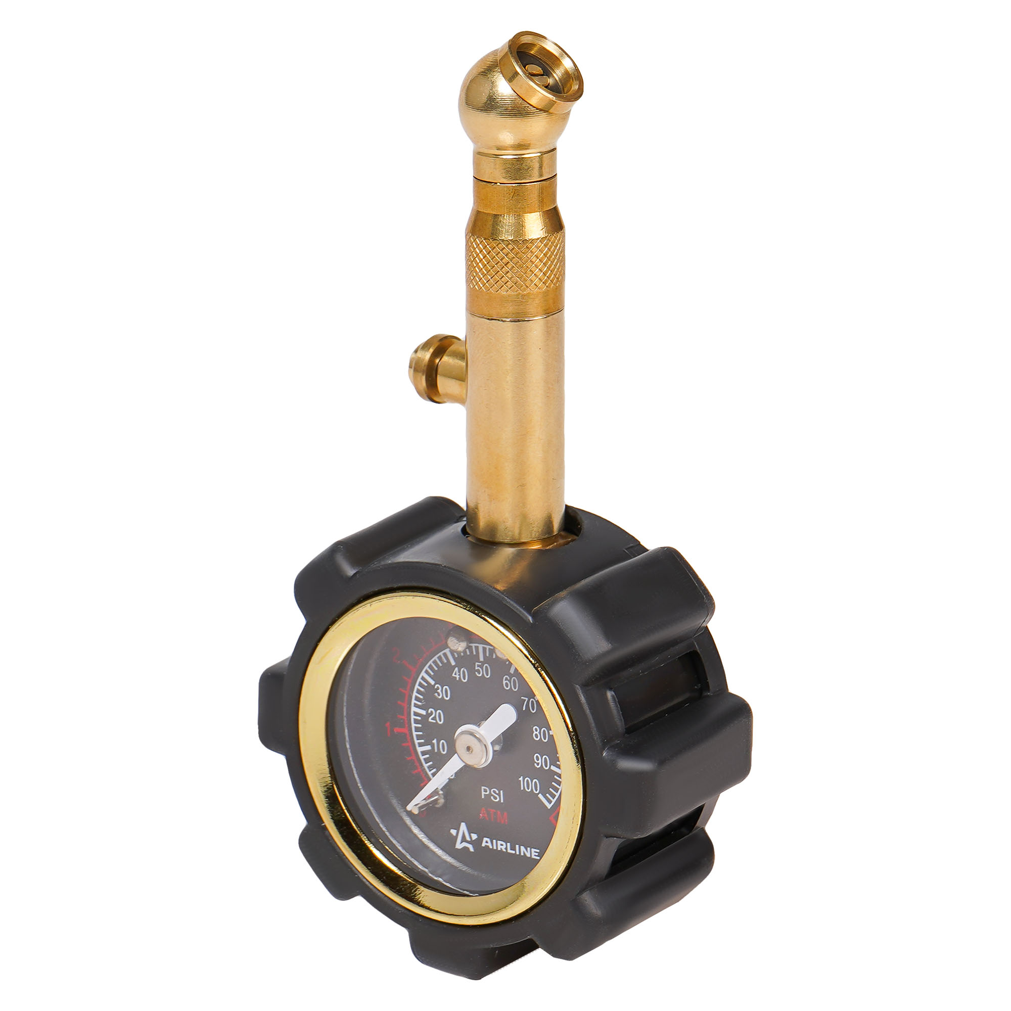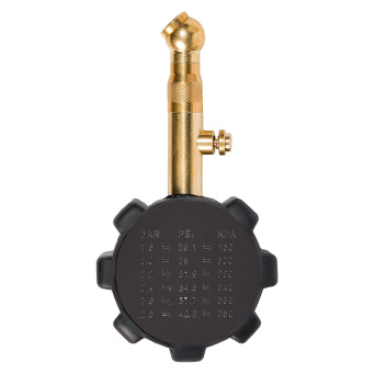 Устройство для измерения давления в шинах автомобиля. Манометр имеет прочный металлический корпус, защищённый резиновым чехлом.