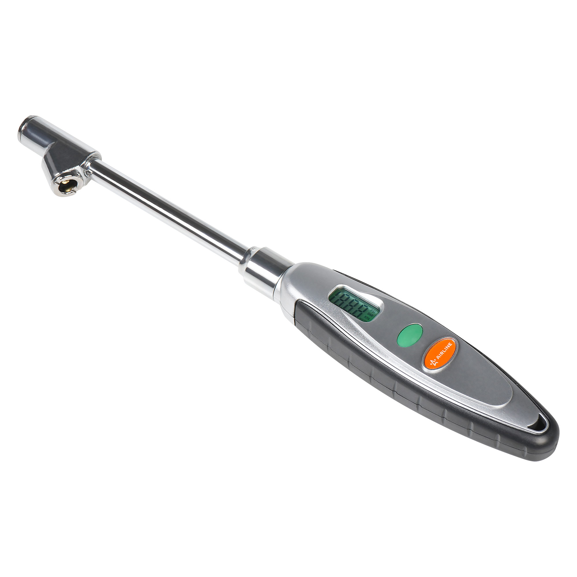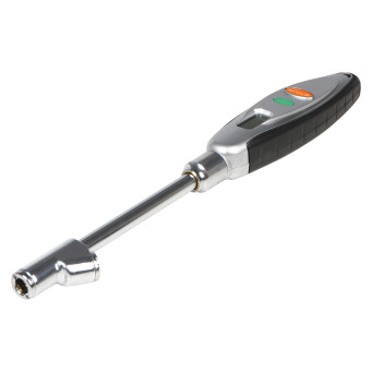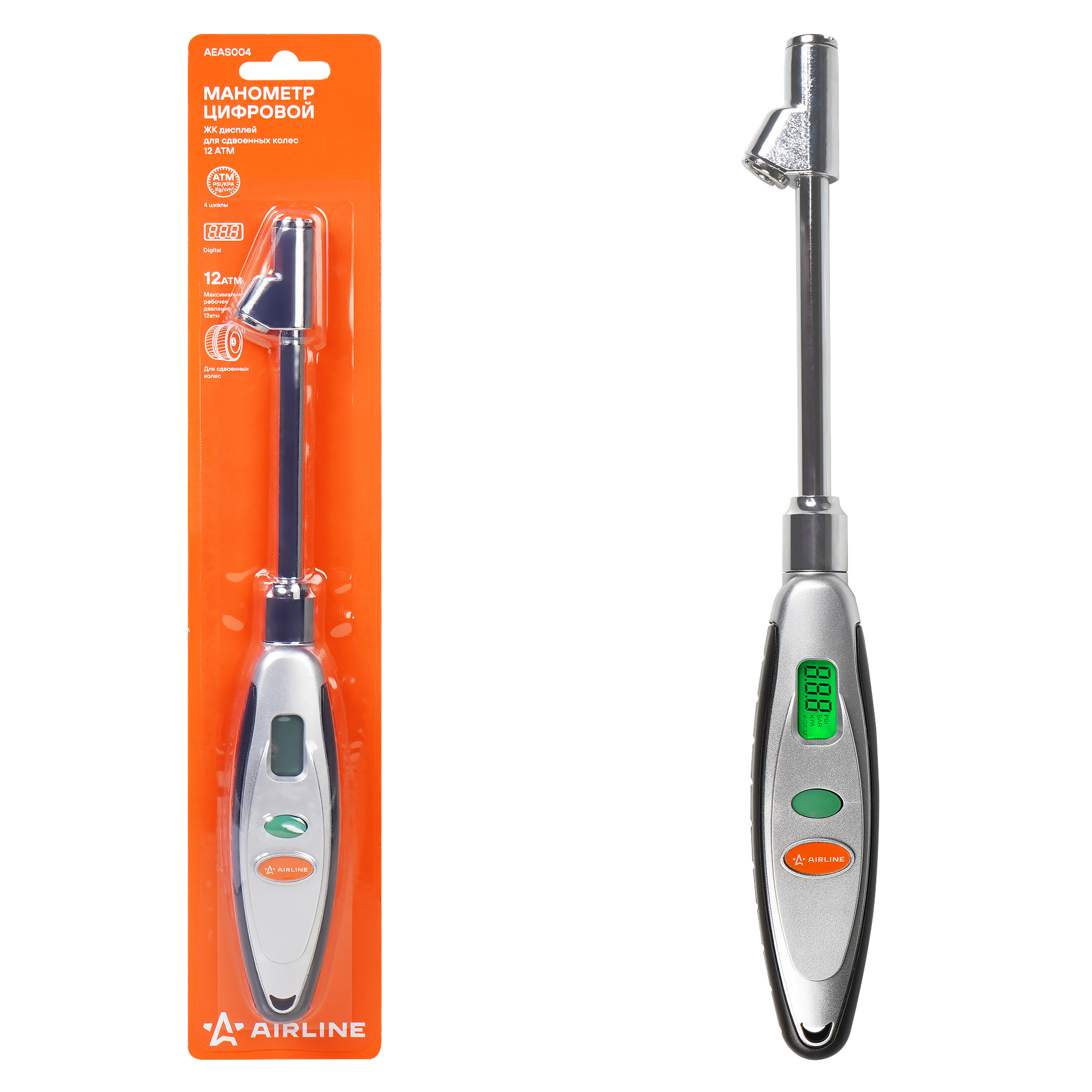Устройство для измерения давления в спаренных колесах автомобиля. Благодаря своей конструкции манометром удобно пользоваться как для внутренних, так и для внешних колес. Манометр имеет лёгкий и прочный пластиковый корпус. Жидкокристаллический дисплей отображает измеренные показания в четырёх единицах измерения. Выбрать нужные единицы измерения можно во время работы, путём нажатия на кнопку. Подсветка дисплея позволит проводить измерения даже в тёмное время суток. Функция автоматического отключения питания обеспечивает долгий срок службы до замены элемента питания. Питание осуществляется за счет 4 батареек LR44
