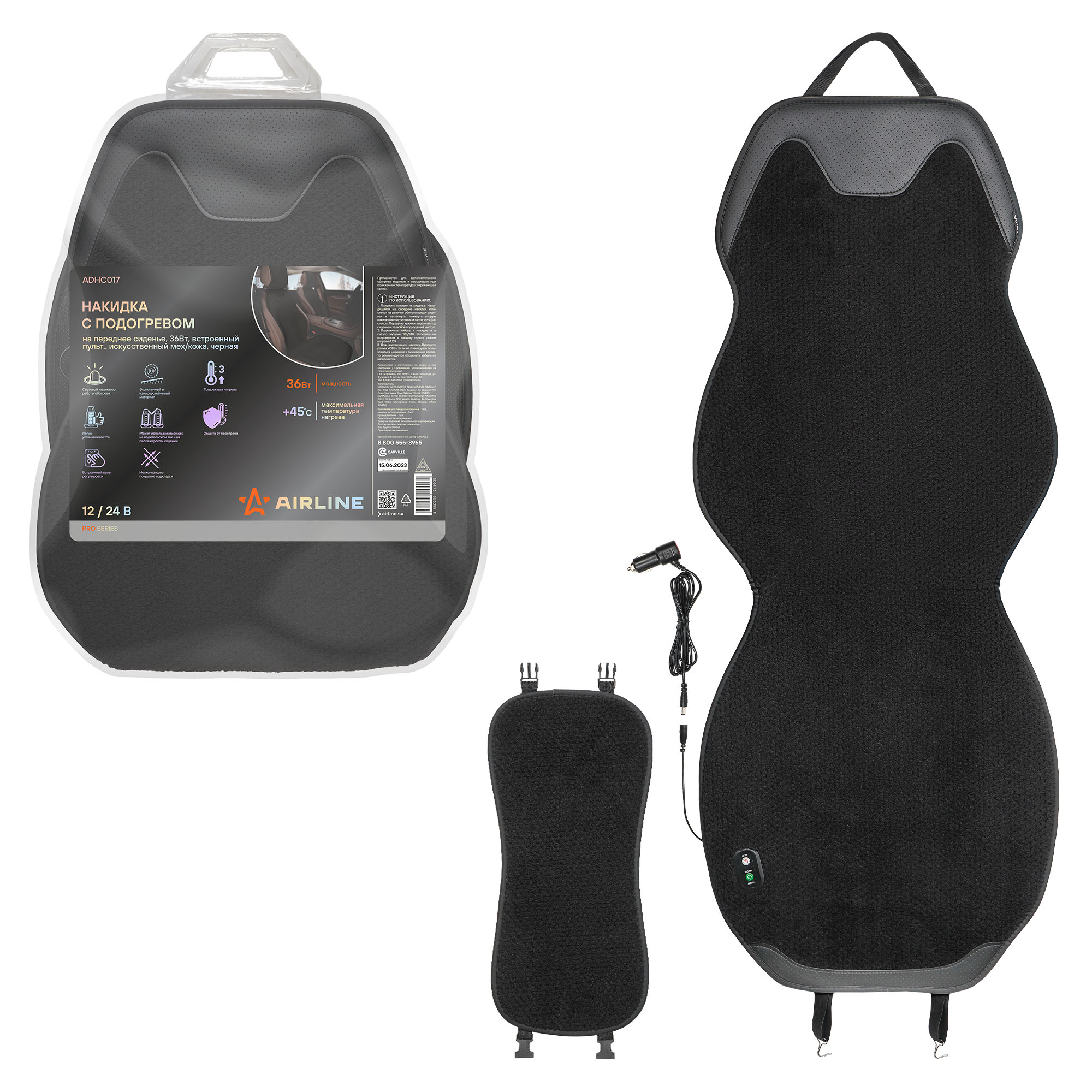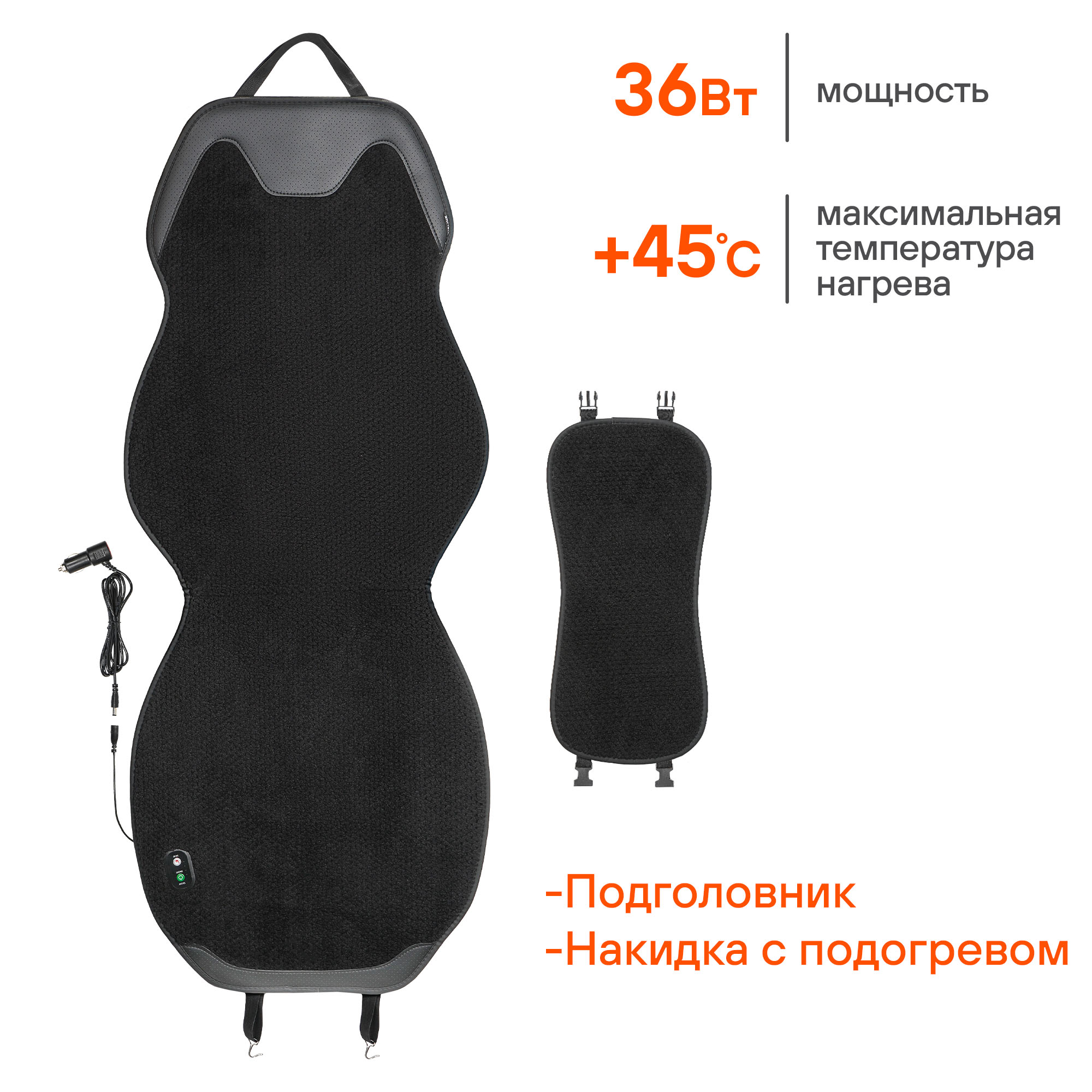 Накидка имеет универсальную форму сидушки со спинкой и устанавливается непосредственно на любое переднее сиденье. На подкладочной стороне имеется противоскользящие силиконовое покрытие. В комплект входит подголовник и отсоединяемый провод питания.