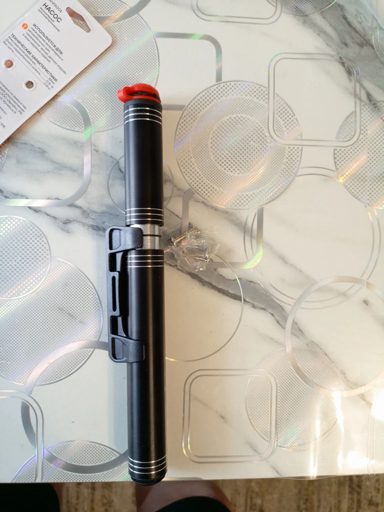 Компактный насос с креплением к раме велосипеда. Подходит для автомобильных (Schrader) и велосипедных (Presta) ниппелей. Шланг спрятан в ручке под красной крышкой, для извлечения из места хранения, необходимо выкрутить его.