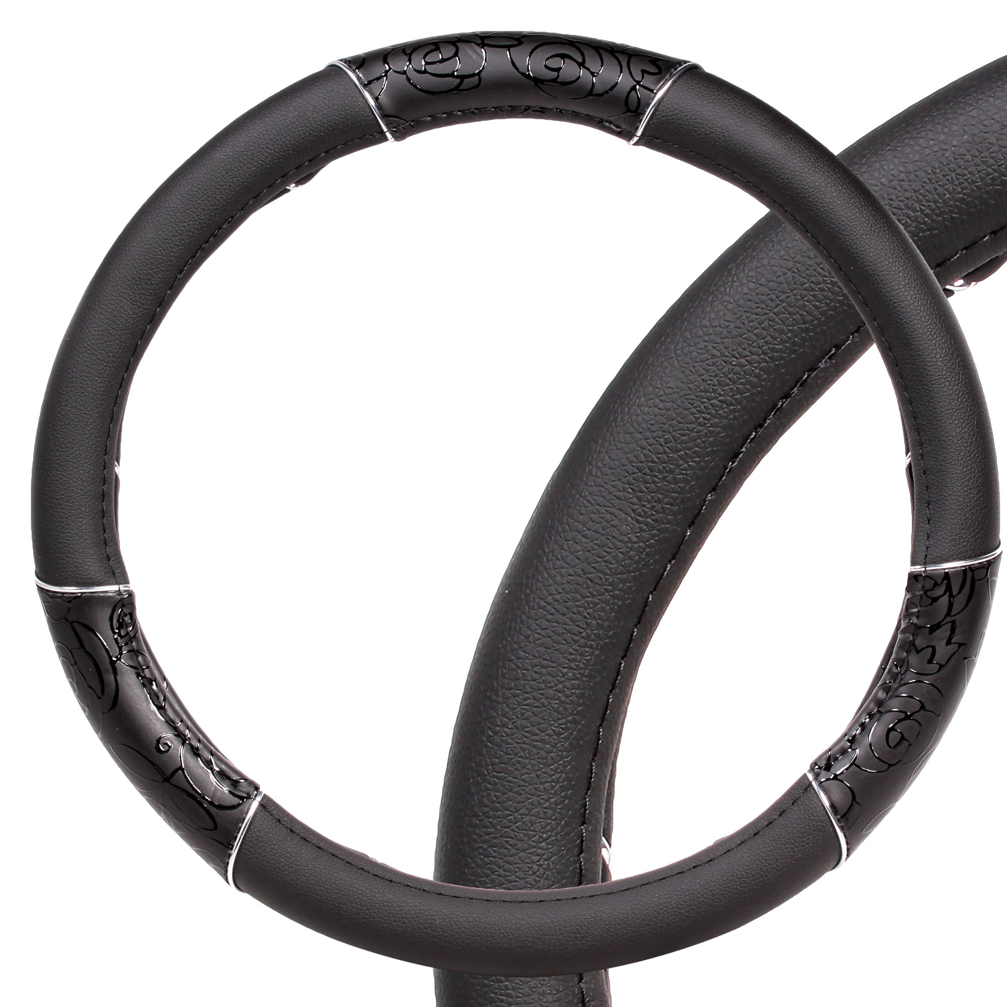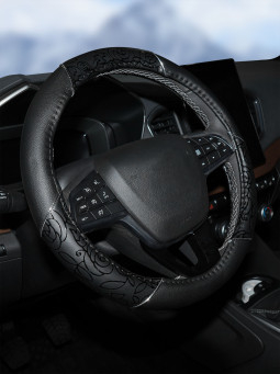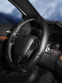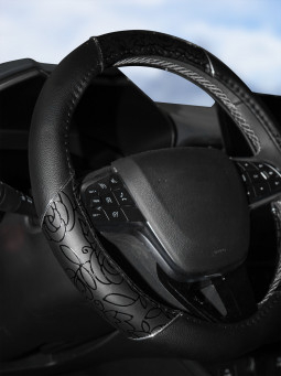 Модель оплетки для руля автомобиля разработана дизайнерами AIRLINE специально для женщин. Она имеет черный цвет, диаметр 40 см, а также стильные лаковые вставки с оригинальным принтом. Оплетка способствует увеличению комфорта при управлении транспортным средством, а также играет роль стильного автомобильного аксессуара.