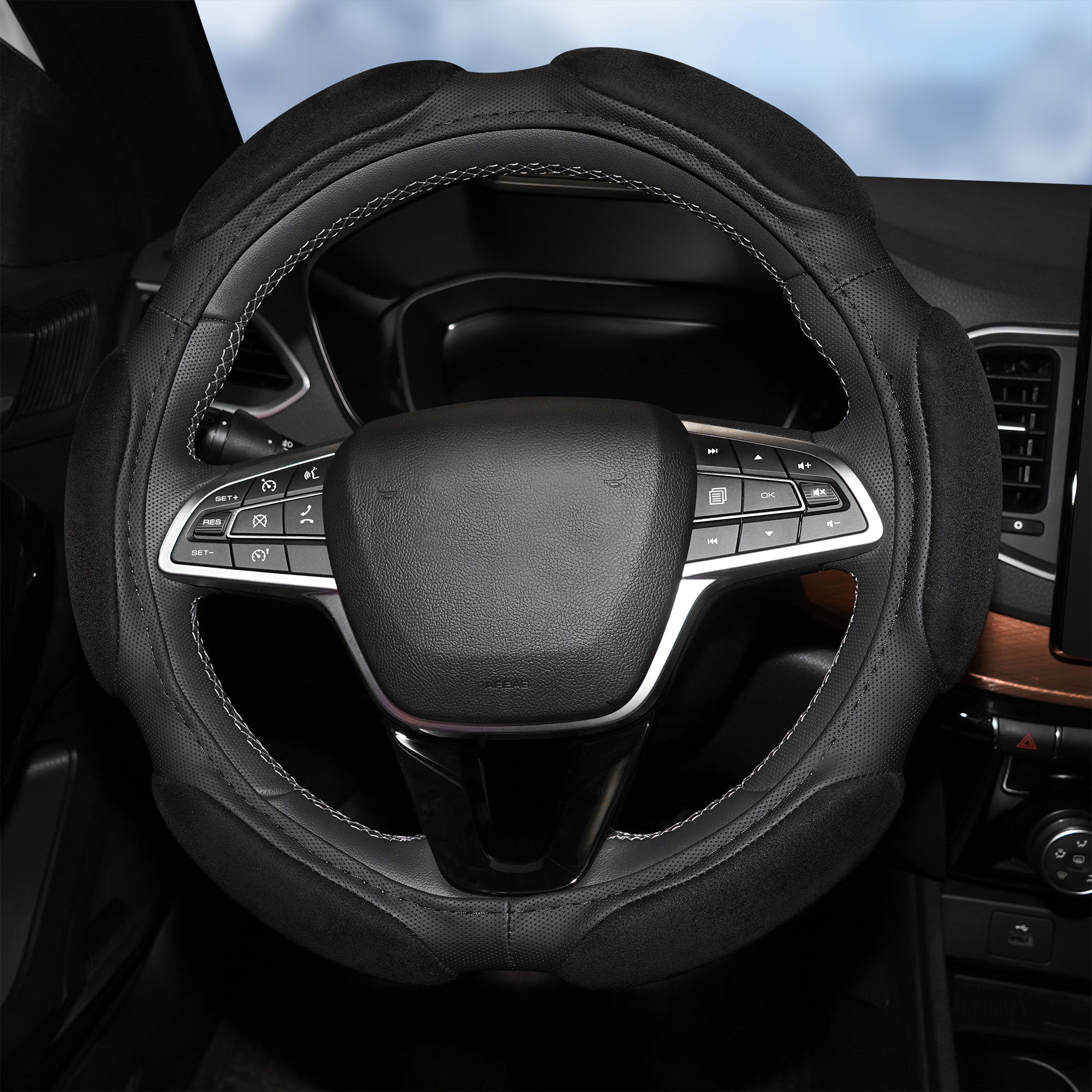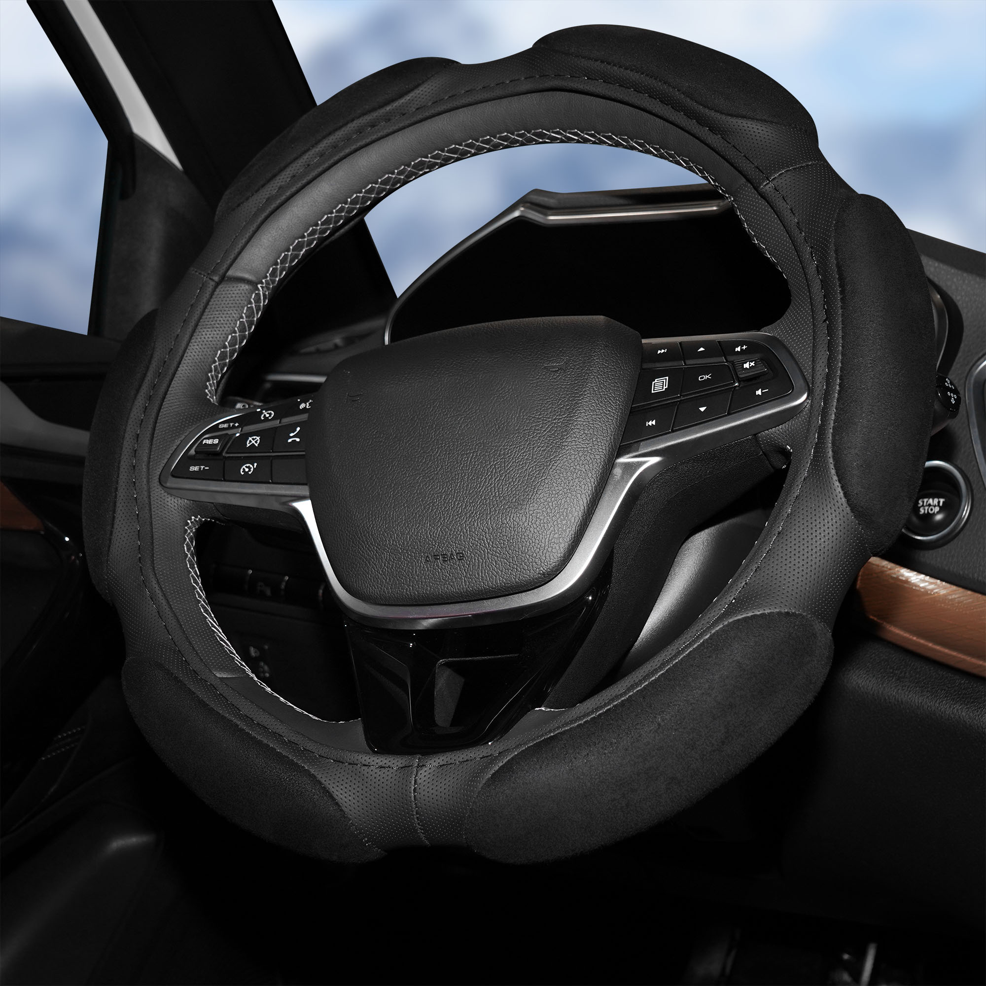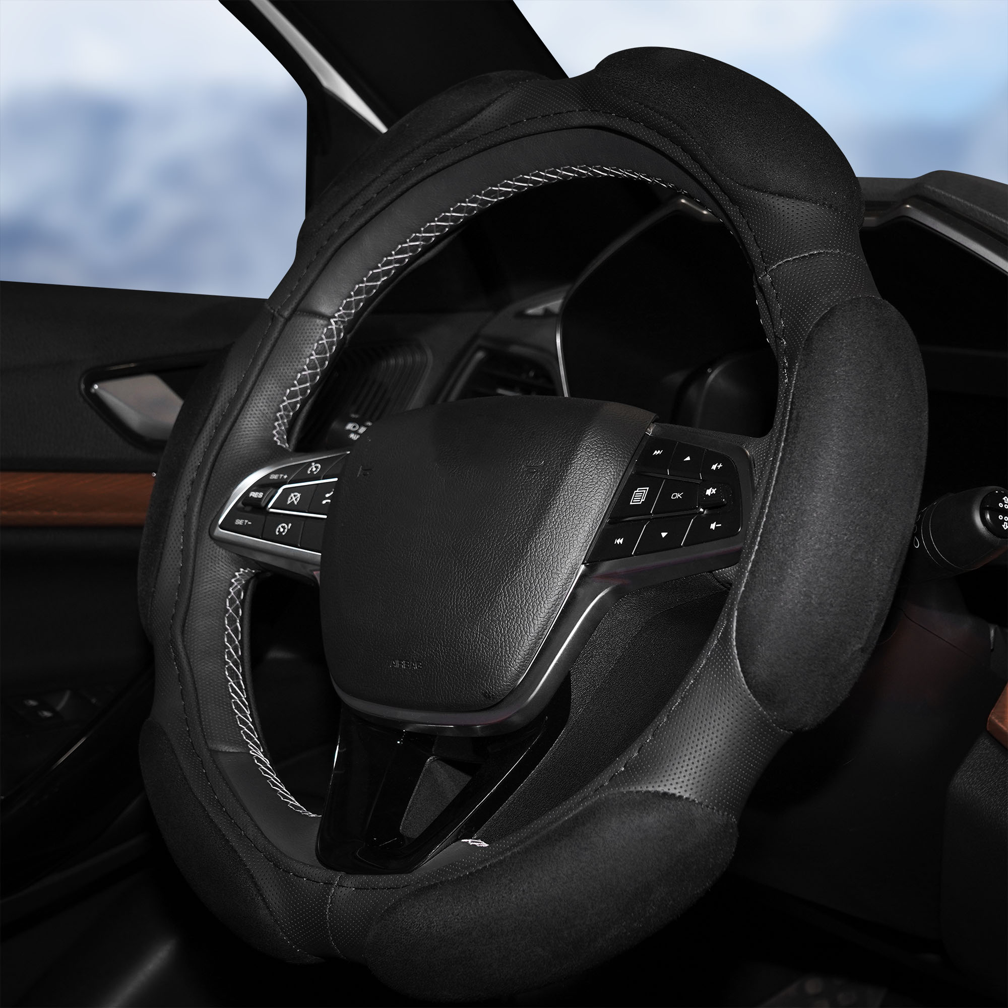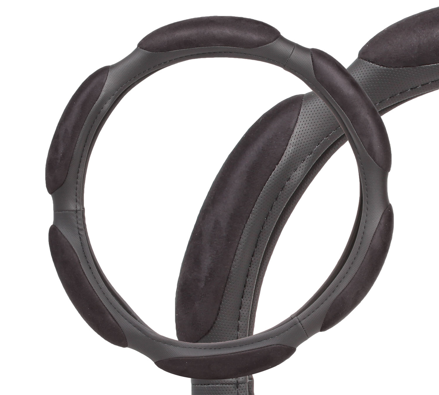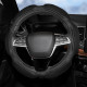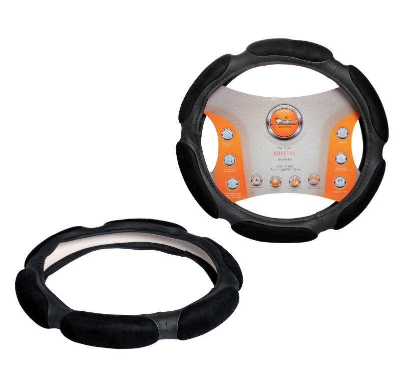 Оплетка черного цвета из спонжа размера М имеет диаметр 38 см. Оплетка легко устанавливается на руль из-за эластичных свойств спонжа. Основная расцветка изделия черная. Оплетка не вызывает трудностей при эксплуатации, т.к. обладает водоотталкивающими свойствами и легко чистится.