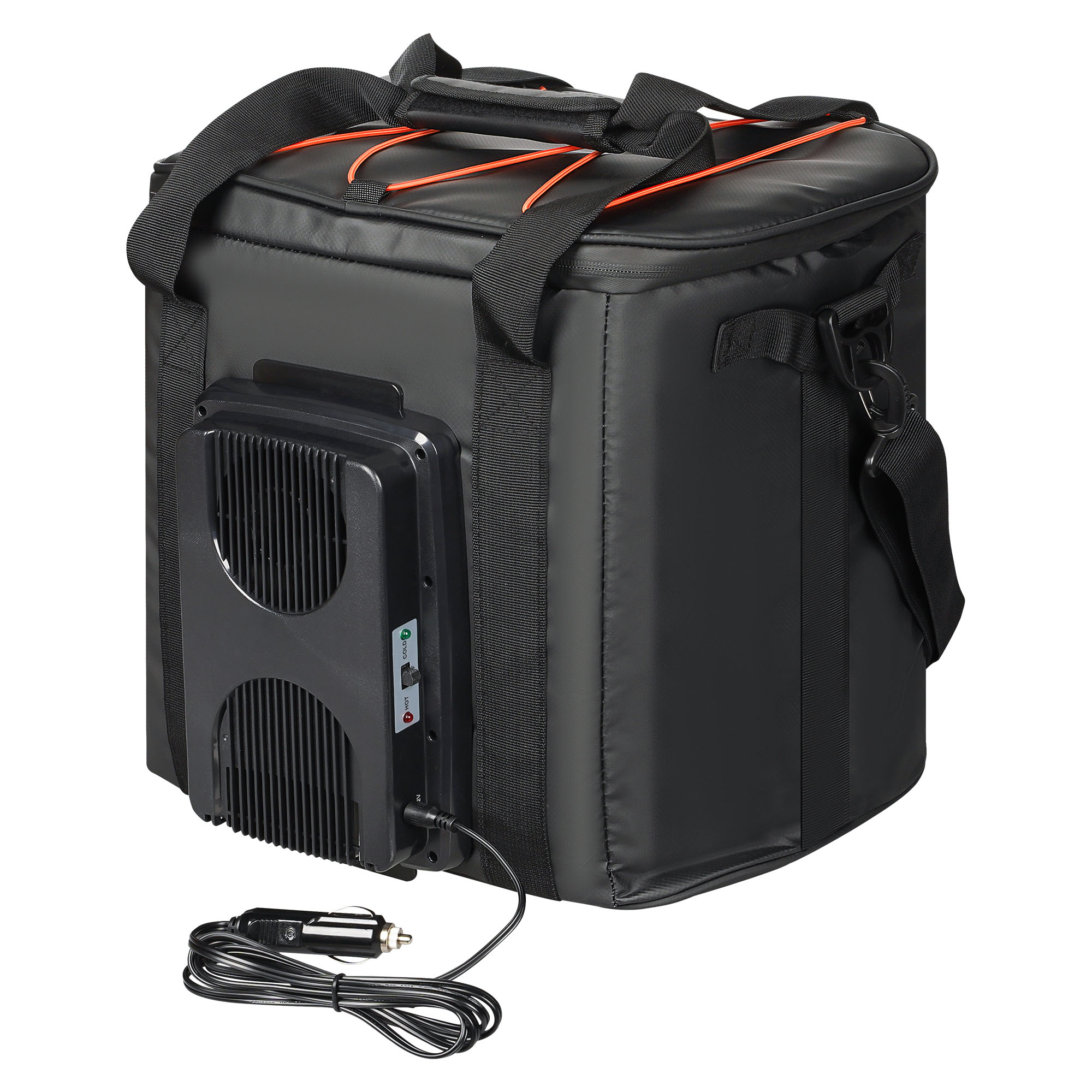 Сумка-холодильник -это надежное средство для обеспечения необходимой температуры и поддержания ее на протяжении длительного периода времени при транспортировки продуктов в автомобиле. Сохранение температуры происходит из-за преминяемых в составе изделия теплоизолирующих материалов, в который входят брезент, вспененный полиэтилен, а также водонепроницаемая PEVA пленка. Сумка имеет кубической форму, что позволяет использовать ее не только для хранения продуктов, но и для перевозки oбъемных вещей. Для удобства открывания, замочки молнии оснащены пуллерами (подвесками). Дополнительно сумка снабжена элементом "Пельтье" с функцией охлаждения и нагрева, работающего от автомобильной сети 12В.