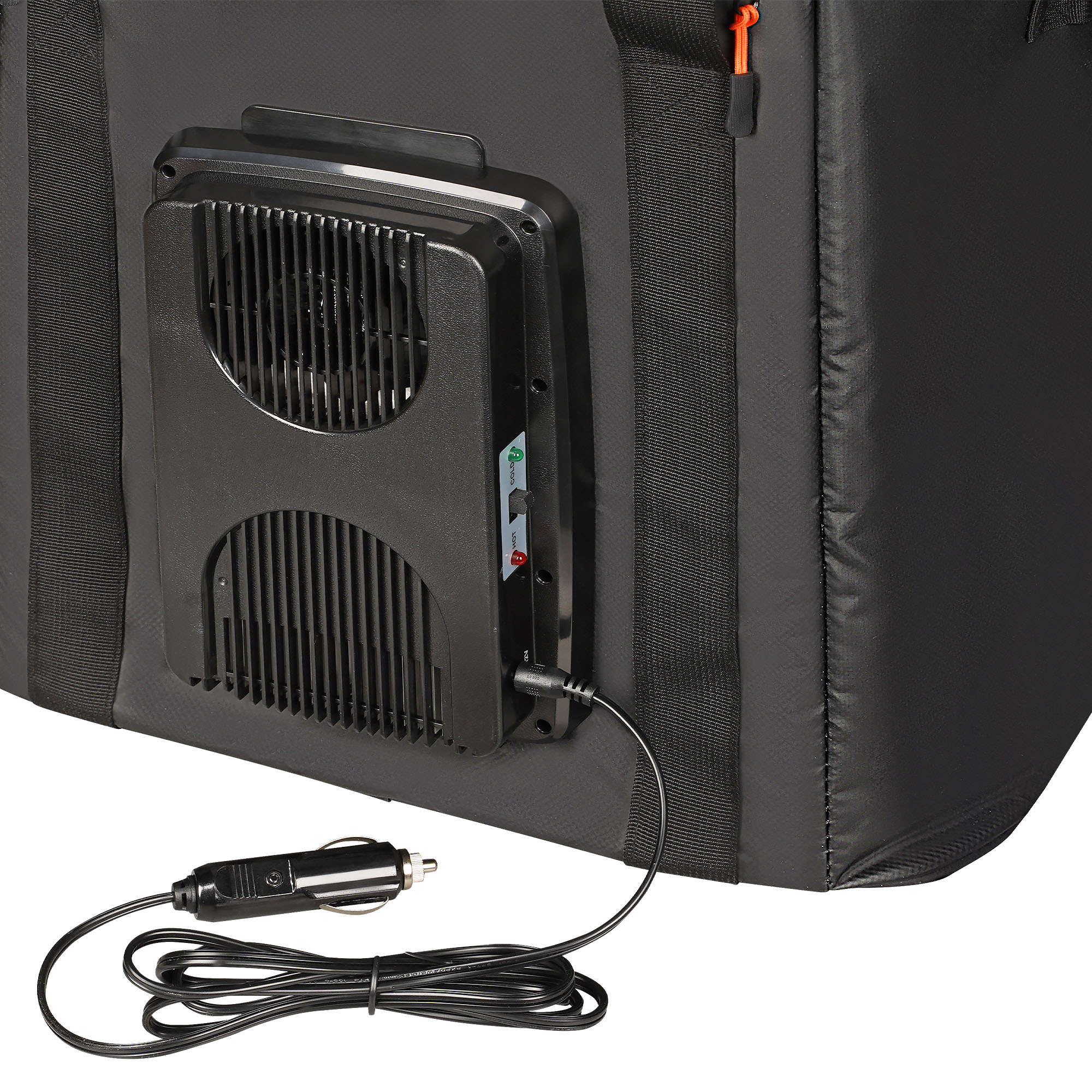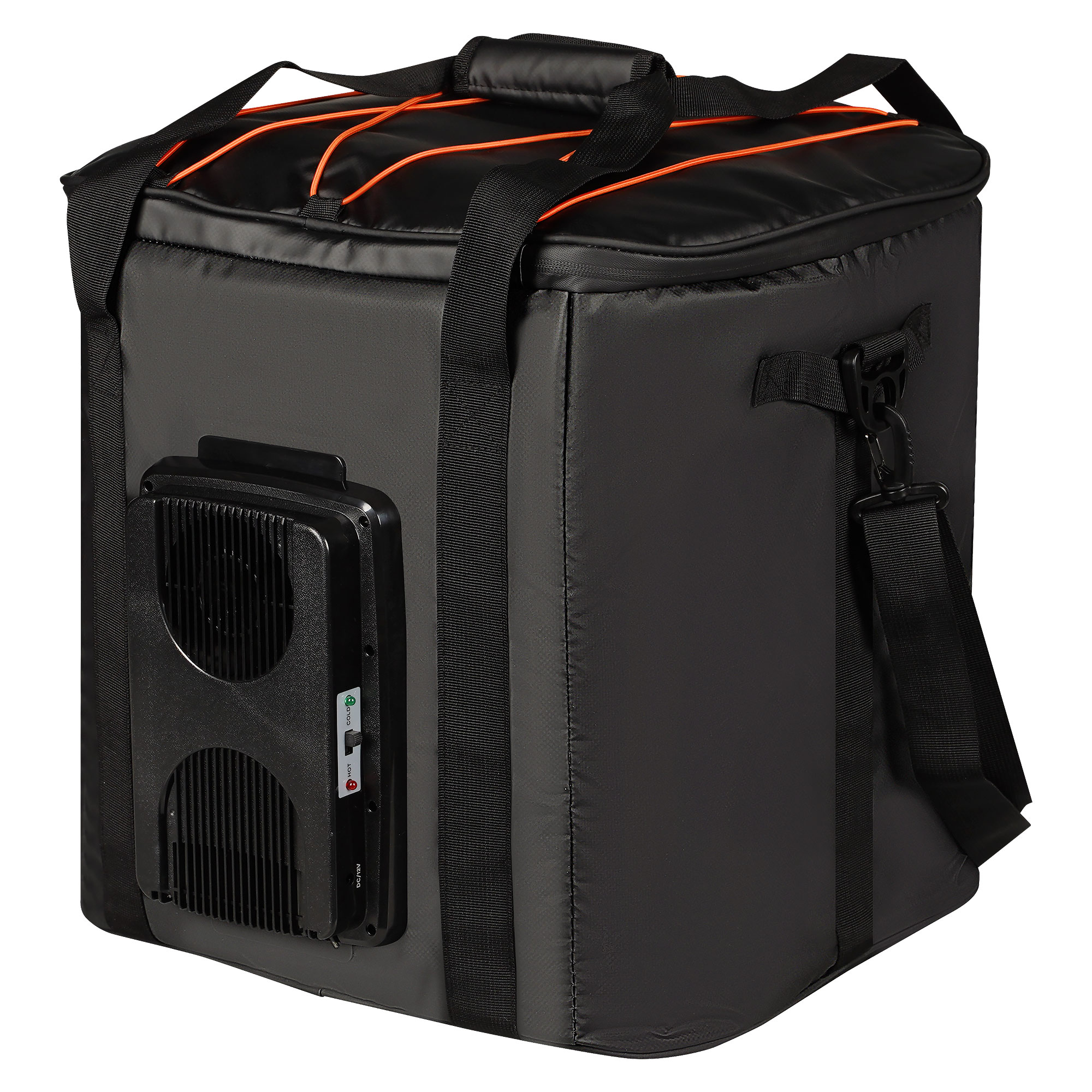 Сумка-холодильник -это надежное средство для обеспечения необходимой температуры и поддержания ее на протяжении длительного периода времени при транспортировки продуктов в автомобиле. Сохранение температуры происходит из-за преминяемых в составе изделия теплоизолирующих материалов, в который входят брезент, вспененный полиэтилен, а также водонепроницаемая PEVA пленка. Сумка имеет кубической форму, что позволяет использовать ее не только для хранения продуктов, но и для перевозки oбъемных вещей. Для удобства открывания, замочки молнии оснащены пуллерами (подвесками). Дополнительно сумка снабжена элементом "Пельтье" с функцией охлаждения и нагрева, работающего от автомобильной сети 12В.