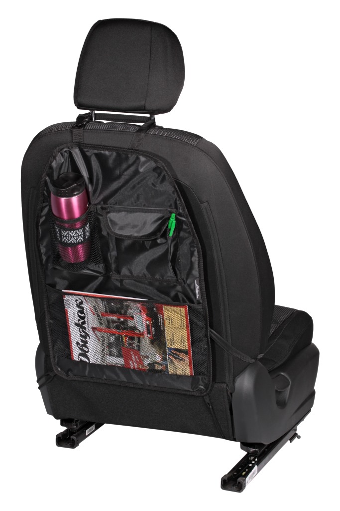 Органайзер на спинку переднего сиденья помогает не только создать удобную систему хранения в салоне автомобиля, но и обеспечить защиту для обшивки салона машины. Изделие фиксируется на спинке сиденья и оснащает ее дополнительными карманами для хранения необходимых автомобилисту документов или бумаг. Органайзер изготовлен из прочной и легко моющейся ткани, благодаря своим размерам защищает всю поверхность спинки переднего сидения от грязи и механических повреждений.