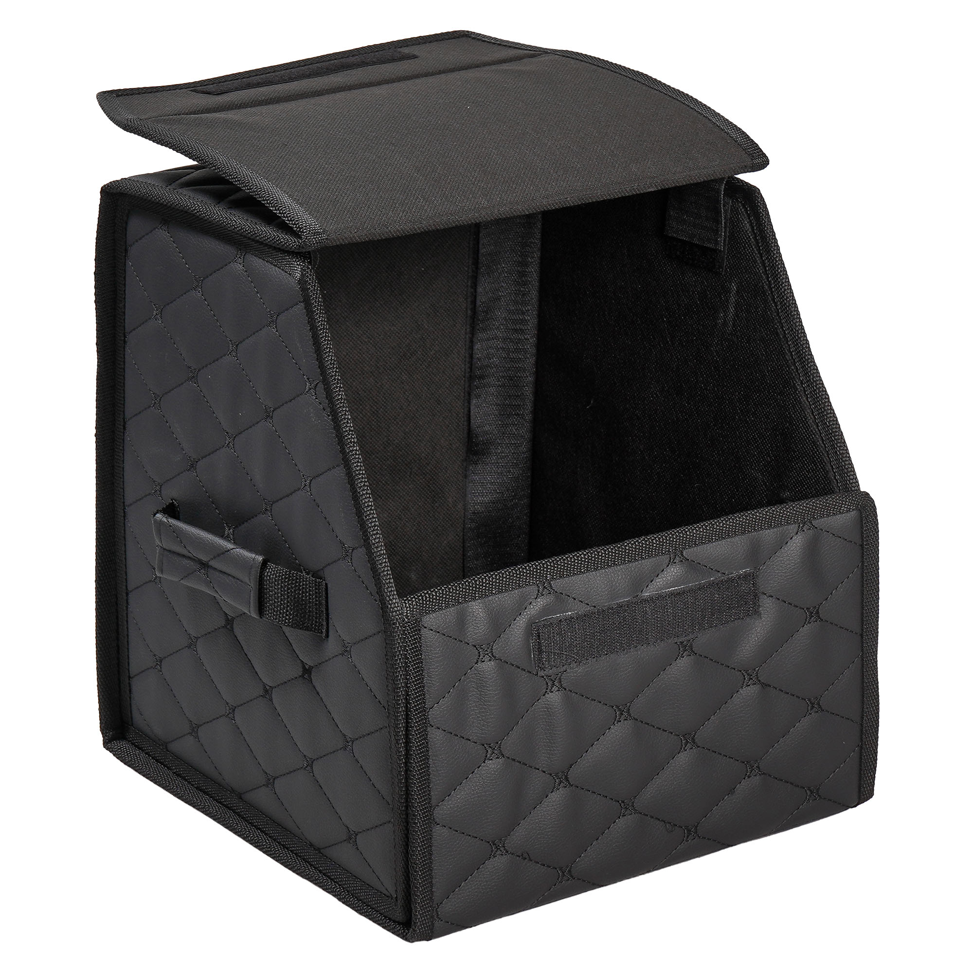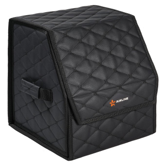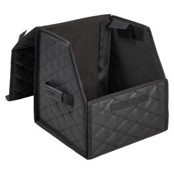 Органайзер предназначен для обеспечения порядка в багажнике автомобиля. Оснащён откидной крышкой и способен скрыть в себе 5л. бутылки или канистры, а также все необходимые в дороге вещи. Органайзер изготовлен из высококачественной экокожи, простёганной в виде ромба, что придает ему элегантный, богатый вид. Долговечность его складной конструкции придает внутренний листовой пластик. По бокам расположены крепкие ручки для его переноски, а нижняя и задняя липучка надежно зафиксирует его к ворсовому покрытию багажника.