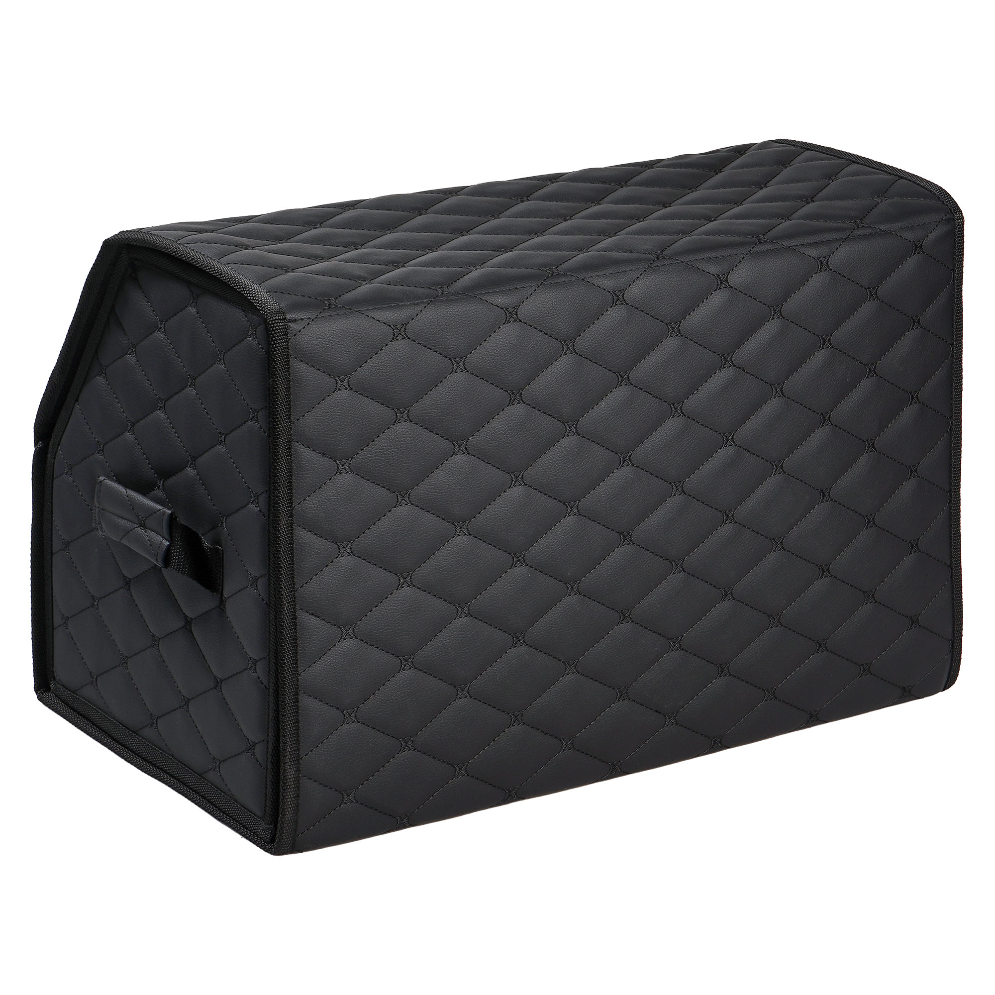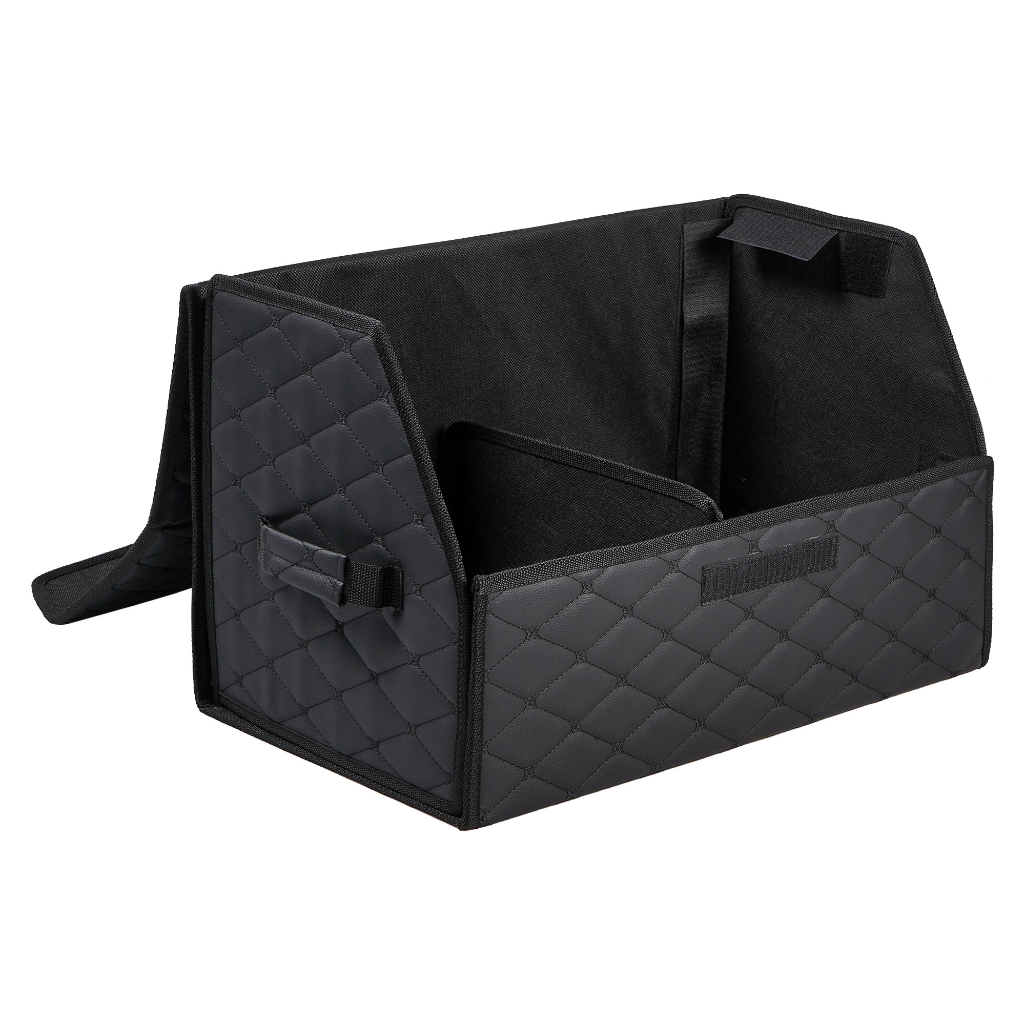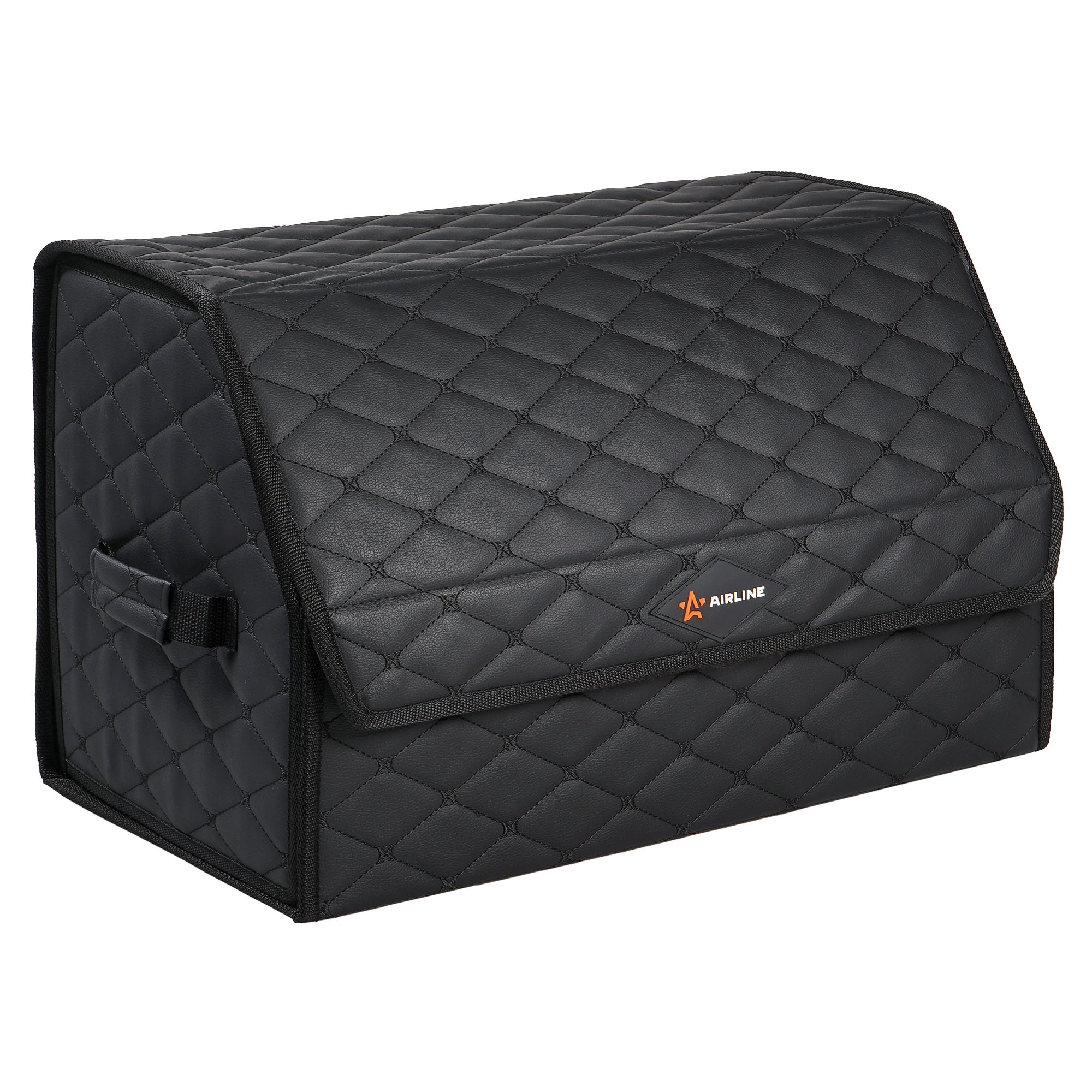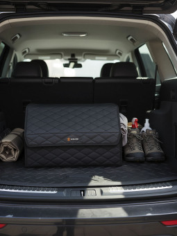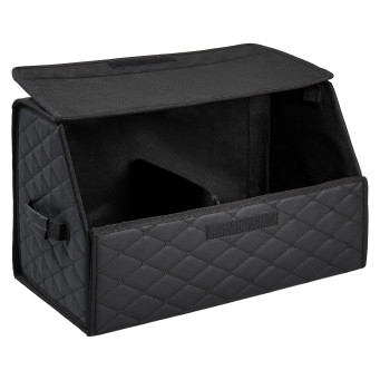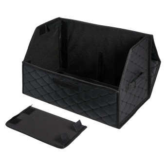Органайзер предназначен для обеспечения порядка в багажнике автомобиля. Оснащён откидной крышкой и способен скрыть в себе 5л. бутылки или канистры, а также все необходимые в дороге вещи. Органайзер изготовлен из высококачественной экокожи, простёганной в виде ромба, что придает ему элегантный, богатый вид. Долговечность его складной конструкции придает внутренний листовой пластик. Внутри возможно установить перегородку для раздельного хранения вещей. По бокам расположены крепкие ручки для его переноски, а нижняя и задняя липучка надежно зафиксирует его к ворсовому покрытию багажника.