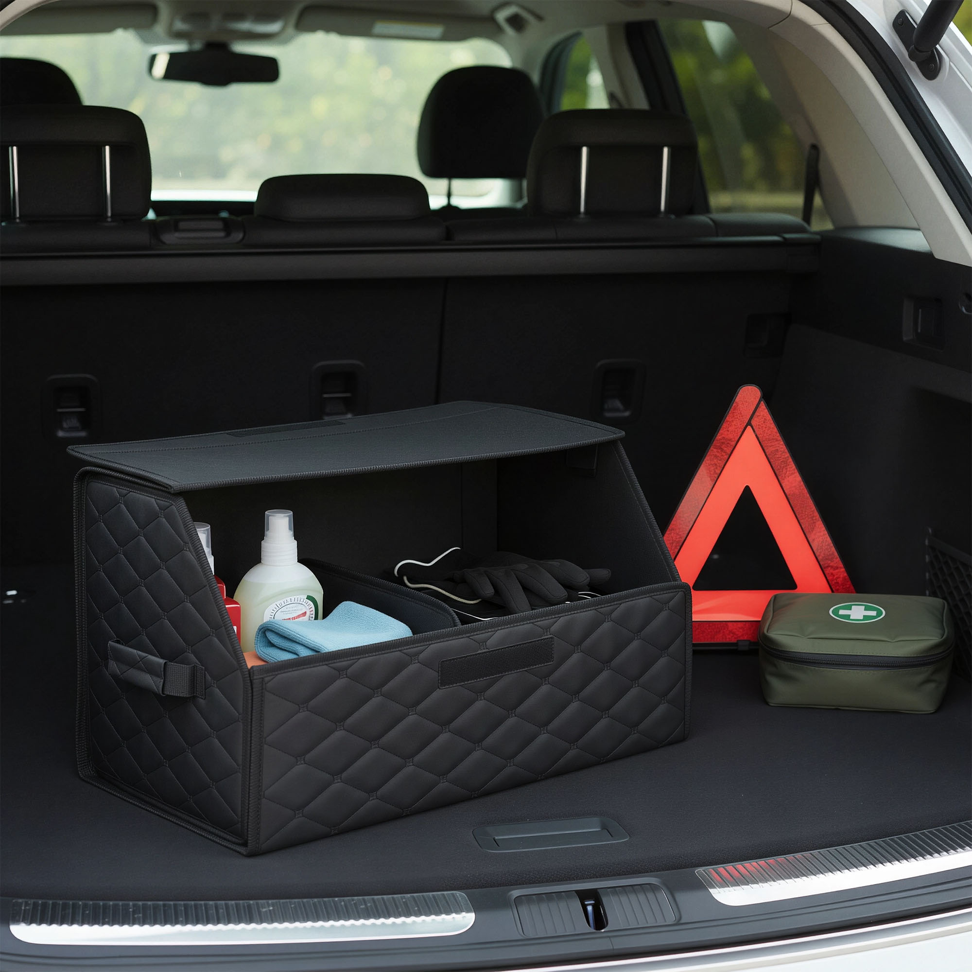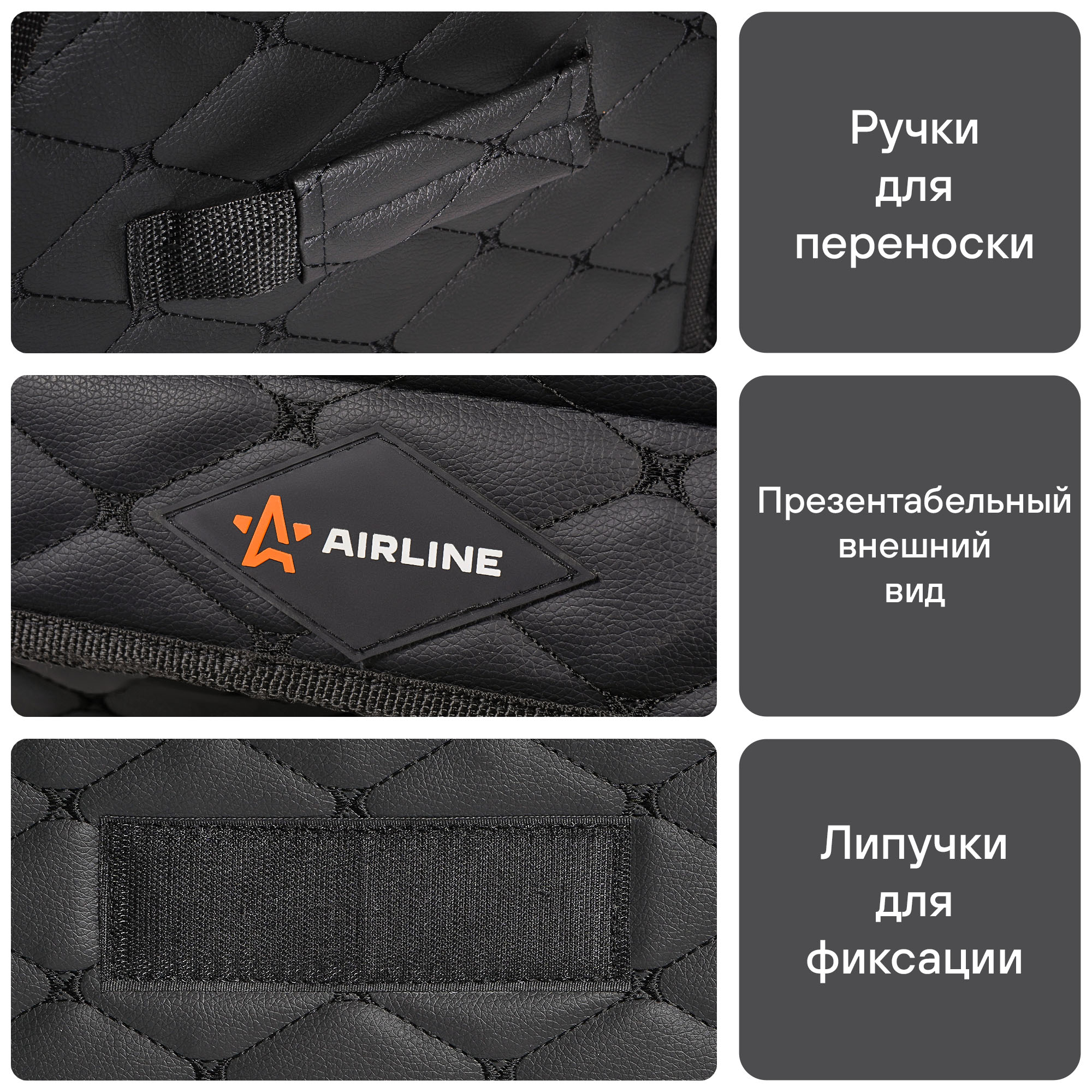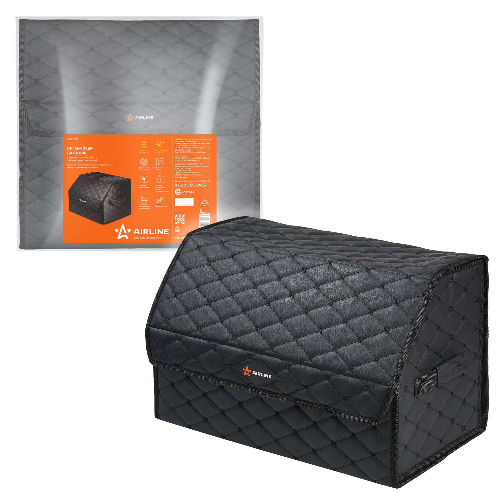 Органайзер предназначен для обеспечения порядка в багажнике автомобиля. Оснащён откидной крышкой и способен скрыть в себе 5л. бутылки или канистры, а также все необходимые в дороге вещи. Органайзер изготовлен из высококачественной экокожи, простёганной в виде ромба, что придает ему элегантный, богатый вид. Долговечность его складной конструкции придает внутренний листовой пластик. Внутри возможно установить перегородку для раздельного хранения вещей. По бокам расположены крепкие ручки для его переноски, а нижняя и задняя липучка надежно зафиксирует его к ворсовому покрытию багажника.