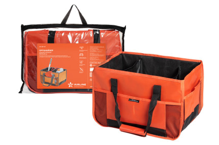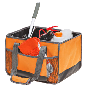Предназначен для обеспичения порядка в багажнике автомобиля. Благодаря удобным ручкам этот органайзер можно использовать в качестве сумки для покупок. Для предотвращения скольжения по багажнику на дне органайзера предусмотрены липучки. Параметры автомобильного органайзера 40х30х28 см – это оптимальный вариант для среднегабаритного багажного отделения машины. Изделие изготовлено из полиэстера оранжевого цвета с серыми вставками по периметру сумки. Органайзер оснащен тремя раздельными карманами внутри изделия. На внешней части изделия также расположено три кармана для хранения необходимых мелочей.