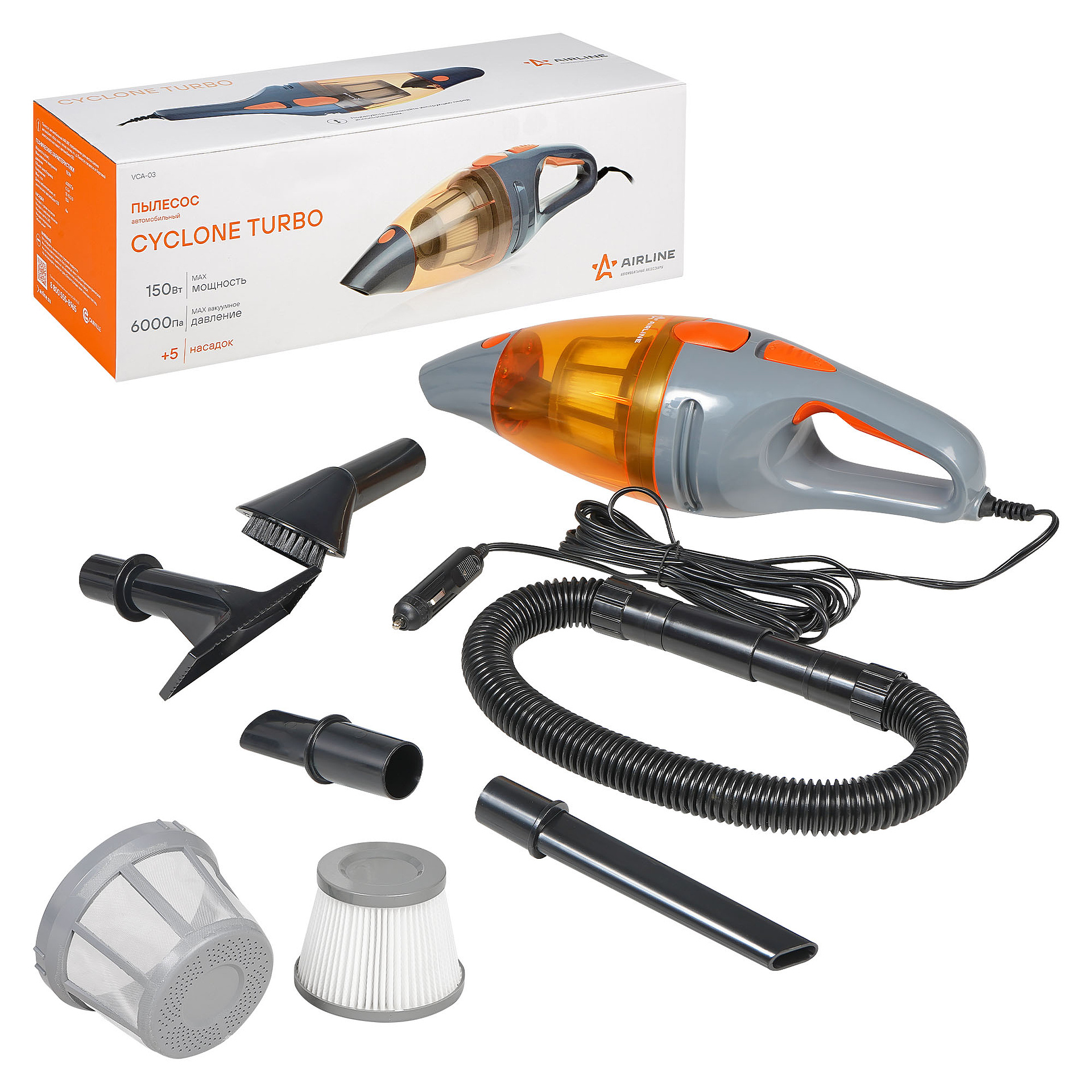 Пылесос CYCLONE TURBO с максимальным вакуумным давлением 6 000 Па является САМЫМ мощным на рынке автомобильных пылесосов. Технология CYCLONE и двойной HEPA фильтр быстро собирают грязь и задерживают в пылесборнике даже мельчайшую пыль размером до 0,3 микрон. На конце пылесборника установлен съемный носик, который позволяет вытряхивать грязь, не снимая весь пылесборник. Комплектуются прозрачным пылесборником и 5 насадками. В комплектацию входит удобная сумка для переноса и хранения пылесоса и всех насадок. В комплекте идет дополнительный фильтр.