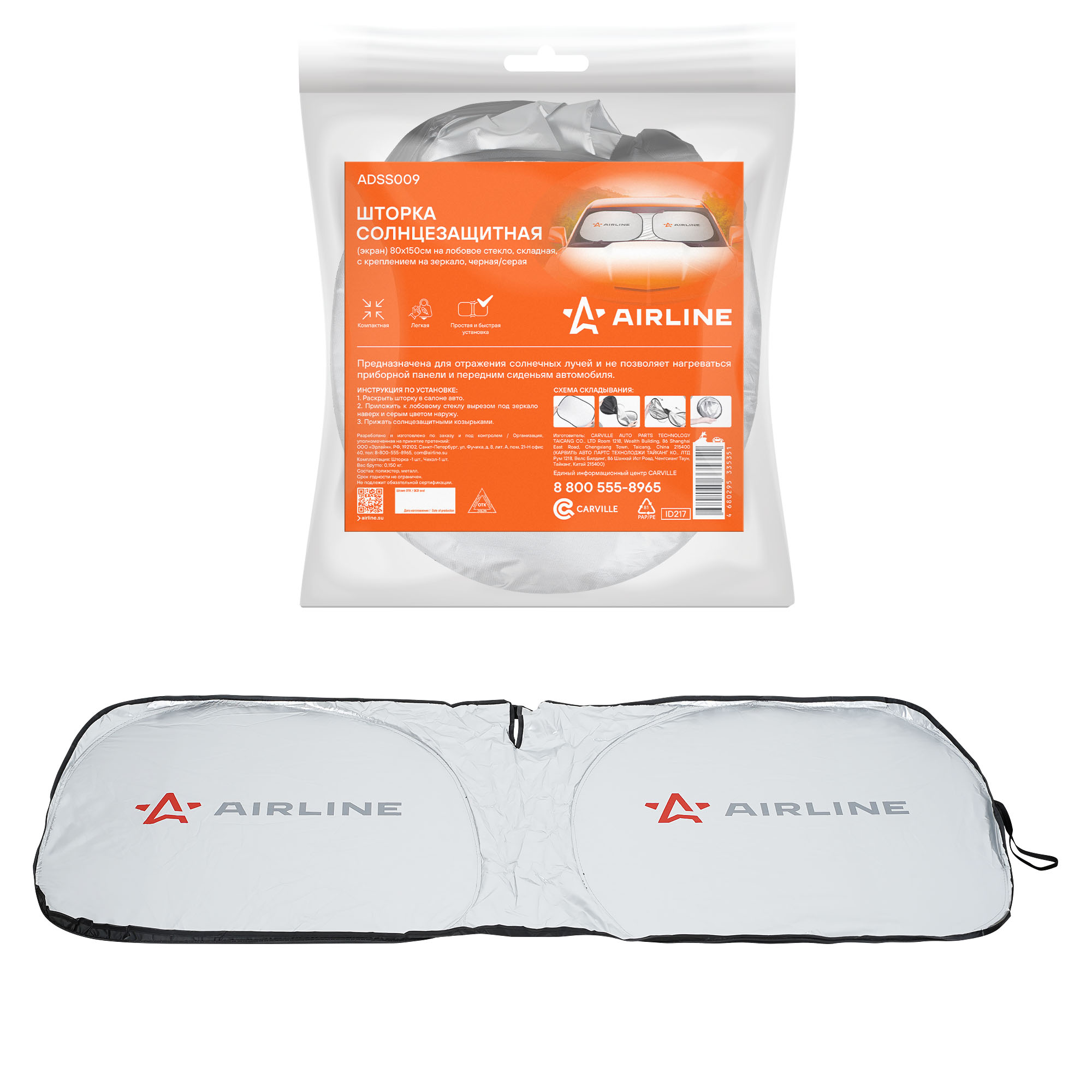 Солнцезащитная шторка-экран, используются для блокировки попадания солнечных лучей со стороны лобового стекла в салон автомобиля, тем самым защищает его от нагрева. Имеет складную конструкции путем "свинчивания" и крепится к стеклу прижатием солнцезащитными козырьками. В верхней части расположен вырез с липучкой под салонное зеркало заднего вида. Высота шторки 80 см-подходит для автомобилей BСE класса (кроссоверы, внедорожники и минивэны и пр.) Шторка-экран упакована в чехол и имеет очень компактные размеры в сложенном состоянии, что позволяет легко разместить ее в бардачке или между передними сиденьями. Перед покупкой рекомендуется сверить размер шторки с размерами лобового стекла своего автомобиля.