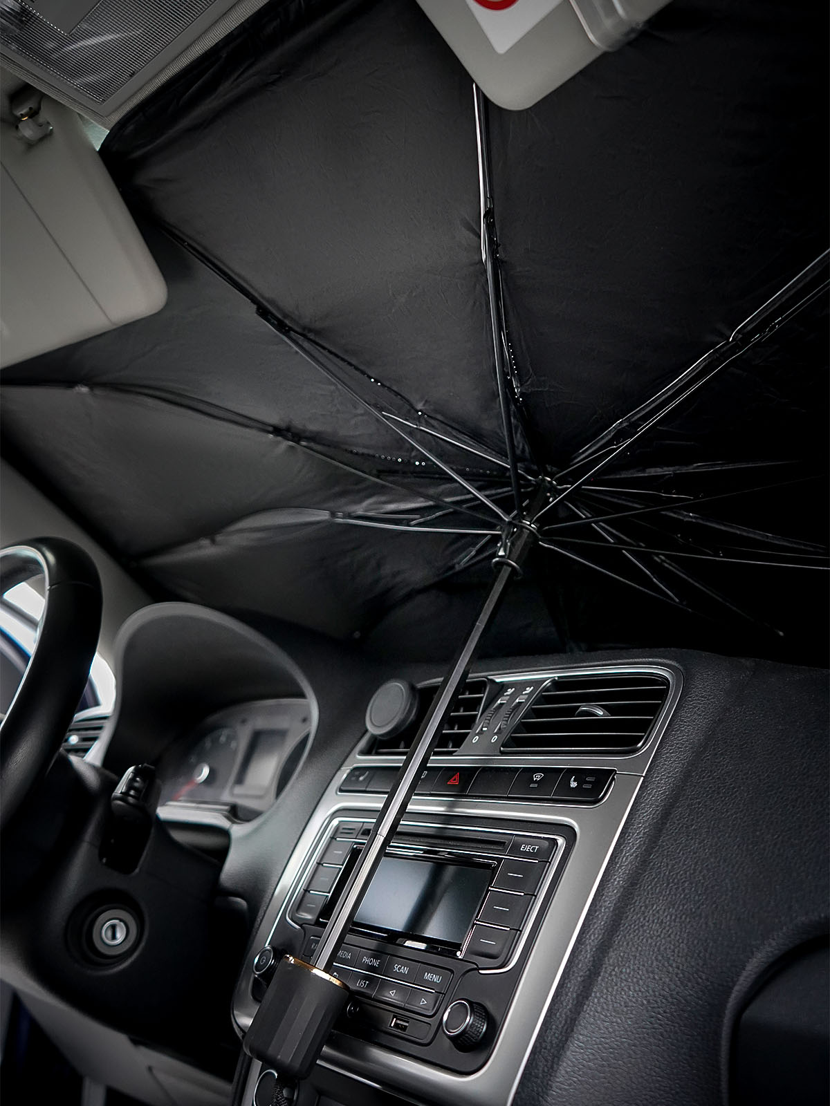 Солнцезащитные шторки, которые используются для блокировки попадания солнечных лучей со стороны лобового стекла в салон автомобиля, защищая его от нагрева. Имеют складную конструкцию в виде зонта и крепятся к стеклу прижатием солнцезащитными козырьками. Такая конструкция обеспечит вам их быструю установку и снятие. Шторки-зонты упакованы в индивидуальные чехлы и имеют компактные размеры в сложенном состоянии, что позволяет легко размещать их в бардачке, дверном кармане или между консолью и передним сиденьем. Высота шторки 70 см -подходит для автомобилей BС класса.