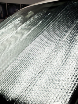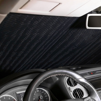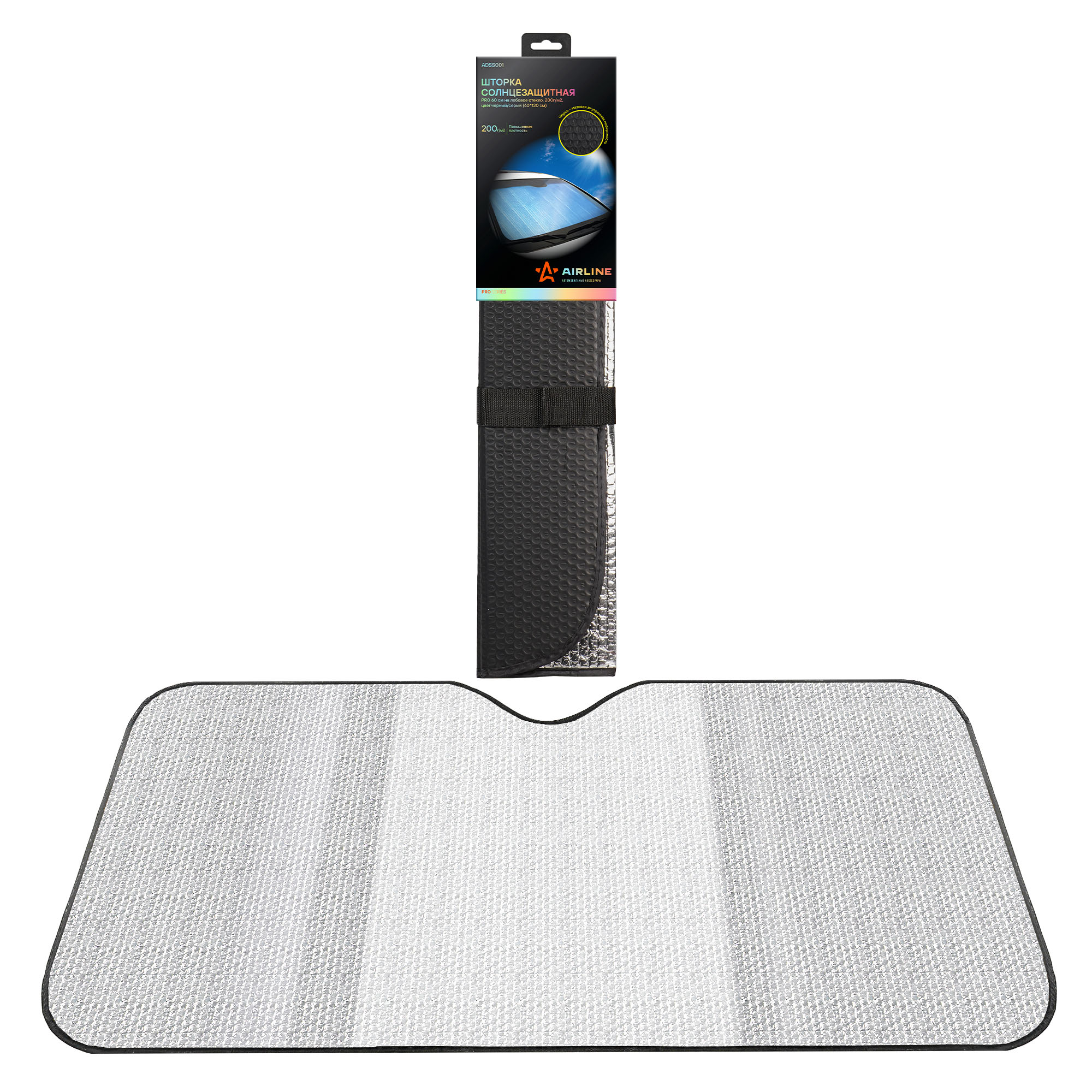Двусторонняя солнцезащитная шторка размером необходима для блокировки попадания солнечных лучей со стороны лобового стекла в салон машины. Серебристая поверхность шторки отражает солнечные лучи, защищая салон и торпеду автомобиля от нагрева. Внутренняя поверхность для красоты имеет черное матовое покрытие. Шторка имеет повышенную плотность (жесткость) и крепится к лобовому стеклу при помощи солнцезащитных козырьков. Высота шторки 60 см - идеальна для отечественной классики и автомобилей A и B категории.