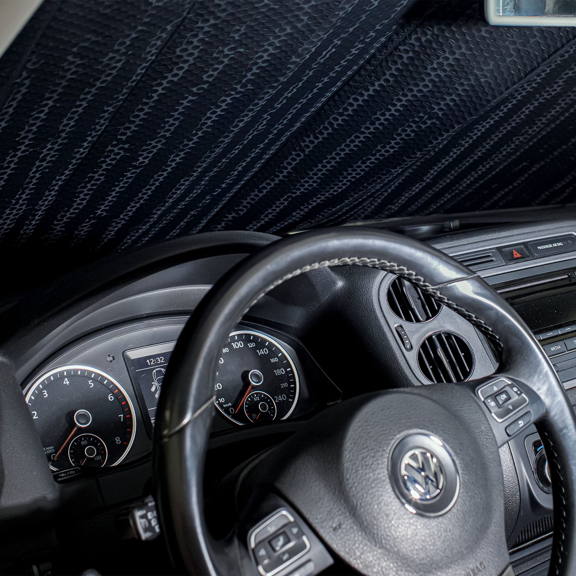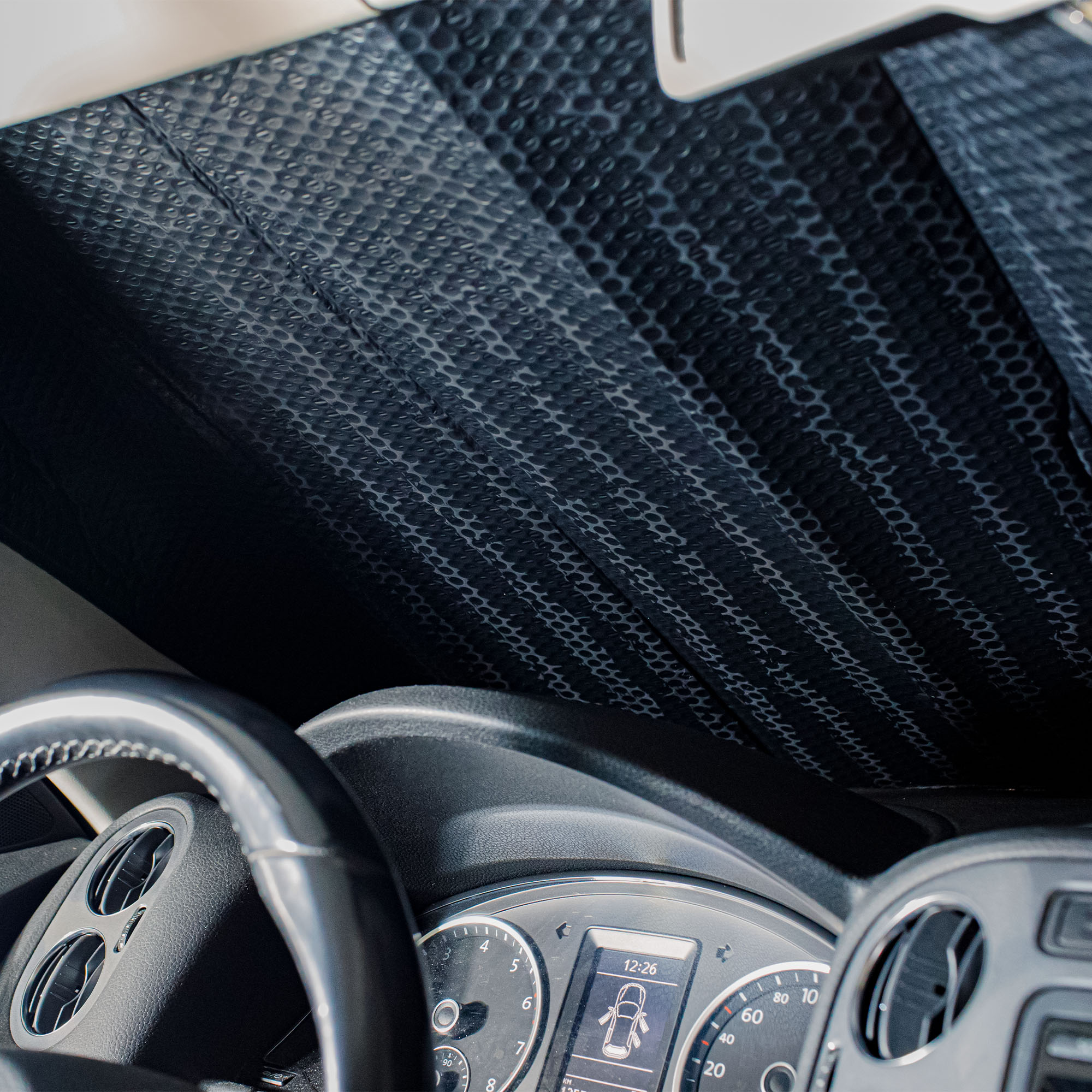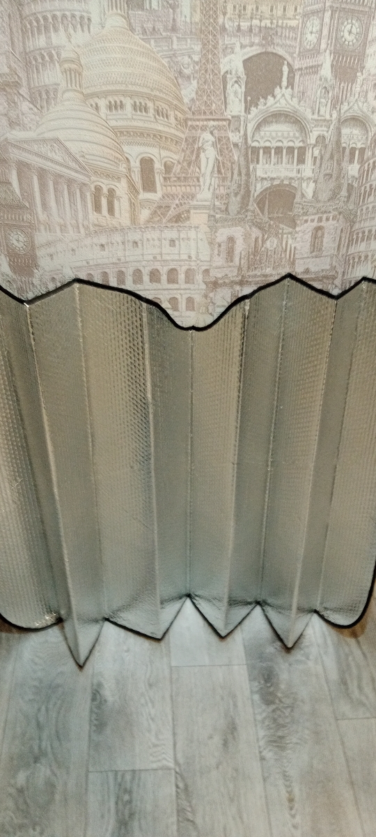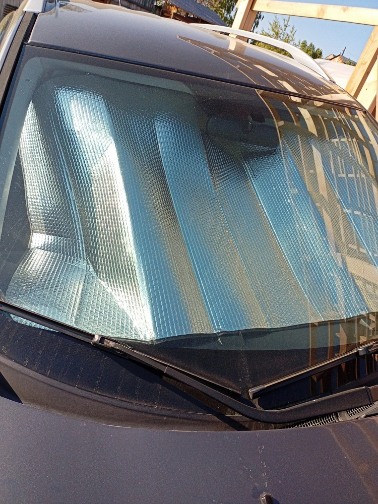 Двусторонняя солнцезащитная шторка размером необходима для блокировки попадания солнечных лучей со стороны лобового стекла в салон машины. Серебристая поверхность шторки отражает солнечные лучи, защищая салон и торпеду автомобиля от нагрева. Внутренняя поверхность для красоты имеет черное матовое покрытие. Шторка имеет повышенную плотность (жесткость) и крепится к лобовому стеклу при помощи солнцезащитных козырьков. Высота шторки 80 см - идеальна для кроссоверов и коммерческого транспорта.