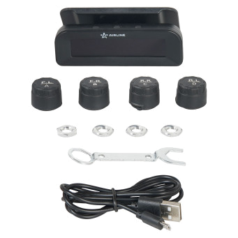 Система контроля давления в шинах (TPMS) представляет из себя комплект из 4 внешних датчиков давления и приёмного модуля с цветным ЖК дисплеем. Датчики монтируются на ниппель колеса автомобиля, измеряют давление и температуру воздуха в шине и передают информацию о значении давления по радиоканалу на дисплей. Приёмный модуль принимает информацию о давлении в шинах и отображает значения давления в шинах на встроенном ЖК индикаторе. При изменении давления в колесе система сигнализирует об этом водителю звуковыми сигналами и отображает информацию на дисплее. Приёмный модуль питается от встроенного литий-полимерного аккумулятора, который подзаряжается от встроенной солнечной батареи или зарядного кабеля microUSB. Датчики давления питаются от встроенных батареек CR1632. Заряда батареек хватает до 24 месяцев работы, батарейки можно заменить самостоятельно.