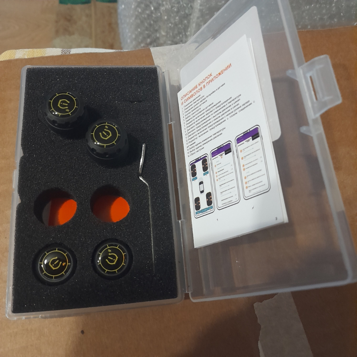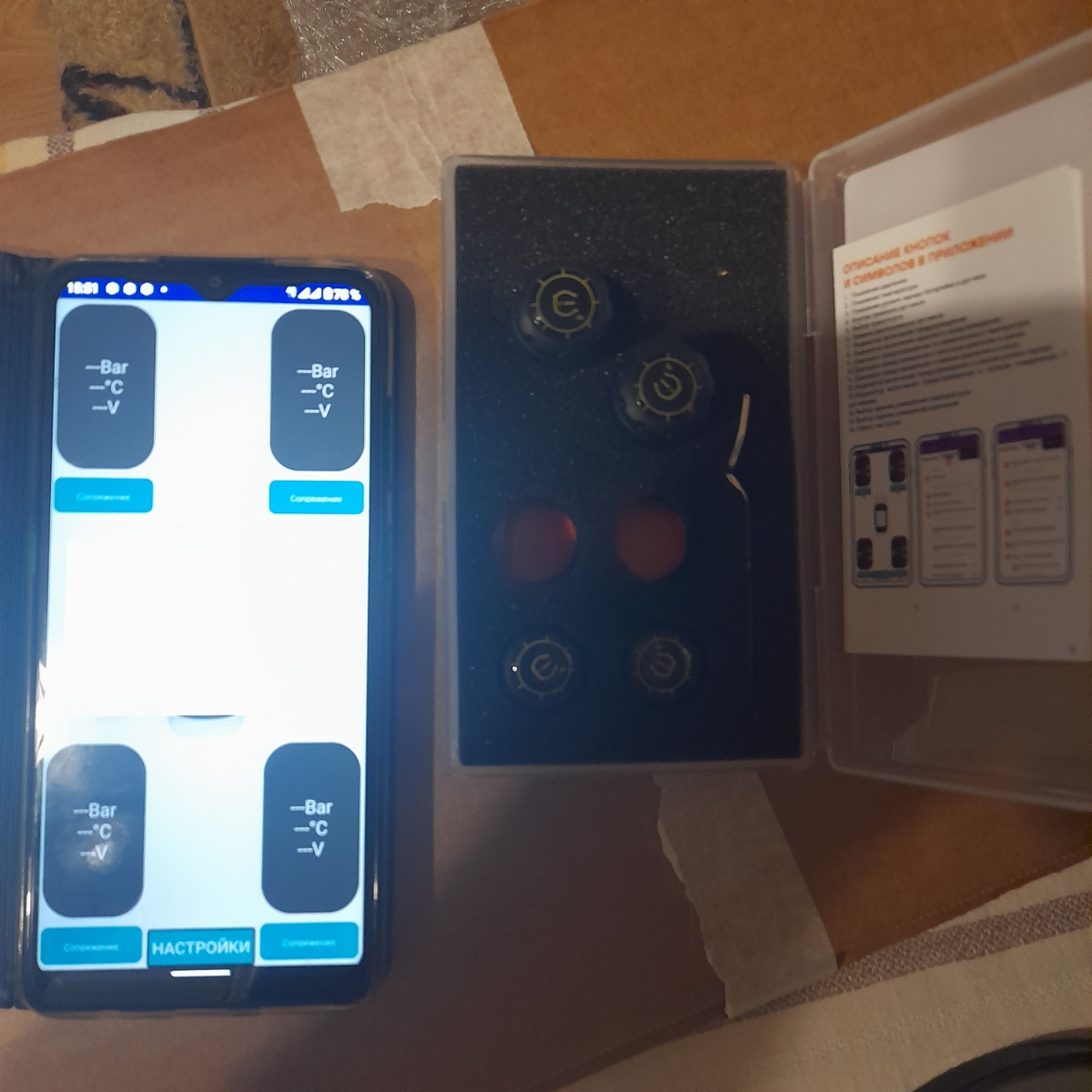 Система контроля давления в шинах (TPMS) представляет из себя комплект из 4 внешних датчиков давления. Датчики монтируются на ниппель колеса автомобиля, измеряют давление и температуру воздуха в шине и передают информацию о значении давления по Bluetooth на мобильный. При изменении давления в колесе система сигнализирует об этом водителю звуковыми сигналами и вибрацией. Датчики давления питаются от встроенных батареек CR1632, по одной штуке в каждом датчике. Заряда батареек хватает до 24 месяцев работы, батарейки можно заменить самостоятельно. Диапазон измеряемого давления 0 - 8 Бар. Устройство работает даже в сложных условиях, при температуре от -20°С - +80°С.
