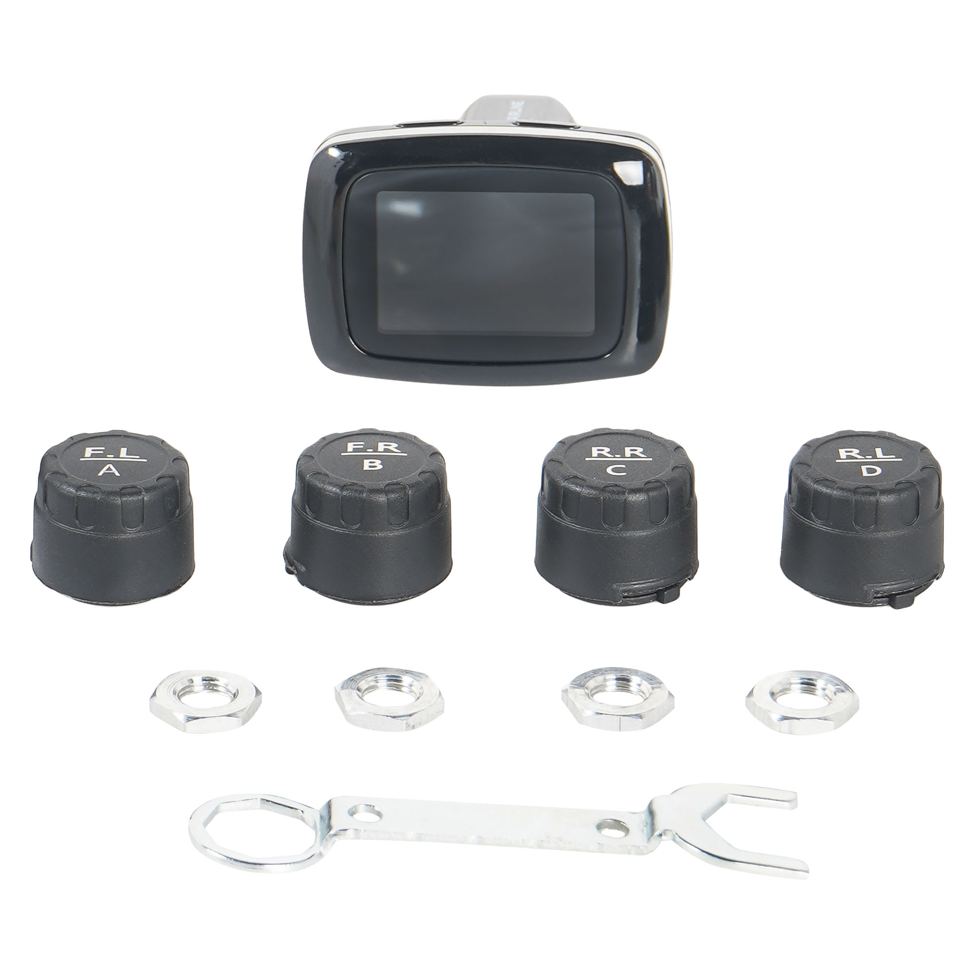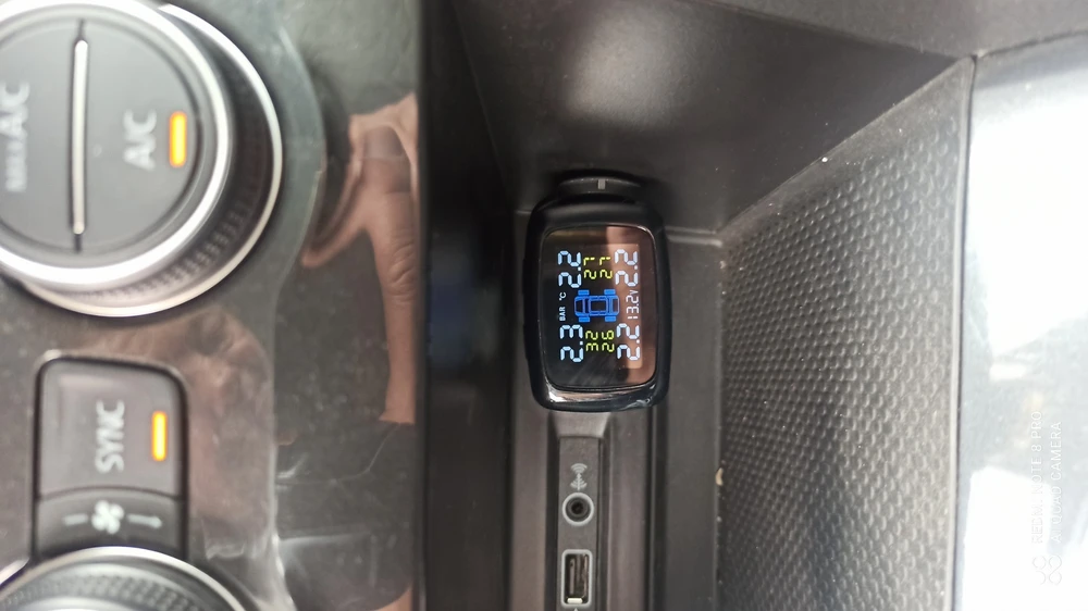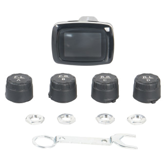 Система контроля давления в шинах (TPMS) представляет из себя комплект из 4 внешних датчиков давления и приёмного модуля с цветным ЖК дисплеем. Датчики монтируются на ниппель колеса автомобиля, измеряют давление и температуру воздуха в шине и передают информацию о значении давления по радиоканалу на дисплей. Приёмный модуль принимает информацию о давлении в шинах и отображает значения давления в шинах на встроенном ЖК индикаторе. Приёмный модуль вставляется в гнездо прикуривателя автомобиля. Датчики давления питаются от встроенных батареек CR1632, по одной штуке в каждом датчике. Заряда батареек хватает до 24 месяцев работы, батарейки можно заменить самостоятельно. При изменении давления в колесе система сигнализирует об этом водителю звуковыми сигналами и отображает информацию на дисплее. Пороговые значения давлений и температуры настраиваются в меню дисплея. На боковой панели приемного модуля есть выход USB 5В/1А для зарядки мобильных телефонов. Комплект может быть установлен самостоятельно.