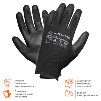 Применяются для защиты кистей рук от загрязнения, механических повреждений. Полиэфирные перчатки отличаются не только высокими показателями прочности, но и особой структурой ткани, которая дает возможность оставаться пальцам чувствительными. Перчатки подойдут для работы с малогабаритными деталями и мелкими механизмами. Перчатки изготовлены из черного тонкого полиэфира схожего с нейлоном и пропитаны полиуретаном серого цвета в области ладони и пальцев. Используются в быту и на производстве требующем высокой точности движений.