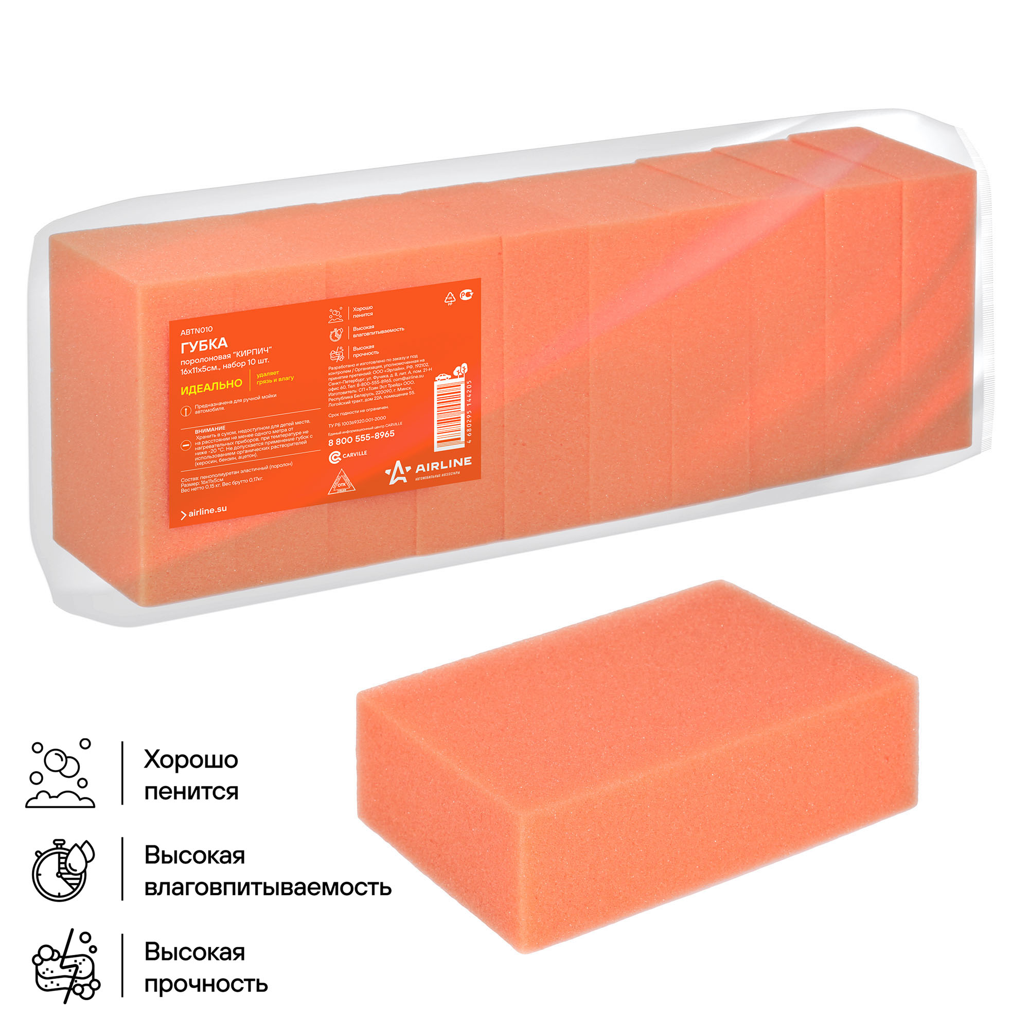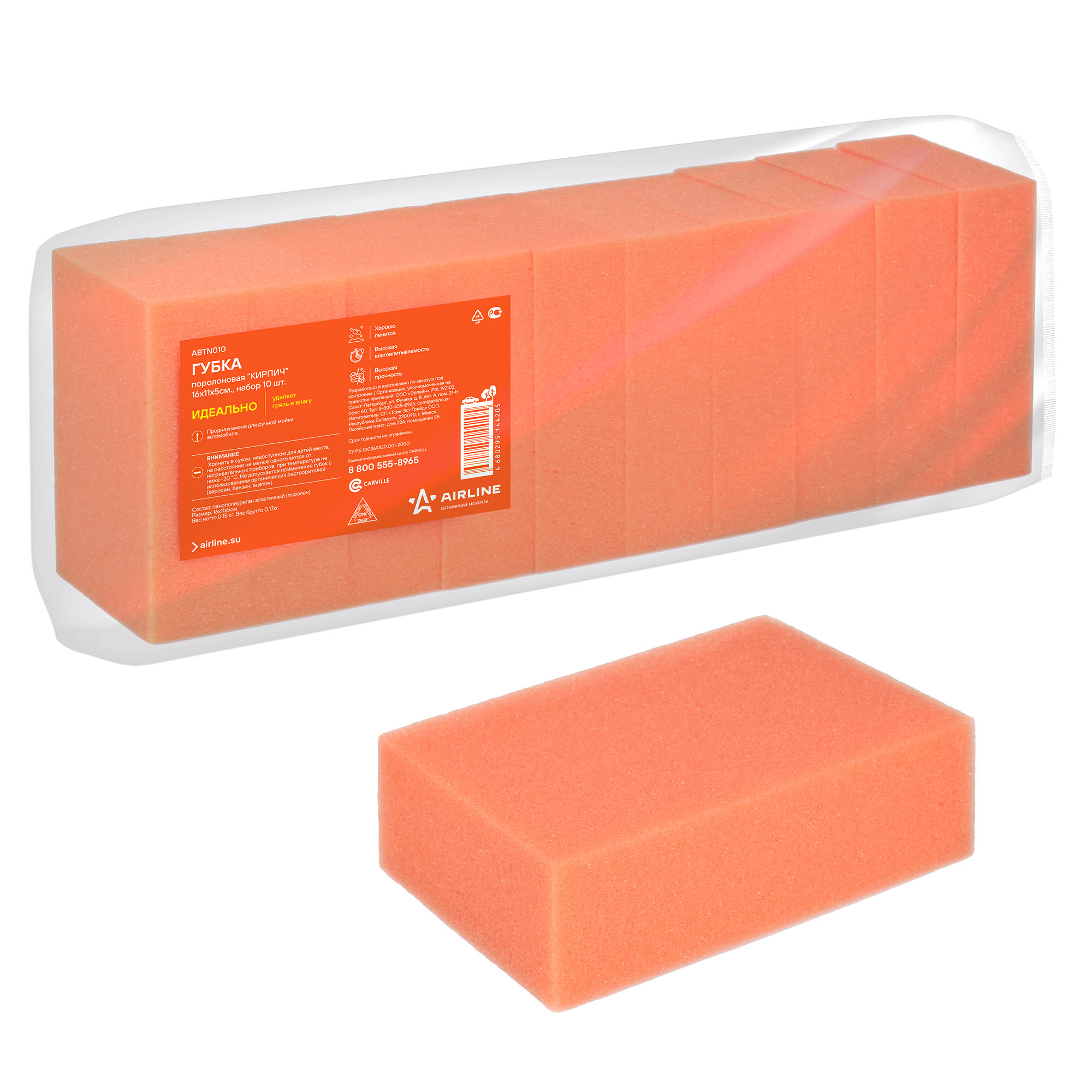 Губка поролоновая "Кирпич" AIRLINE оранжевого цвета прямоугольной формы, изготовленная из мелкопористого поролона - это доступное и бюджетное средство для избавления от загрязнений на поверхности стекол, фар и корпуса автомобиля. Губка обладает особой поверхностью, которая легко и плавно очищает автомобиль, не создавая после уборки царапин или разводов. Губка обладает выской влаговпитываемостью и легко отжимается. Упаковка 10 шт.