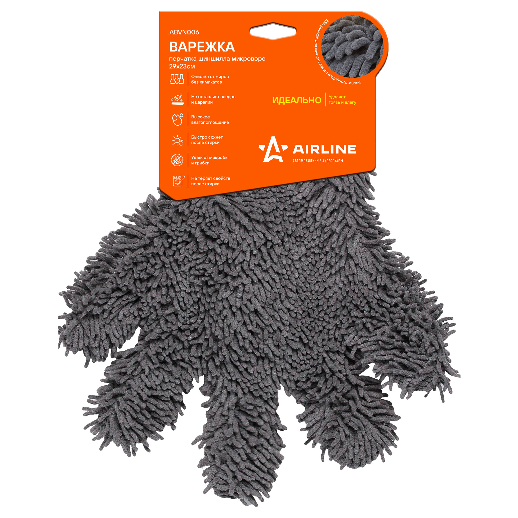 Изделие представляет собой удобную перчатку серо-оранжевого цвета, предназначенную для уборки поверхностей от пыли и различных загрязнений. Ворс перчатки AIRLINE изготовлен из микрофибры, которая не оставляет нитей и разводов на убираемой поверхности, делая ее чистой и блестящей. Также перчатка обладает потрясающими впитывающими свойствами и высокой прочностью.