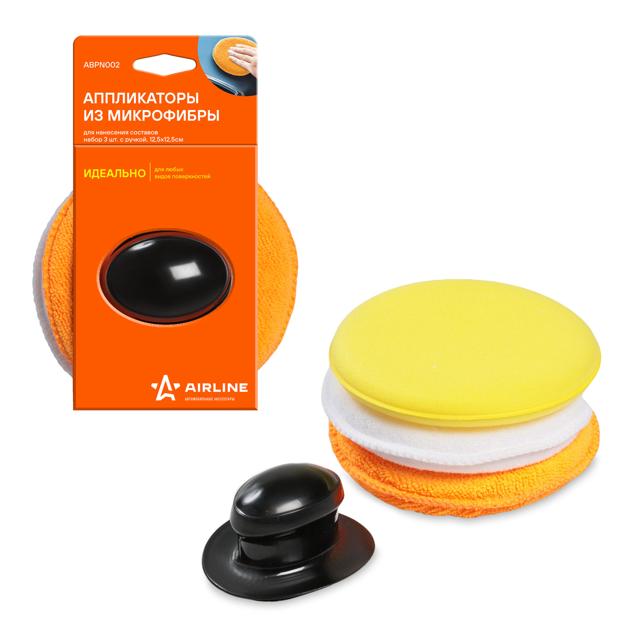 Набор аппликаторов AIRLINE из микрофибры и поролона предназначен для нанесения воска, различных составов, полировки и ухода за автомобилем. В комплекте: съемная пластиковая ручка, аппликатор из микрофибры и поролона, аппликатор из вспененного полиуретана, аппликатор из полиэстера и поролона.