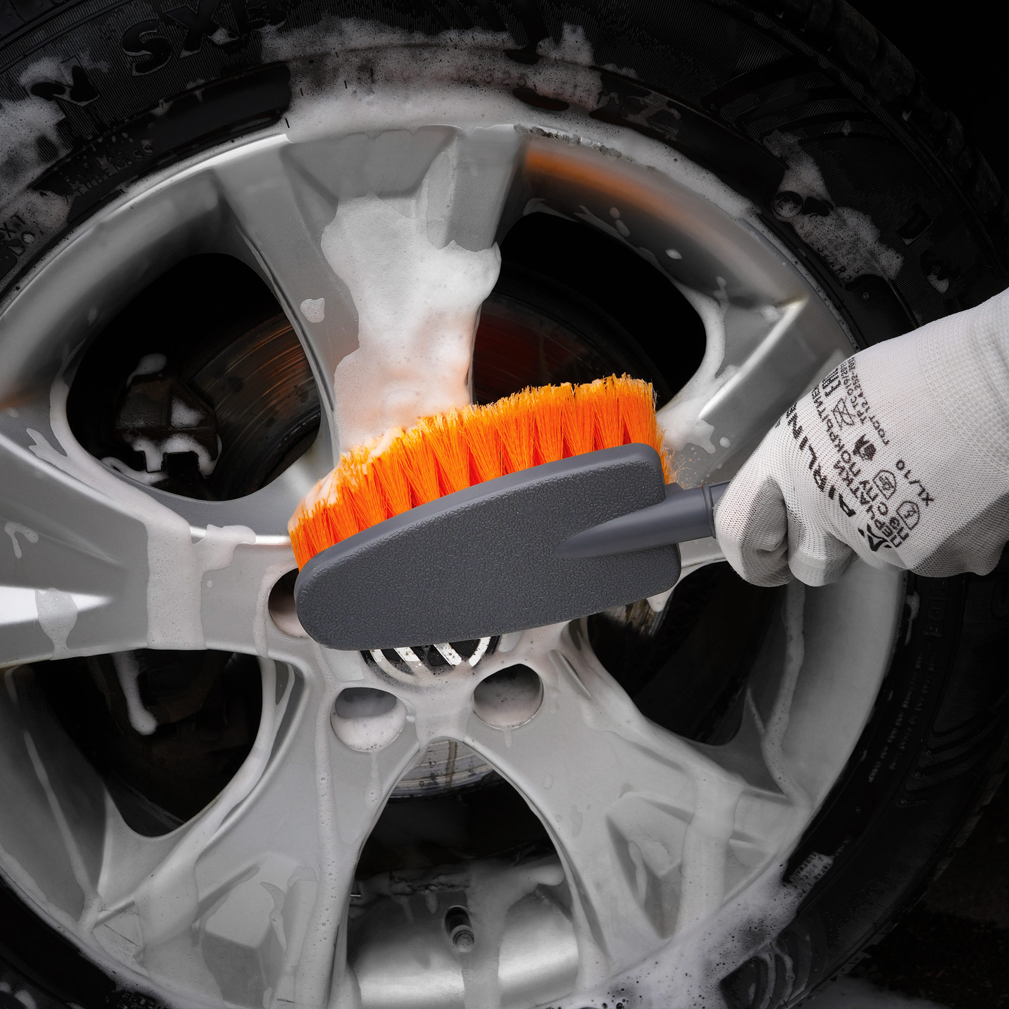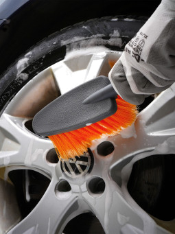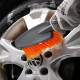 Компактная пластиковая щетка серого цвета для мытья автомобиля поможет очистить машину от загрязнений. Диаметр щетины щетки составляет 0,3 мм и имеет мягкие распушенные кончики. Рабочая поверхность изделия имеет ворс средней длины, а также оранжевую окраску. Со стороны ручки у изделия расположена насадка для подключения шланга с водой.