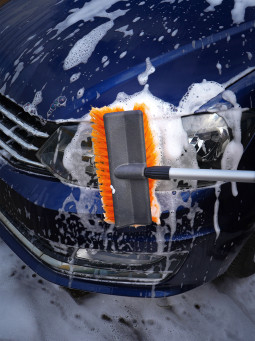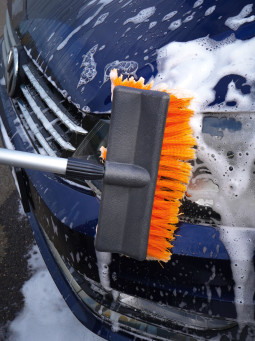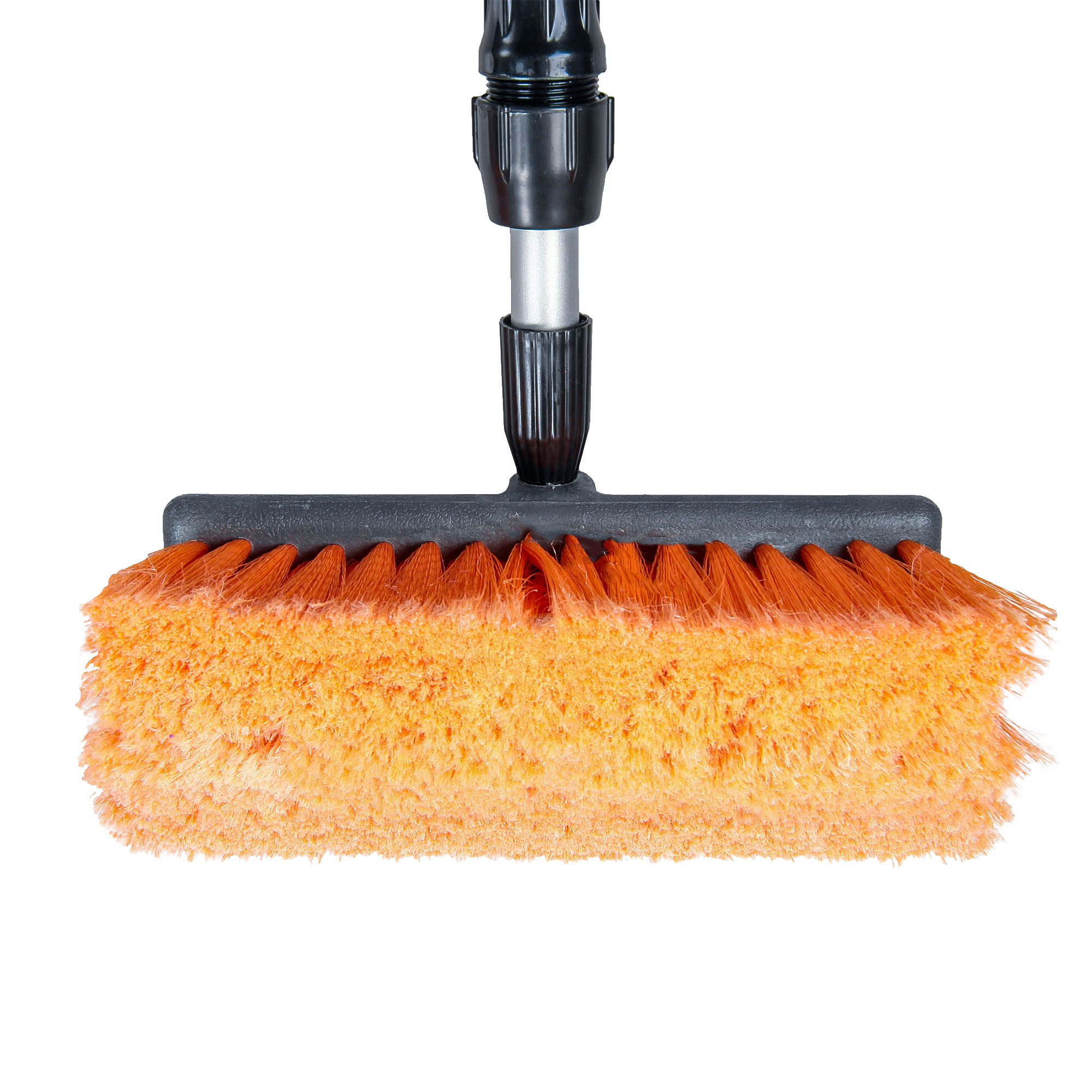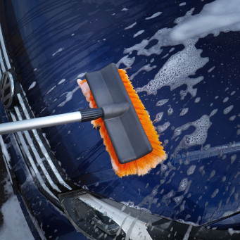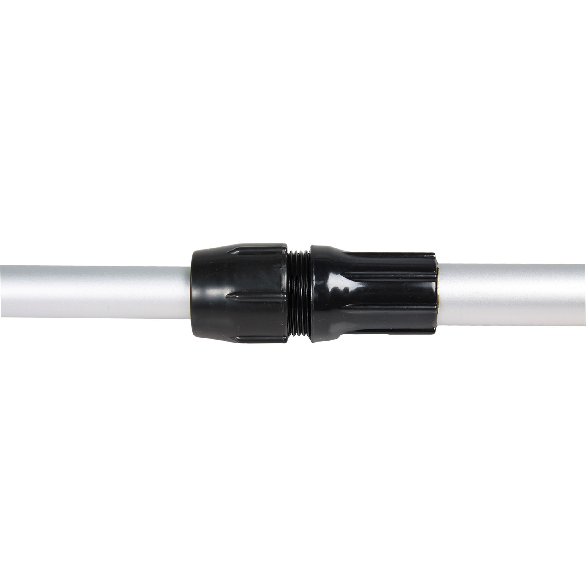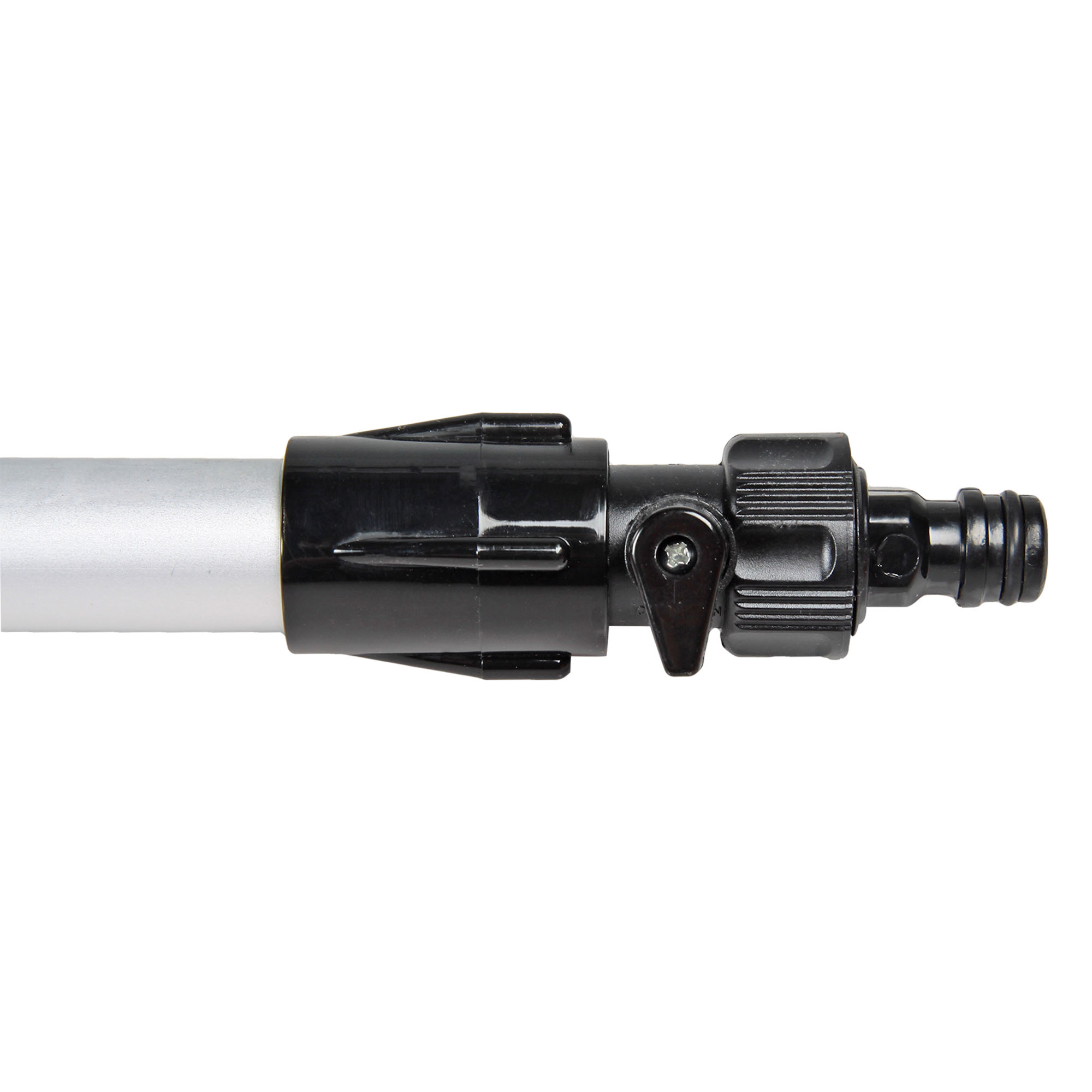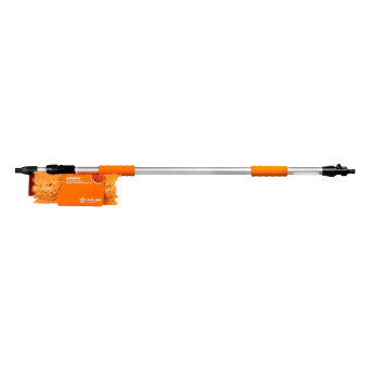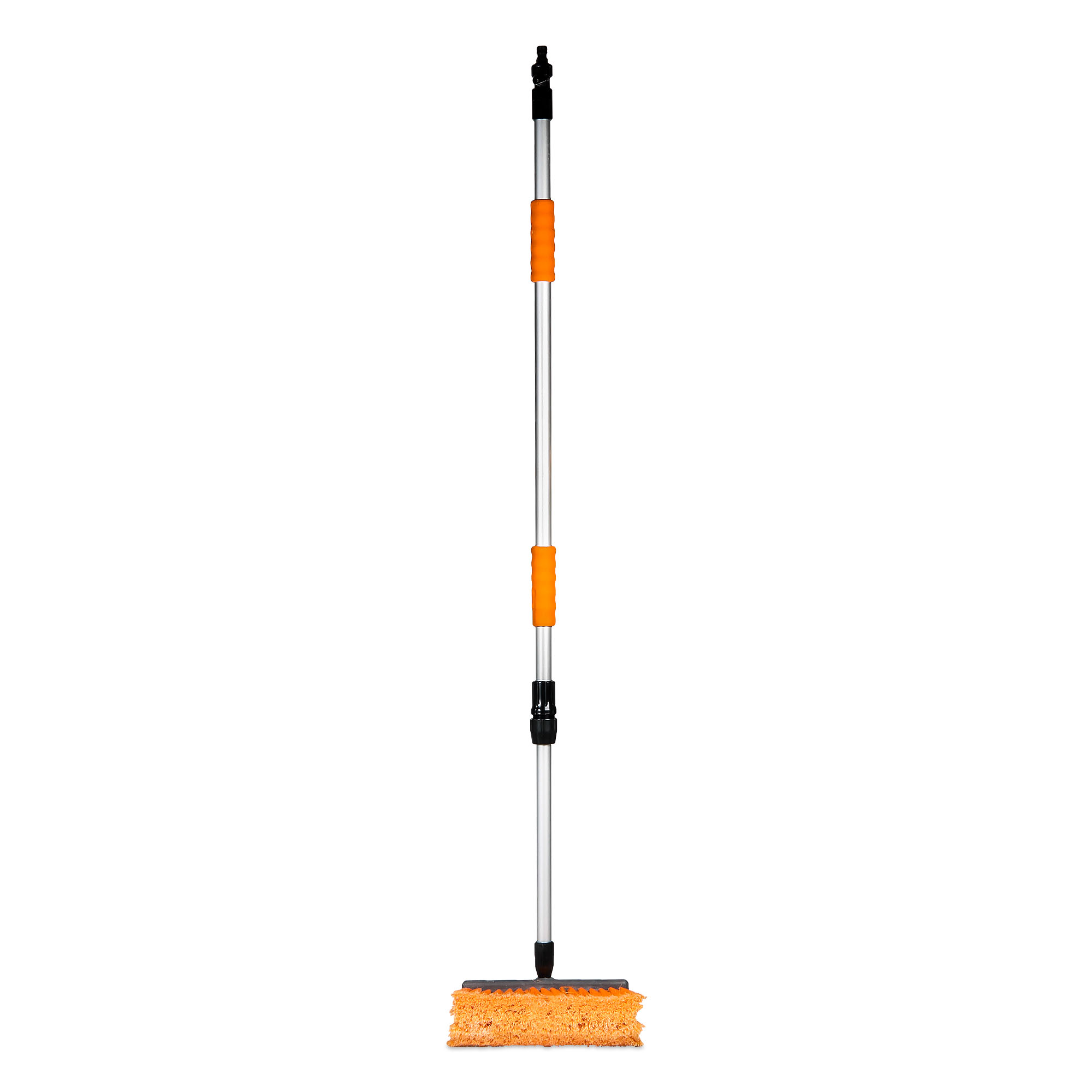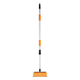 Швабра имеет телескопическую ручку с максимальной длиной 200 см (в сложенном виде мин длина 120 см), а также щетку для удаления пыли и грязи с плоских поверхностей. Щетка имеет пластмассовое основание шириной 25 см и мягкий распушенный ворс для деликатной уборки. Для более тщательной уборки предусмотрена возможность подключения шланга с водой. Рабочая поверхность щетки легко открепляется.