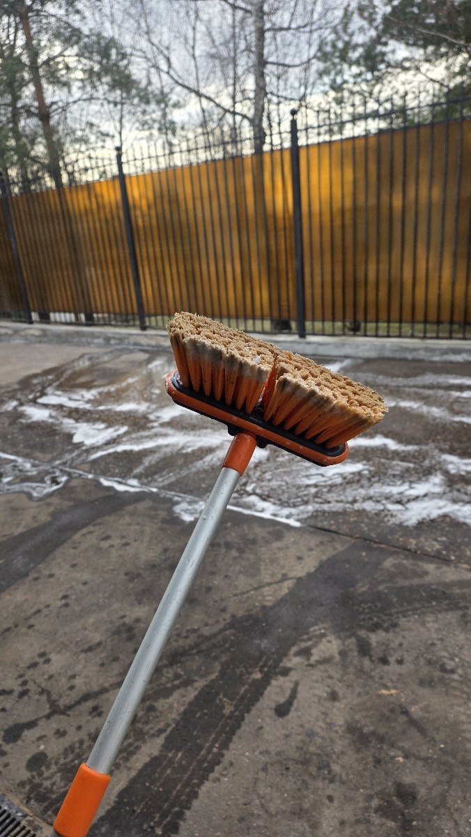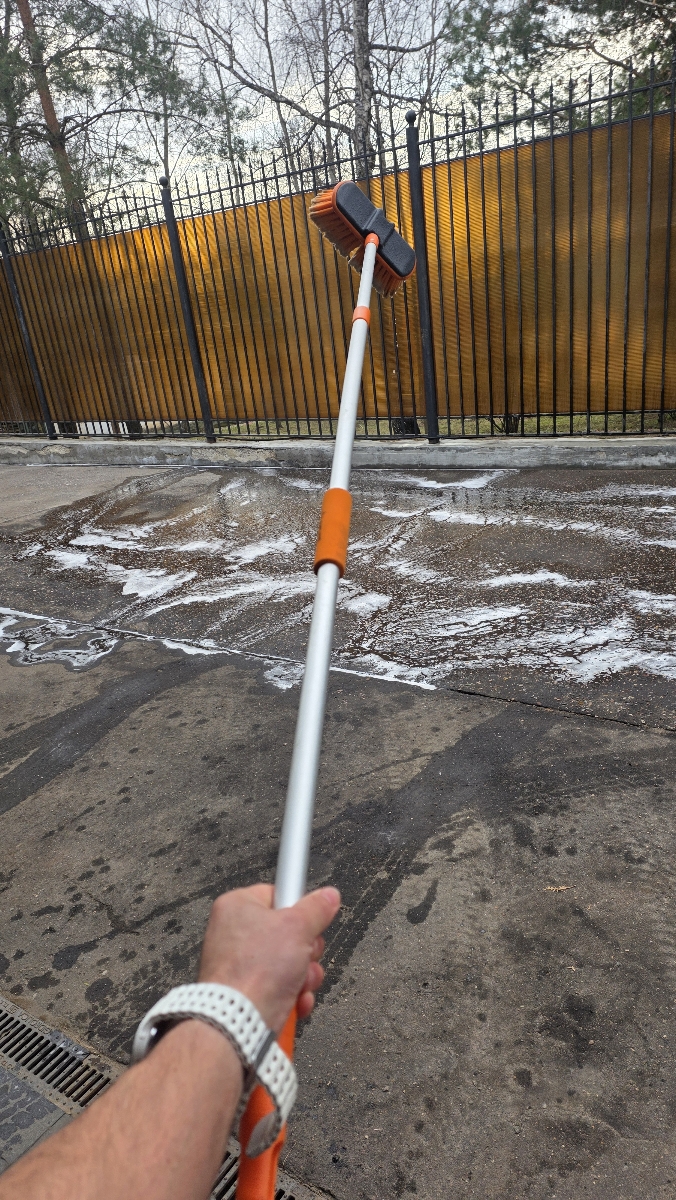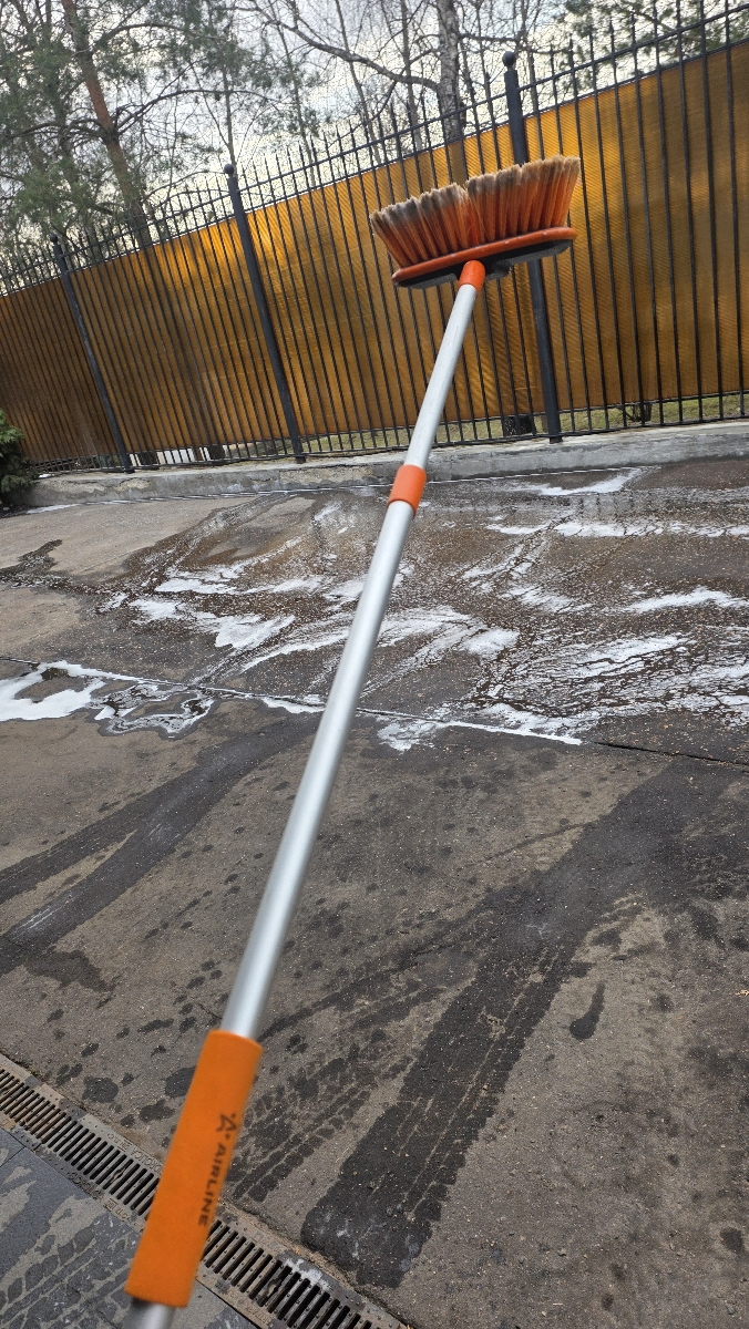 Швабра имеет телескопическую ручку с максимальной длиной 210 см (в сложенном виде мин длина 130 см), а также щетку для удаления пыли и грязи. Щетка имеет пластмассовое основание шириной 20 см и мягкий распушенный ворс для деликатной уборки. Рабочая поверхность щетки легко открепляется.