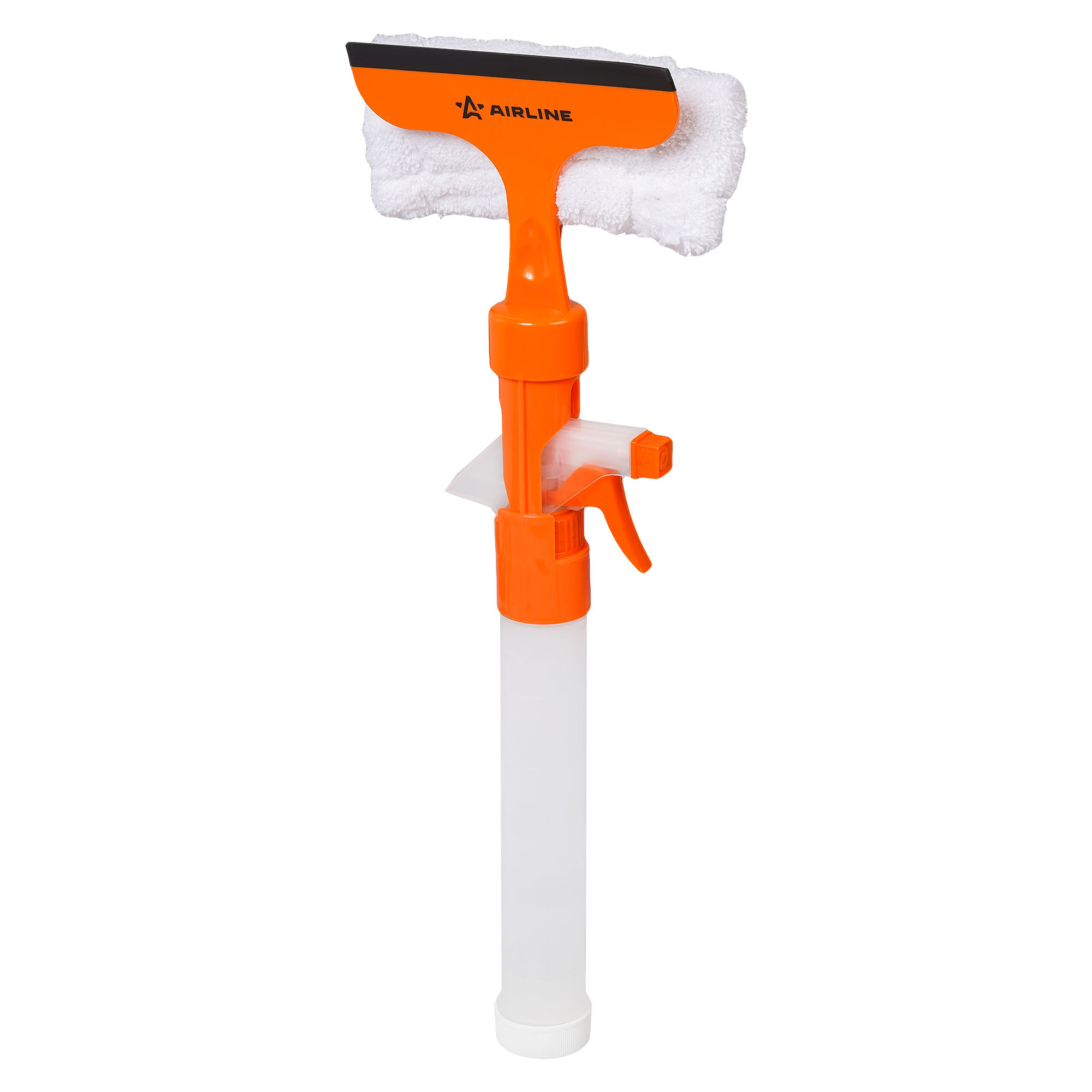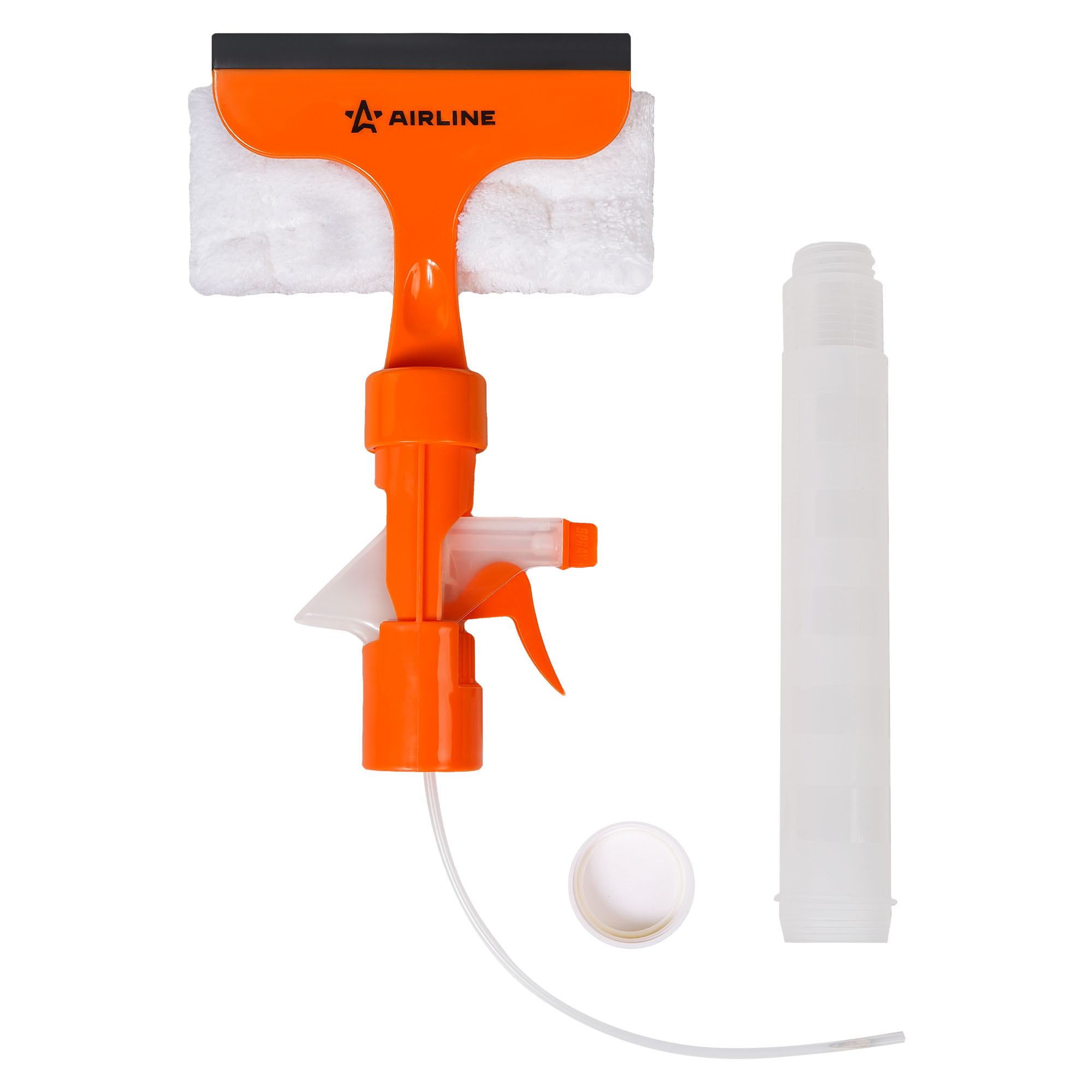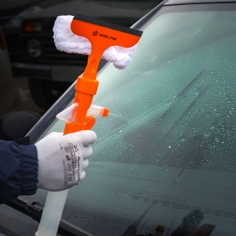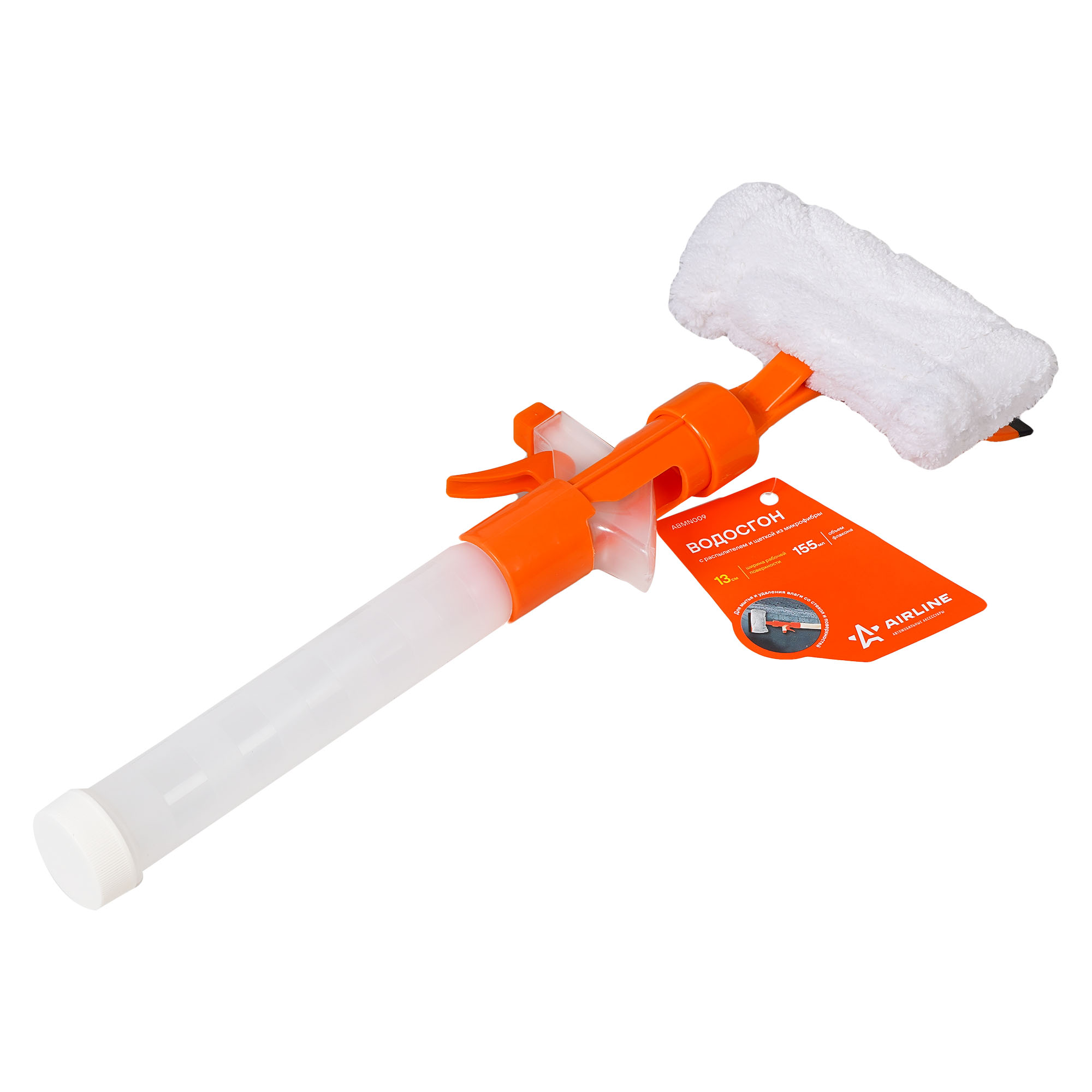 Водосгон представляет собой флакон объемом 155 мл с распылителем. Лезвие водосгона длиной 13 см выполнено из мягкой резины. Удобная насадка из мягкой микрофибры для вытирания.