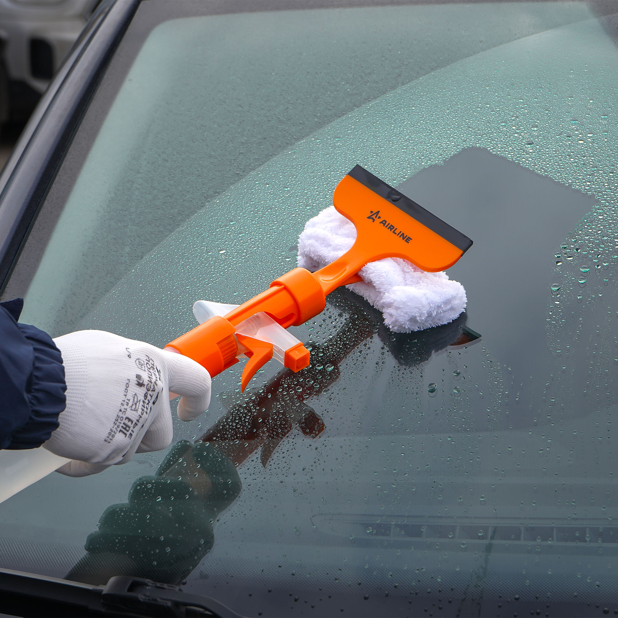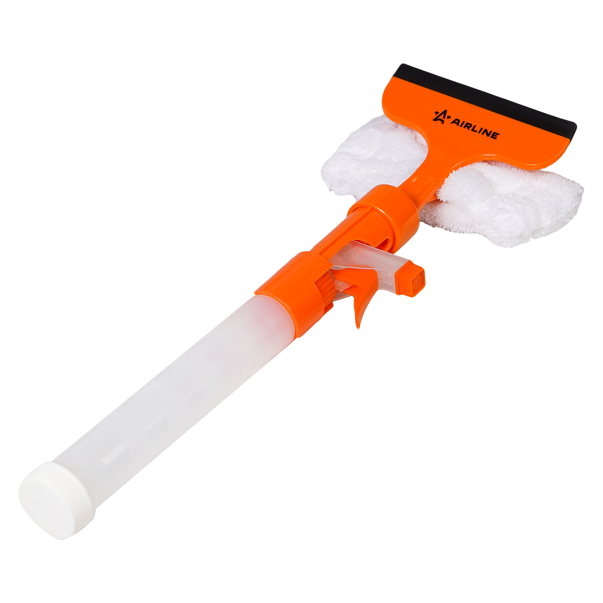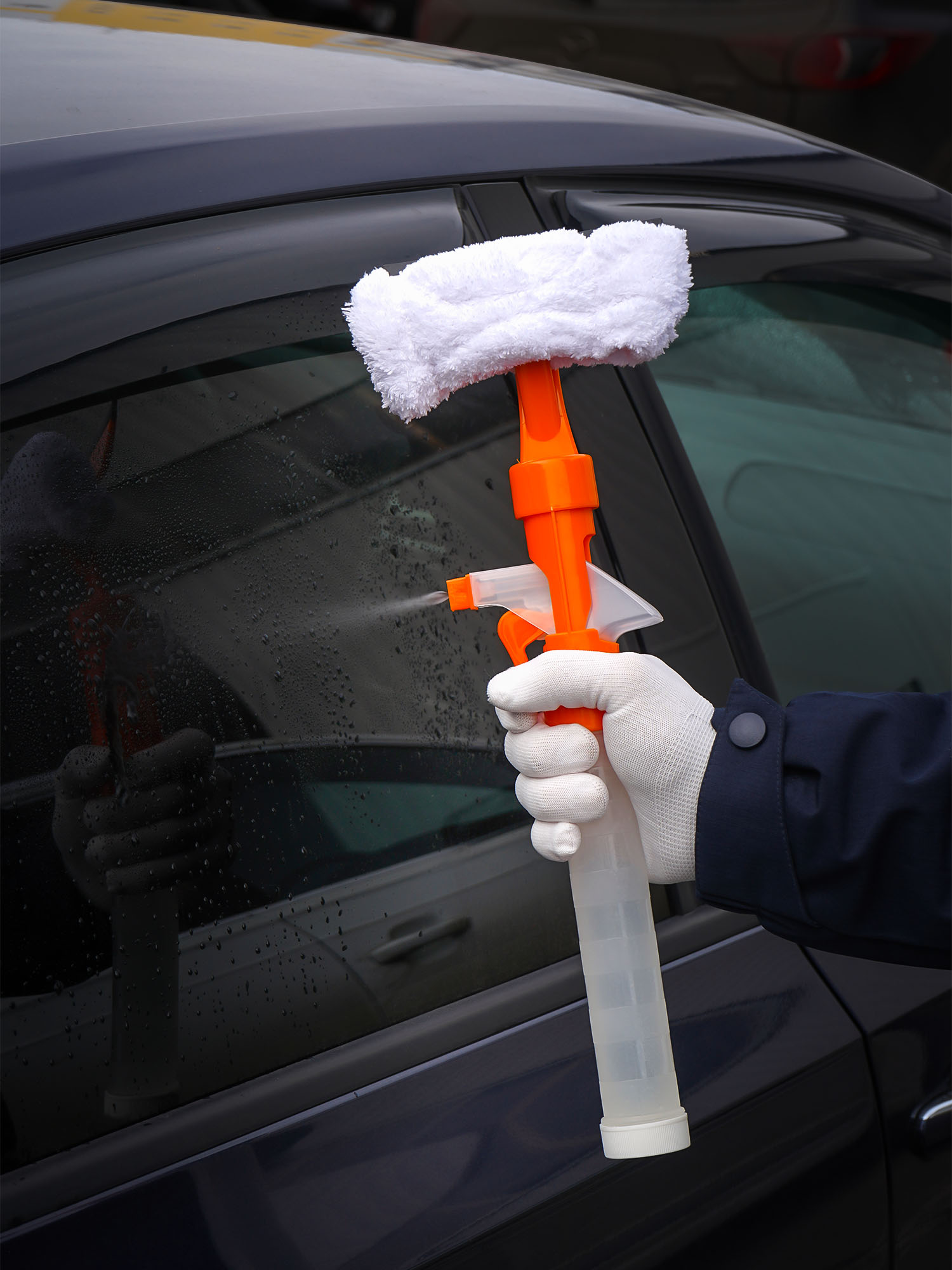 Водосгон представляет собой флакон объемом 155 мл с распылителем. Лезвие водосгона длиной 13 см выполнено из мягкой резины. Удобная насадка из мягкой микрофибры для вытирания.