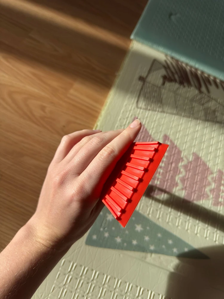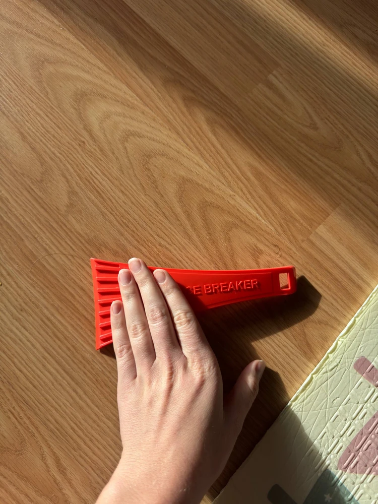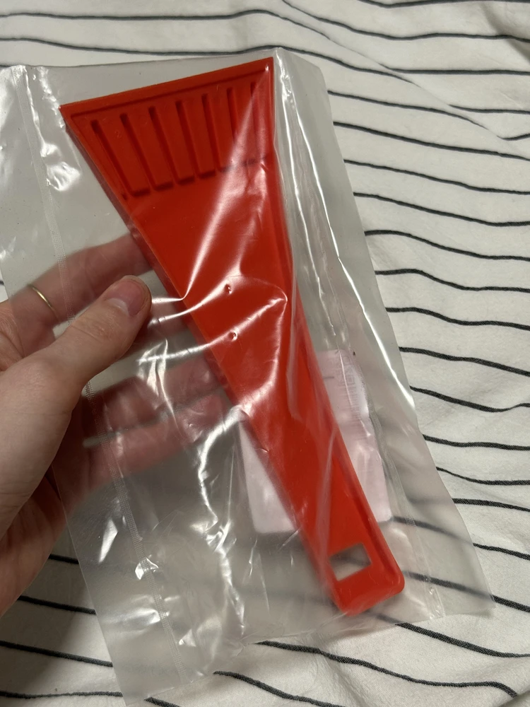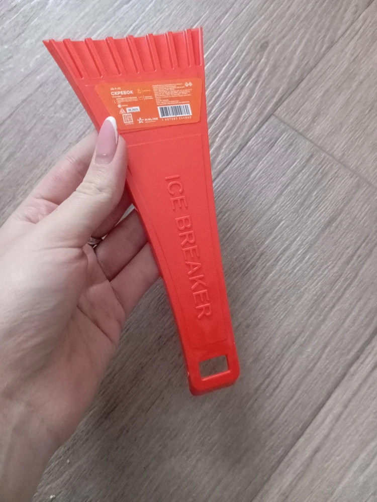 Скребок из морозостойкого пластика с простым и минималистичным дизайном. Рабочая поверхность скребка гладкая, а на верхней части поверхности расположен ребристый слой, помогающий тщательнее удалять лед с любых плоскостей.