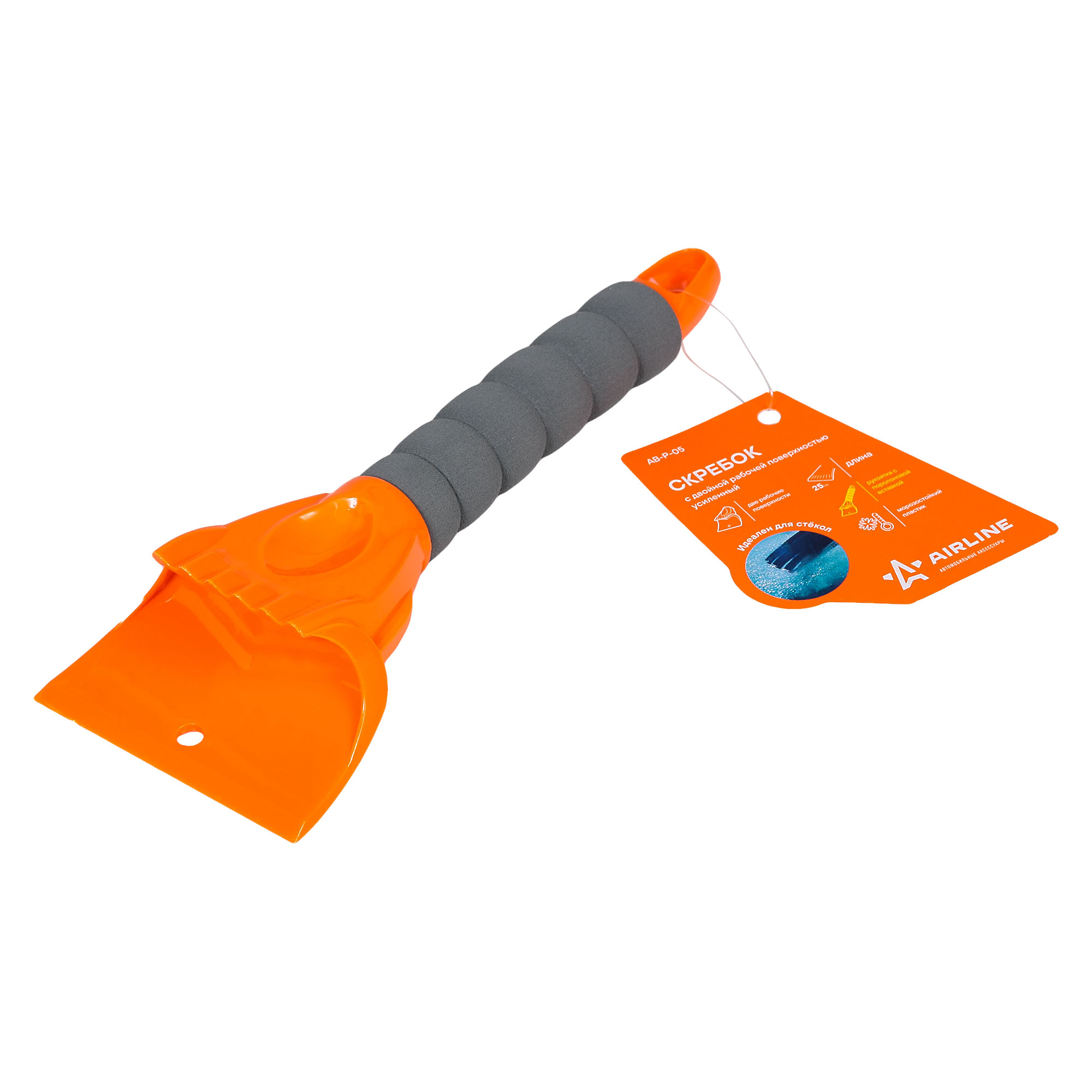 Самый мощный скребок AIRLINE! На рабочей поверхности изделия установлено два скребка: один с гладкой поверхностью, а второй – волнистой формы. Рукоятка изделия имеет эргономичную форму, что позволяет максимально эфеективно справляться даже со сложными оледенениями.