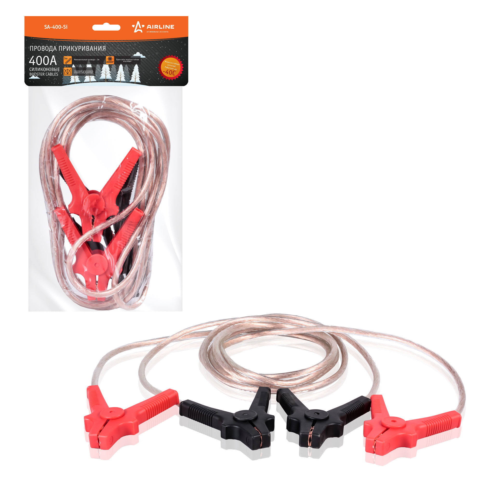 Основной задачей при разработке данных проводов прикуривания мы ставили сделать недорогое изделие, которое при сильном морозе (-40С) поможет завести автомобиль с севшей АКБ. При этом оплетка не потрескается и провод не развалится после первого использования. Мы сделали многожильный токонесущий кабель в силиконовой морозостойкой оплетке.Мы использовали простую, информативную и яркую упаковку, которая помогла существенно снизить цену.