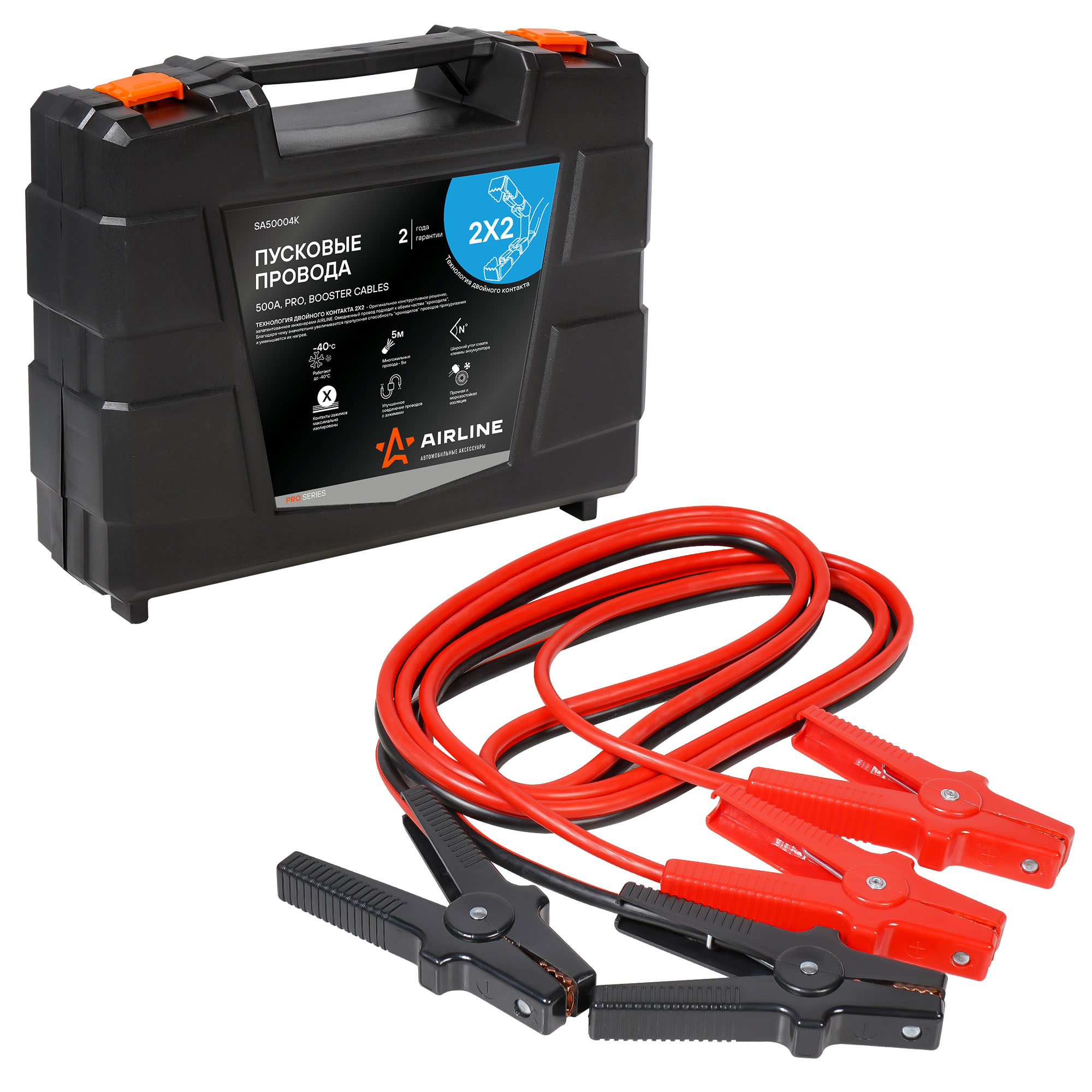 Провода прикуривания AIRLINE предназначены для запуска легковых автомобилей и грузовиков с севшей АКБ и даже при ее отсутствии (для легковых авто). Увеличенные зажимы с широким углом захвата позволяют с легкостью крепить провода на любой тип клемм аккумулятора. Провод и зажимы полностью заизолированы с «нерабочей» стороны, что исключает риск случайного замыкания контактов и вывода из строя электронной системы автомобиля. Технология двойного контакта, впервые примененная AIRLINE, позволяет вдвое снизить потери энергии на крокодилах и пропускать заявленный ток длительное время без ущерба проводам. Улучшенное соединение проводов с крокодилами и морозостойкая оплетка делает данные провода надежным помощником на много зим вперед.