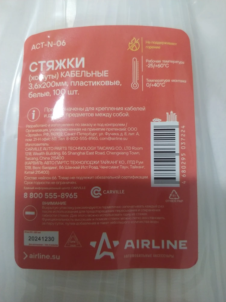 ВАЖНО ЗНАТЬ! При использовании нейлоновых стяжек следует принимать во внимание гигроскопичную природу самого нейлона, т.е. зависимость его свойств от влажности и способности как впитывать, так и терять влагу. В связи с этим, в тех случаях, когда вскрытая упаковка может быть использована через неопределенное время рекомендуется герметично запечатывать пакет для предотвращения пересыхания и сохранения гибкости стяжек. В любом случае, функциональность высохших и ломких стяжек может быть легко восстановлена путем добавления в пакет некоторого количества воды. Пересыхание также может быть вызвано не соблюдением условий их хранения. Для поддержания оптимальных характеристик нейлоновые стяжки должны храниться при температуре 23°С и относительной влажности 50%. После того, как кабельные стяжки уже установлены, они будут выполнять свою крепежную функцию вне зависимости от колебаний уровня влажности и температур.