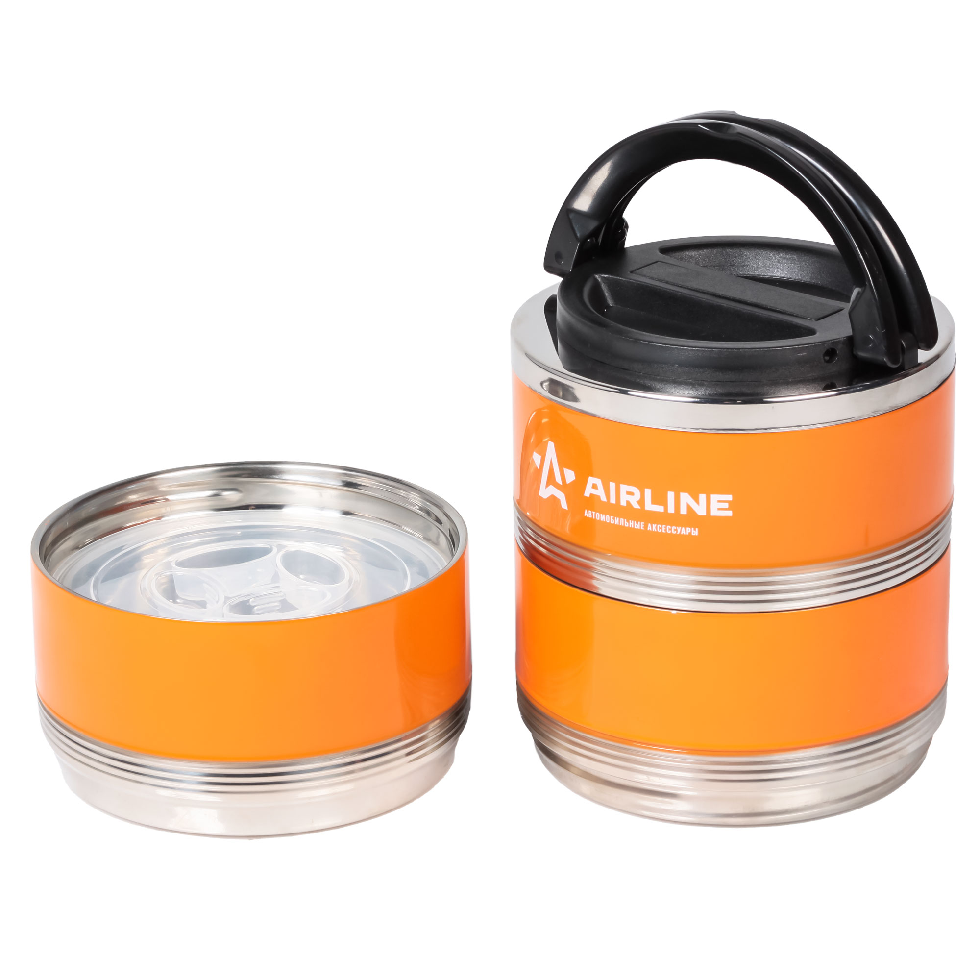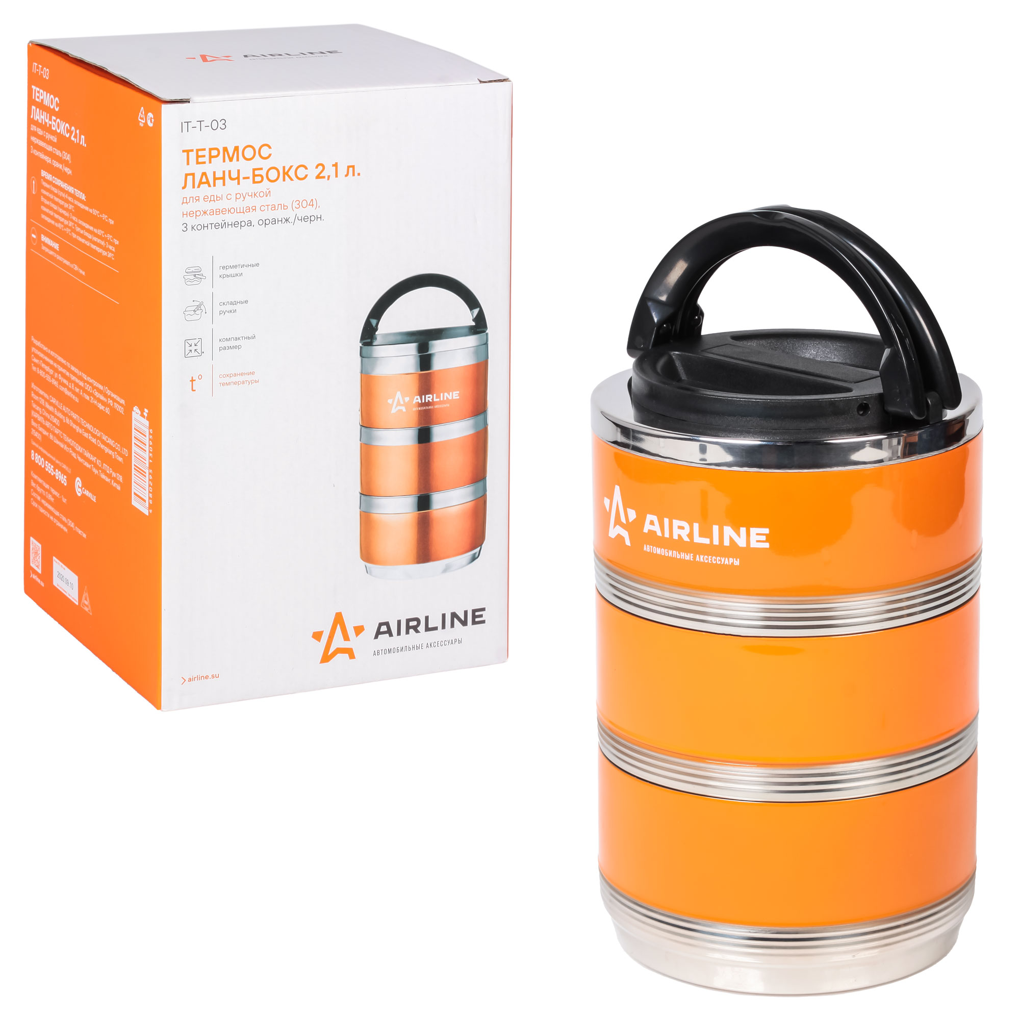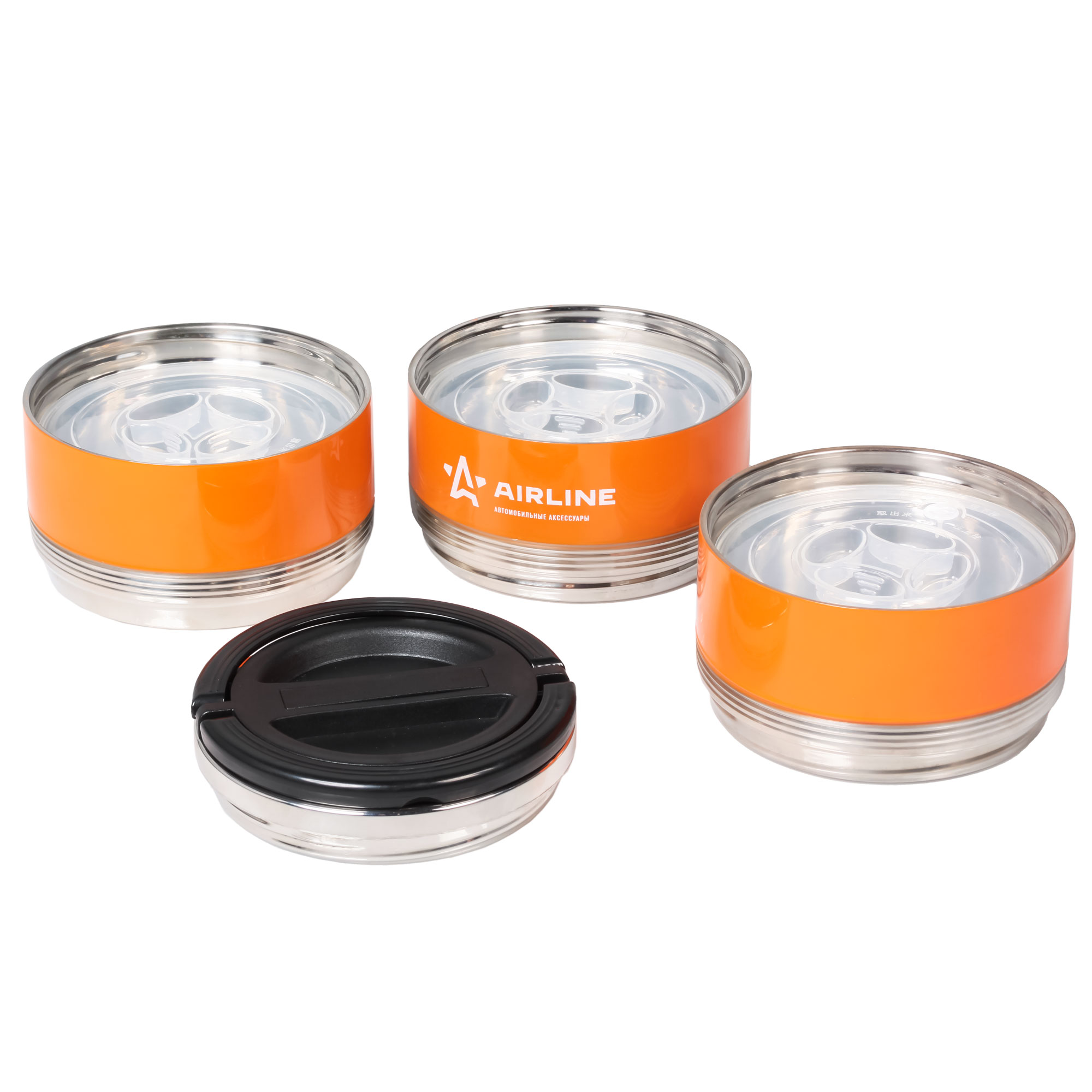 Представляет собой общую 2,1 литровую ёмкость из 304 нержавеющей стали с двойными стенками и герметичной теплоизолированной крышкой со складной ручкой. Бокс состоит из трех соединяемых между собой круглых контейнеров без горла, удобных для приема пищи. Контейнеры имеют пластиковые крышки оснащенные воздушным клапаном. Их так же можно использовать независимо друг от друга. Он отлично подходит для одновременного хранения различного рода еды. Например: первые, вторые и третьи блюда. Боксы будут полезны в домашнем быту, на работе и незаменим в дальних поездках. Первые блюда (супы)-4 часа, охлаждение на 50С +-5С, при комнатной температуре 24С.