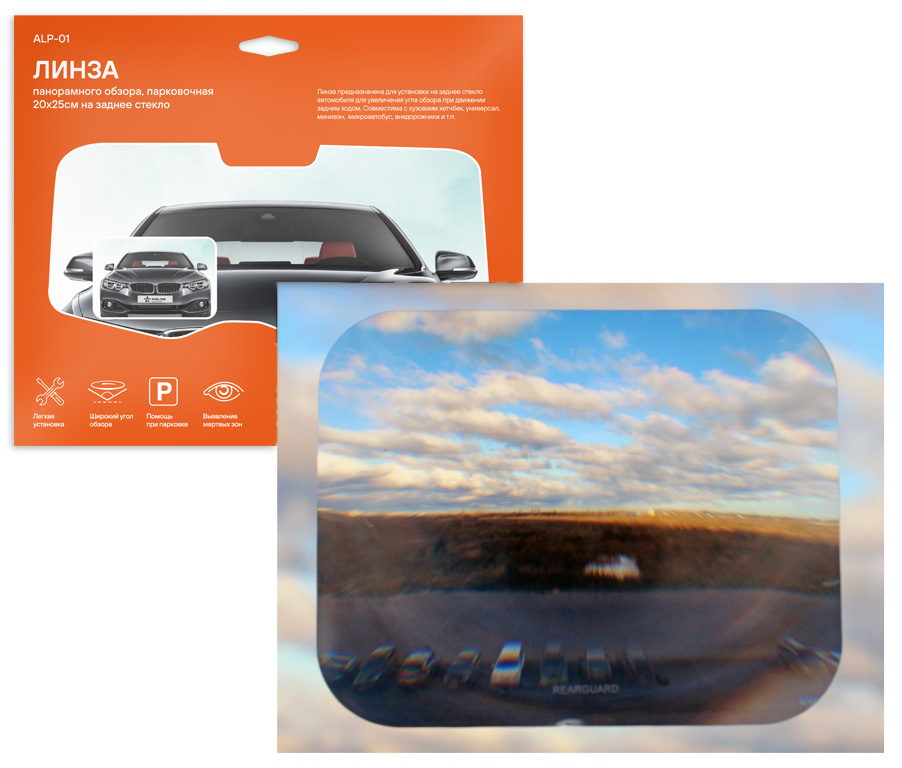 Линза панорамного обзора, парковочная - известна, как линза Френеля. Предназначена для установки на заднее стекло автомобиля с кузовами хэтчбек, универсал, минивэн, микроавтобус, джипы. За счет своей формы увеличивает угол обзора и позволяет увидеть детей, животных, различные мелкие предметы, такие как парковочные грибки, столбики в мертвых зонах, обычно не видимых в зеркало заднего вида. Линза является отличным помощником при парковке задним ходом, она позволяет увидеть габариты автомобиля и подъехать к препятствию как можно ближе.